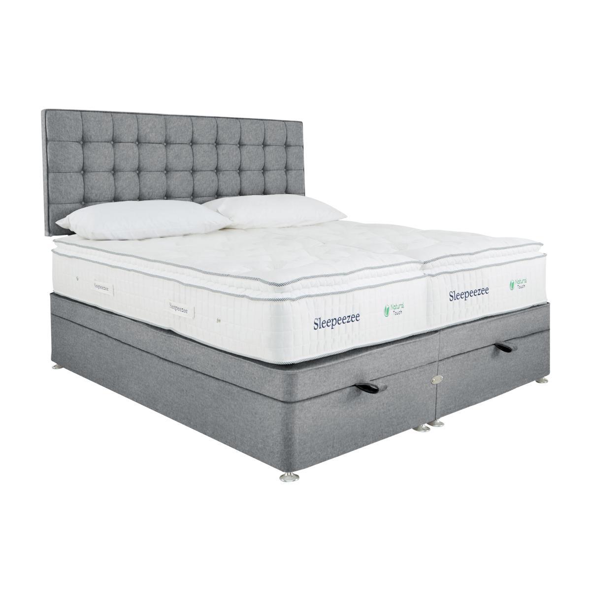 Sometimes, nature knows best. That’s why Sleepeezee has harnessed the power of nature’s finest materials in its new Natural Touch 2000 Pillowtop range. Two generous layers of British wool keep you cool in summer and warm in winter, while a natural damask cover offers impressive breathability. But it’s the way its 2000 pocket springs respond to your body’s every movement, that makes this range so comfortable. You always feel supported, and the result is a deeply restful night’s sleep every day of the week. It comes in a stylish traditional divan that’s compatible with all of Sleepeezee’s headboards, so you can really make it your own. It’s also available in a zip and link design which can be joined and separated, so it’s easy to rotate and fit through the narrowest of staircases. Handmade in the UK exclusively for Furniture Village, this is long-lasting natural comfort at its best. Great sleep and storage in a space-savvy design. That’s why we love this Sleepeezee zip and link ottoman divan set. Handmade in the UK with a luxury pillowtop, it unzips in two halves to get through awkward doorways and narrow staircases. Why you'll love it. A natural pocket sprung mattress by Sleepeezee. Zip and link design for more manageable rotation and easy room access. Luxurious pillowtop for a deeper night’s sleep. 2000 pocket springs offer superior total-body support. Stay warm in winter and cool in summer with two layers of British wool. Breathable chemical-free damask cover. Traditional divan base in a wide choice of colours. Easy to access, end-lift ottoman storage. Create your perfect look. Compatible with all Sleepeezee headboards. Handmade in the UK exclusively for Furniture Village. What you need to know. Headboard shown is available separately. Mattress type: Pocket spring. Depth: 34cm. Firmness: Medium feel. Springs: 2000 pocket springs in king size. Pillowtop: Yes. Fillings: British wool, pocket springs, Superbond foam. Borders: Standard tape edge with carry handles. Edge support: Yes. Cover: 100% natural viscose. Requires turning: Rotating only due to pillowtop. Base type: Platform top. Sizes: Available only as super king. Mattress care: Air for 4 hours before using to remove any odour. Indentations caused by settlement of fillings or body weight are normal and are not considered defects. If used on a slatted bed frame, slats must be no more than 7 cm apart. Rotate regularly. We recommend the use of a mattress protector. Super king divan bases are delivered in two pieces for ease of delivery.