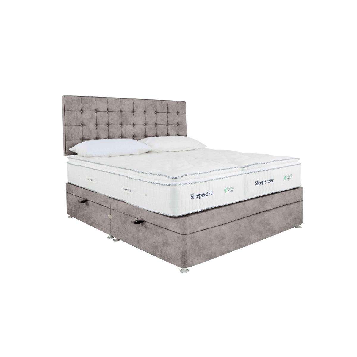 Sometimes, nature knows best. That’s why Sleepeezee has harnessed the power of nature’s finest materials in its new Natural Touch 2000 Pillowtop range. Two generous layers of British wool keep you cool in summer and warm in winter, while a natural damask cover offers impressive breathability. But it’s the way its 2000 pocket springs respond to your body’s every movement, that makes this range so comfortable. You always feel supported, and the result is a deeply restful night’s sleep every day of the week. It comes in a stylish traditional divan that’s compatible with all of Sleepeezee’s headboards, so you can really make it your own. It’s also available in a zip and link design which can be joined and separated, so it’s easy to rotate and fit through the narrowest of staircases. Handmade in the UK exclusively for Furniture Village, this is long-lasting natural comfort at its best. This Sleepeezee zip and link ottoman divan set brings together great design and nature’s finest materials. Enjoy underbed storage and a deeply comfortable mattress that unzips into two halves – ideal for manoeuvring through tricky doorways. Why you'll love it A natural pocket sprung mattress by Sleepeezee. Zip and link design for more manageable rotation and easy room access. Luxurious pillowtop for a deeper night’s sleep. 2000 pocket springs offer superior total-body support. Stay warm in winter and cool in summer with two layers of British wool. Breathable chemical-free damask cover. Traditional divan base in a wide choice of colours. Easy to access, side-lift ottoman storage. Create your perfect look. Compatible with all Sleepeezee headboards. Handmade in the UK exclusively for Furniture Village. What you need to know Headboard shown is available separately. Mattress type: Pocket spring. Depth: 34cm. Firmness: Medium feel. Springs: 2000 pocket springs in king size. Pillowtop:Yes. Fillings: British wool, pocket springs, Superbond foam. Borders: Standard tape edge with carry handles. Edge support: Yes Cover: 100% natural viscose. Requires turning: Rotating only due to pillowtop. Base type: Platform top. Sizes: Available only as super king. Mattress care:Air for 4 hours before using to remove any odour. Indentations caused by settlement of fillings or body weight are normal and are not considered defects. If used on a slatted bed frame, slats must be no more than 7 cm apart. Rotate regularly. We recommend the use of a mattress protector. Super king divan bases are delivered in two pieces for ease of delivery.