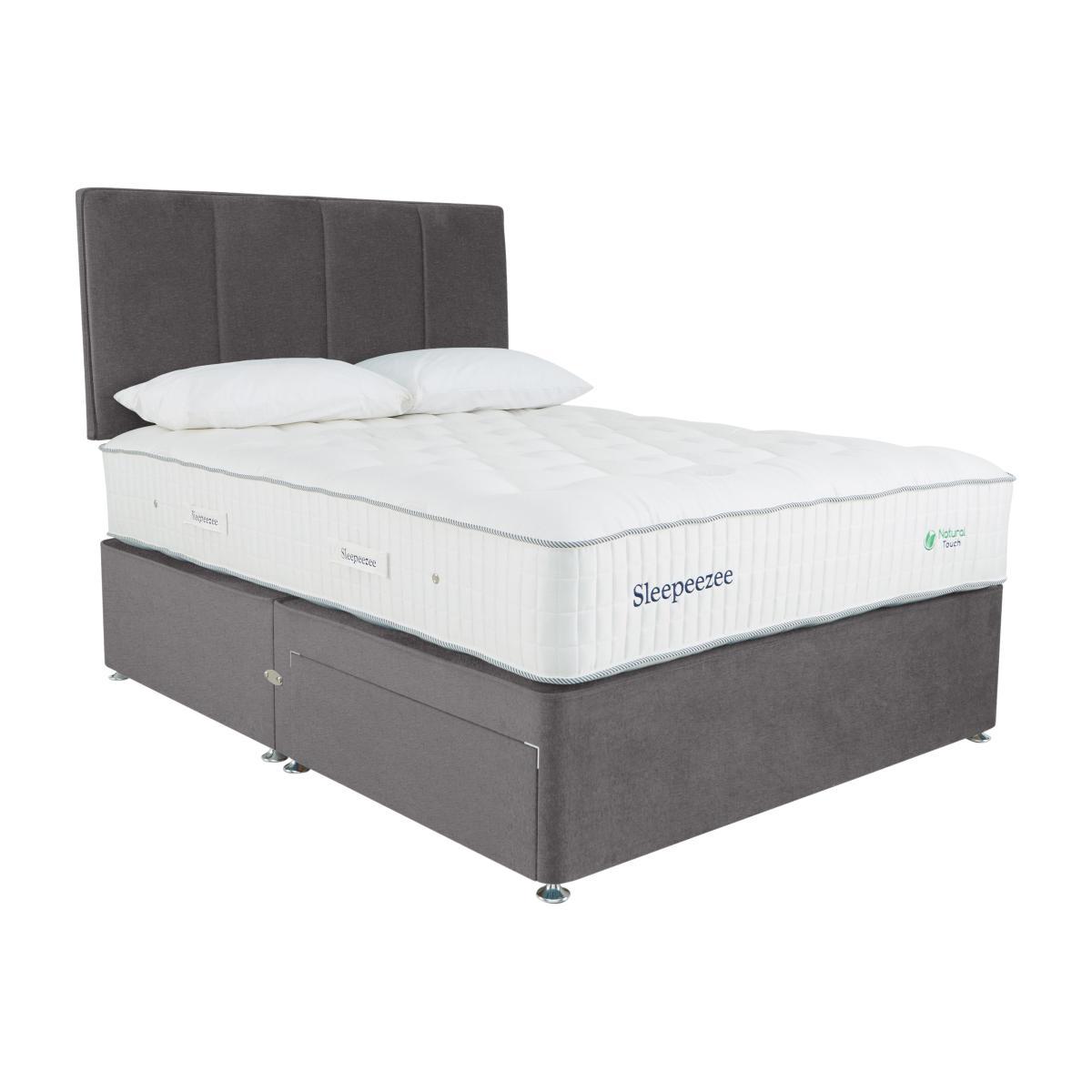 This natural pocket spring divan set by Sleepeezee boasts four generous layers of British wool, so you’re cosy when it’s cold, and cool when it’s warm. Plus, 3000 pocket springs provide pressure- relieving support all night long. Why you'll love it One of Sleepeezee’s finest natural pocket spring mattresses. 3000 pocket springs offer impressive total- body support. Four layers of British wool for all- seasons temperature regulation. Breathable chemical- free damask cover. Traditional divan base in a wide choice of colours. Also available with ottoman storage. Create your perfect look. Compatible with all Sleepeezee headboards. Handcrafted in the UK exclusively for Furniture Village. What you need to know Headboard shown is available separately. Mattress type: Pocket spring. Depth: 34cm. Firmness: Medium feel. Springs: 3000 pocket springs in king size. Pillowtop: No. Fillings: British wool, pocket springs, Superbond foam, Softech. Borders: Standard tape edge with carry handles. Edge support: Yes Cover: 100% natural viscose. Requires turning: Yes. Base type: Platform top. Sizes: Single, double, king, super king. Mattress care:Air for 4 hours before using to remove any odour. Indentations caused by settlement of fillings or body weight are normal and are not considered defects. If used on a slatted bed frame, slats must be no more than 7 cm apart. Rotate regularly. We recommend the use of a mattress protector. Double, king and super king divan bases are delivered in two pieces for ease of delivery.
