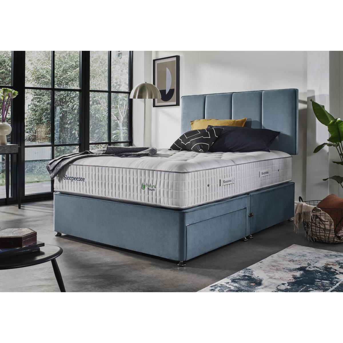 This natural pocket spring divan set by Sleepeezee boasts four generous layers of British wool, so you’re cosy when it’s cold, and cool when it’s warm. Plus, 3000 pocket springs provide pressure-relieving support all night long. Why you'll love it One of Sleepeezee’s finest natural pocket spring mattresses. 3000 pocket springs offer impressive total-body support. Four layers of British wool for all-seasons temperature regulation. Breathable chemical-free damask cover. Traditional divan base in a wide choice of colours. Also available with ottoman storage. Create your perfect look. Compatible with all Sleepeezee headboards. Handcrafted in the UK exclusively for Furniture Village. What you need to know Headboard shown is available separately. Mattress type: Pocket spring. Depth: 34cm. Firmness: Medium feel. Springs: 3000 pocket springs in king size. Pillowtop: No. Fillings: British wool, pocket springs, Superbond foam, Softech. Borders: Standard tape edge with carry handles. Edge support: Yes Cover: 100% natural viscose. Requires turning: Yes. Base type: Platform top. Sizes: Single, double, king, super king. Mattress care:Air for 4 hours before using to remove any odour. Indentations caused by settlement of fillings or body weight are normal and are not considered defects. If used on a slatted bed frame, slats must be no more than 7 cm apart. Rotate regularly. We recommend the use of a mattress protector. Double, king and super king divan bases are delivered in two pieces for ease of delivery.