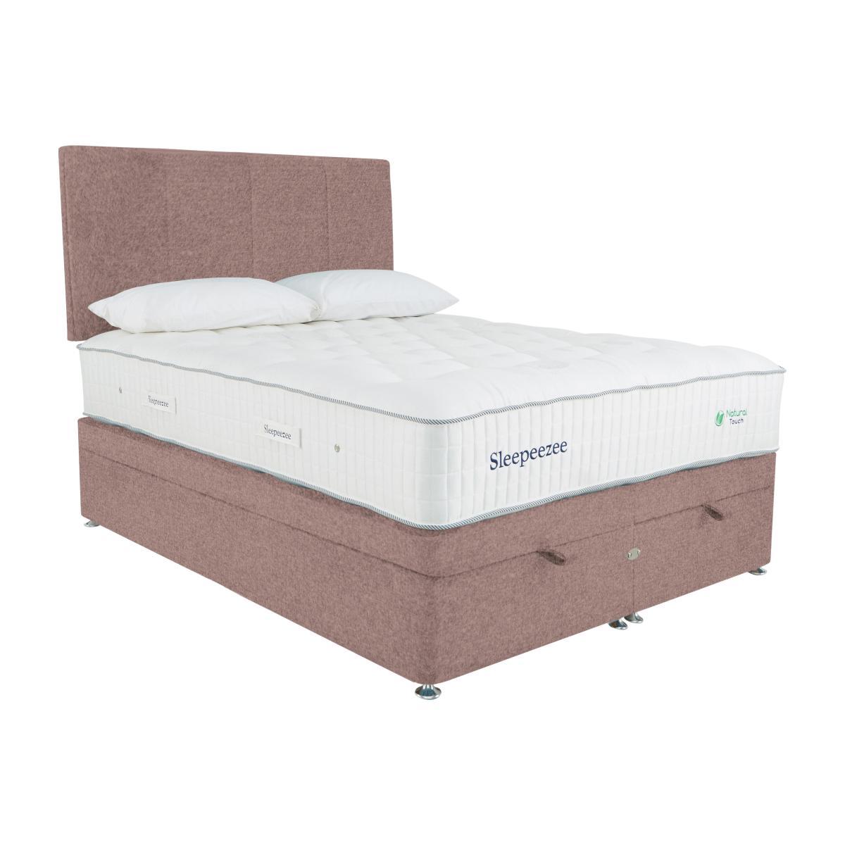 Beautifully handcrafted right here in the UK, this Sleepeezee natural pocket spring ottoman divan set is the perfect choice for those who want a great night’s sleep and extra storage space. Why you'll love it. One of Sleepeezee’s finest natural pocket spring mattresses. 3000 pocket springs offer impressive total-body support. Four layers of British wool for all-seasons temperature regulation. Breathable chemical-free damask cover. Traditional divan base in a wide choice of colours. Easy to access, end-lift ottoman storage. Create your perfect look. Compatible with all Sleepeezee headboards. Handcrafted in the UK exclusively for Furniture Village. What you need to know. Headboard shown is available separately. Mattress type: Pocket spring. Depth: 34cm. Firmness: Medium feel. Springs: 2000 pocket springs in king size. Pillowtop: No. Fillings: British wool, pocket springs, Superbond foam. Borders: Standard tape edge with carry handles. Edge support: Yes. Cover: 100% natural viscose. Requires turning: Yes. Base type: Platform top. Sizes: Single, double, king, super king. Mattress care: Air for 4 hours before using to remove any odour. Indentations caused by settlement of fillings or body weight are normal and are not considered defects. If used on a slatted bed frame, slats must be no more than 7 cm apart. Rotate regularly. We recommend the use of a mattress protector. Please take care when opening and closing the ottoman. Double, king and super king divan bases are delivered in two pieces for ease of delivery.