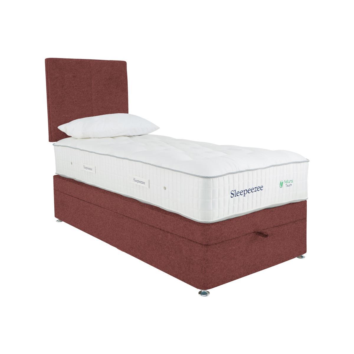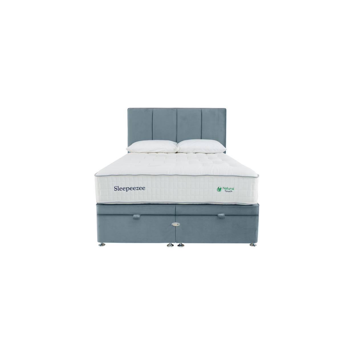 Beautifully handcrafted right here in the UK, this Sleepeezee natural pocket spring ottoman divan set is the perfect choice for those who want a great night’s sleep and extra storage space. Why you'll love it. One of Sleepeezee’s finest natural pocket spring mattresses. 3000 pocket springs offer impressive total-body support. Four layers of British wool for all-seasons temperature regulation. Breathable chemical-free damask cover. Traditional divan base in a wide choice of colours. Easy to access, end-lift ottoman storage. Create your perfect look. Compatible with all Sleepeezee headboards. Handcrafted in the UK exclusively for Furniture Village. What you need to know. Headboard shown is available separately. Mattress type: Pocket spring. Depth: 34cm. Firmness: Medium feel. Springs: 2000 pocket springs in king size. Pillowtop: No. Fillings: British wool, pocket springs, Superbond foam. Borders: Standard tape edge with carry handles. Edge support: Yes. Cover: 100% natural viscose. Requires turning: Yes. Base type: Platform top. Sizes: Single, double, king, super king. Mattress care: Air for 4 hours before using to remove any odour. Indentations caused by settlement of fillings or body weight are normal and are not considered defects. If used on a slatted bed frame, slats must be no more than 7 cm apart. Rotate regularly. We recommend the use of a mattress protector. Please take care when opening and closing the ottoman. Double, king and super king divan bases are delivered in two pieces for ease of delivery.