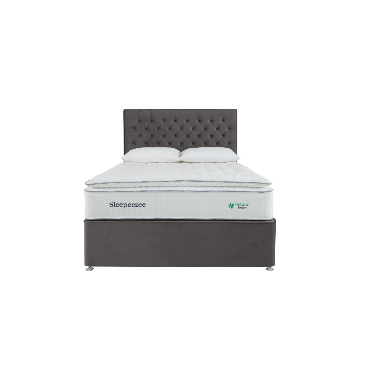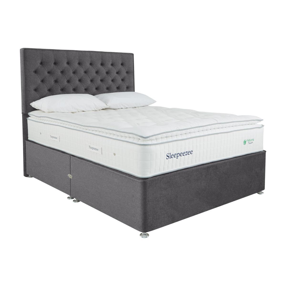 This Sleepeezee natural pocket sprung pillowtop divan set is simply beautiful. With 3000 pocket springs, three layers of British wool and a traditional divan, it has everything you need to enjoy a deeply restful – and stylish – night’s sleep. Why you'll love it. A natural pocket spring pillowtop divan set by British bedmaker, Sleepeezee. Luxury pillowtop design for deeply supportive comfort. 3000 pocket springs for pressure-relieving support. Three layers of British wool for enhanced temperature regulation. Breathable chemical-free damask cover. Traditional divan base in a wide choice of colours. Also available with ottoman storage. Create your perfect look. Compatible with all Sleepeezee headboards. Handcrafted in the UK exclusively for Furniture Village. What you need to know. Headboard shown is available separately. Mattress type: Pocket spring. Depth: 34cm. Firmness: Medium feel. Springs: 3000 pocket springs in king size. Pillowtop: Yes. Fillings: British wool, pocket springs, Superbond foam, Softech. Borders: Standard tape edge with carry handles. Edge support: Yes. Cover: 100% natural viscose. Requires turning: Rotating only due to pillowtop. Base type: Platform top. Sizes: Single, double, king, super king. Mattress care: Air for 4 hours before using to remove any odour. Indentations caused by settlement of fillings or body weight are normal and are not considered defects. If used on a slatted bed frame, slats must be no more than 7 cm apart. Rotate regularly. We recommend the use of a mattress protector. Double, king and super king divan bases are delivered in two pieces for ease of delivery.