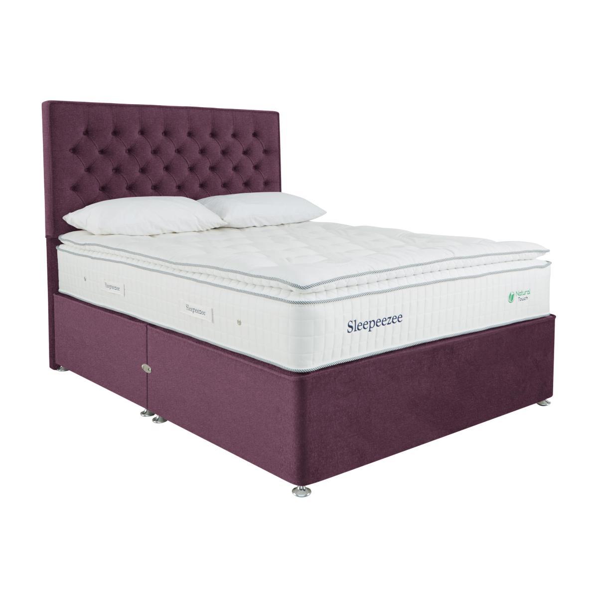 This Sleepeezee natural pocket sprung pillowtop divan set is simply beautiful. With 3000 pocket springs, three layers of British wool and a traditional divan, it has everything you need to enjoy a deeply restful – and stylish – night’s sleep. Why you'll love it. A natural pocket spring pillowtop divan set by British bedmaker, Sleepeezee. Luxury pillowtop design for deeply supportive comfort. 3000 pocket springs for pressure-relieving support. Three layers of British wool for enhanced temperature regulation. Breathable chemical-free damask cover. Traditional divan base in a wide choice of colours. Also available with ottoman storage. Create your perfect look. Compatible with all Sleepeezee headboards. Handcrafted in the UK exclusively for Furniture Village. What you need to know. Headboard shown is available separately. Mattress type: Pocket spring. Depth: 34cm. Firmness: Medium feel. Springs: 3000 pocket springs in king size. Pillowtop: Yes. Fillings: British wool, pocket springs, Superbond foam, Softech. Borders: Standard tape edge with carry handles. Edge support: Yes. Cover: 100% natural viscose. Requires turning: Rotating only due to pillowtop. Base type: Platform top. Sizes: Single, double, king, super king. Mattress care: Air for 4 hours before using to remove any odour. Indentations caused by settlement of fillings or body weight are normal and are not considered defects. If used on a slatted bed frame, slats must be no more than 7 cm apart. Rotate regularly. We recommend the use of a mattress protector. Double, king and super king divan bases are delivered in two pieces for ease of delivery.