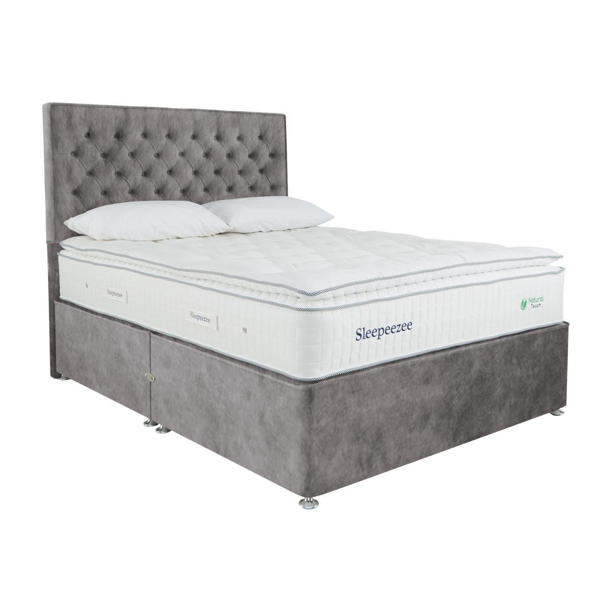 This Sleepeezee natural pocket sprung pillowtop divan set is simply beautiful. With 3000 pocket springs, three layers of British wool and a traditional divan, it has everything you need to enjoy a deeply restful – and stylish – night’s sleep. Why you'll love it. A natural pocket spring pillowtop divan set by British bedmaker, Sleepeezee. Luxury pillowtop design for deeply supportive comfort. 3000 pocket springs for pressure-relieving support. Three layers of British wool for enhanced temperature regulation. Breathable chemical-free damask cover. Traditional divan base in a wide choice of colours. Also available with ottoman storage. Create your perfect look. Compatible with all Sleepeezee headboards. Handcrafted in the UK exclusively for Furniture Village. What you need to know. Headboard shown is available separately. Mattress type: Pocket spring. Depth: 34cm. Firmness: Medium feel. Springs: 3000 pocket springs in king size. Pillowtop: Yes. Fillings: British wool, pocket springs, Superbond foam, Softech. Borders: Standard tape edge with carry handles. Edge support: Yes. Cover: 100% natural viscose. Requires turning: Rotating only due to pillowtop. Base type: Platform top. Sizes: Single, double, king, super king. Mattress care: Air for 4 hours before using to remove any odour. Indentations caused by settlement of fillings or body weight are normal and are not considered defects. If used on a slatted bed frame, slats must be no more than 7 cm apart. Rotate regularly. We recommend the use of a mattress protector. Double, king and super king divan bases are delivered in two pieces for ease of delivery.