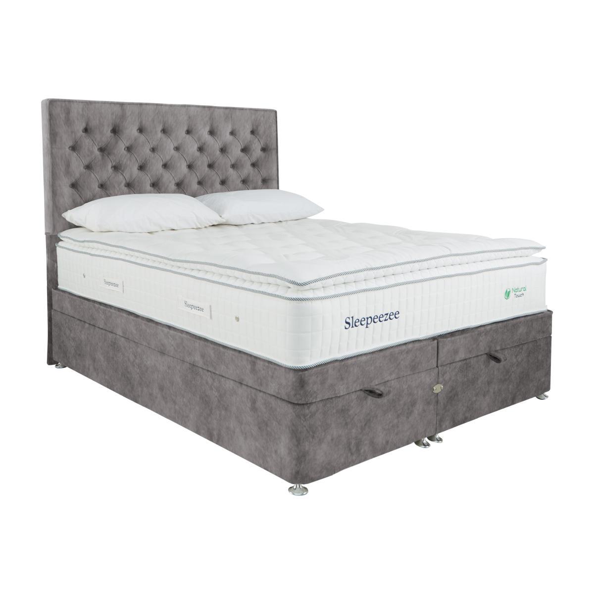 Designed for optimum sleep comfort, this Sleepeezee ottoman divan set pairs 3000 pocket springs with three sumptuous layers of British wool for an incredibly responsive sleep surface. The extra storage is just an added bonus. Why you'll love it A natural pocket spring pillowtop divan set by British bedmaker, Sleepeezee. Luxury pillowtop design for deeply supportive comfort. 3000 pocket springs for pressure- relieving support. Three layers of British wool for enhanced temperature regulation. Breathable chemical- free damask cover. Traditional divan base in a wide choice of colours. Easy access end- lift ottoman storage compartment. Create your perfect look. Compatible with all Sleepeezee headboards. Handcrafted in the UK exclusively for Furniture Village. What you need to know Headboard shown is available separately. Mattress type: Pocket spring. Depth: 34cm. Firmness: Medium feel. Springs: 2000 pocket springs in king size. Pillowtop:Yes. Fillings: British wool, pocket springs, Superbond foam. Borders: Standard tape edge with carry handles. Edge support: Yes. Cover: 100% natural viscose. Requires turning: Rotating only due to pillowtop. Base type: Platform top. Sizes: Single, double, king, super king. Mattress care:Air for 4 hours before using to remove any odour. Indentations caused by settlement of fillings or body weight are normal and are not considered defects. If used on a slatted bed frame, slats must be no more than 7 cm apart. Rotate regularly. We recommend the use of a mattress protector. Please take care when opening and closing the ottoman. Double, king and super king divan bases are delivered in two pieces for ease of delivery.