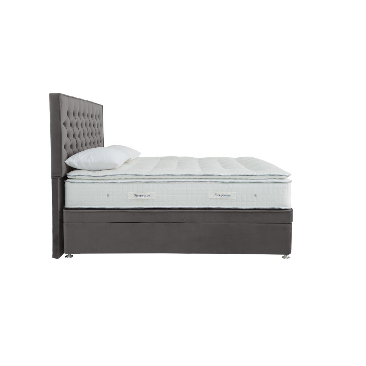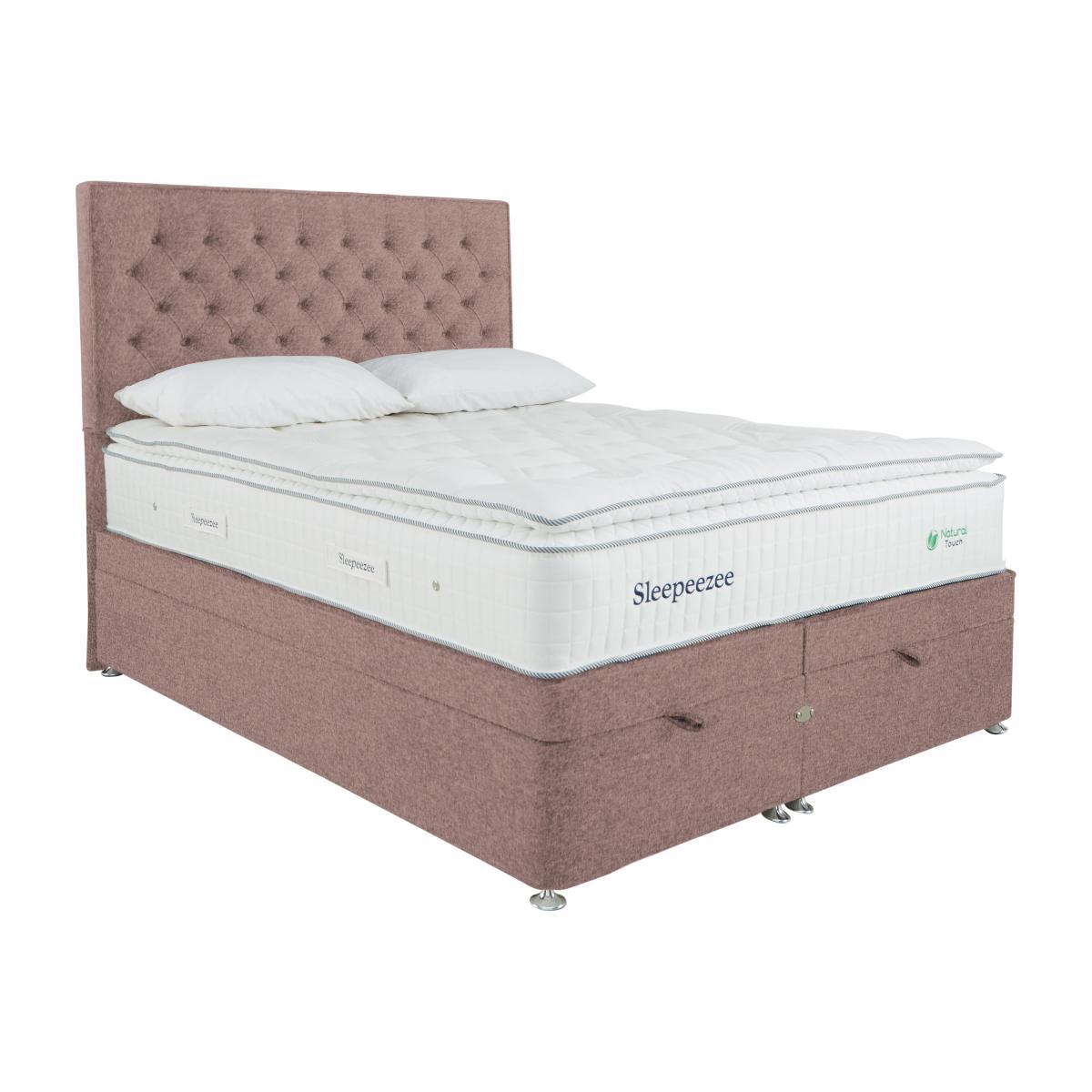 Designed for optimum sleep comfort, this Sleepeezee ottoman divan set pairs 3000 pocket springs with three sumptuous layers of British wool for an incredibly responsive sleep surface. The extra storage is just an added bonus. Why you'll love it A natural pocket spring pillowtop divan set by British bedmaker, Sleepeezee. Luxury pillowtop design for deeply supportive comfort. 3000 pocket springs for pressure- relieving support. Three layers of British wool for enhanced temperature regulation. Breathable chemical- free damask cover. Traditional divan base in a wide choice of colours. Easy access end- lift ottoman storage compartment. Create your perfect look. Compatible with all Sleepeezee headboards. Handcrafted in the UK exclusively for Furniture Village. What you need to know Headboard shown is available separately. Mattress type: Pocket spring. Depth: 34cm. Firmness: Medium feel. Springs: 2000 pocket springs in king size. Pillowtop:Yes. Fillings: British wool, pocket springs, Superbond foam. Borders: Standard tape edge with carry handles. Edge support: Yes. Cover: 100% natural viscose. Requires turning: Rotating only due to pillowtop. Base type: Platform top. Sizes: Single, double, king, super king. Mattress care:Air for 4 hours before using to remove any odour. Indentations caused by settlement of fillings or body weight are normal and are not considered defects. If used on a slatted bed frame, slats must be no more than 7 cm apart. Rotate regularly. We recommend the use of a mattress protector. Please take care when opening and closing the ottoman. Double, king and super king divan bases are delivered in two pieces for ease of delivery.