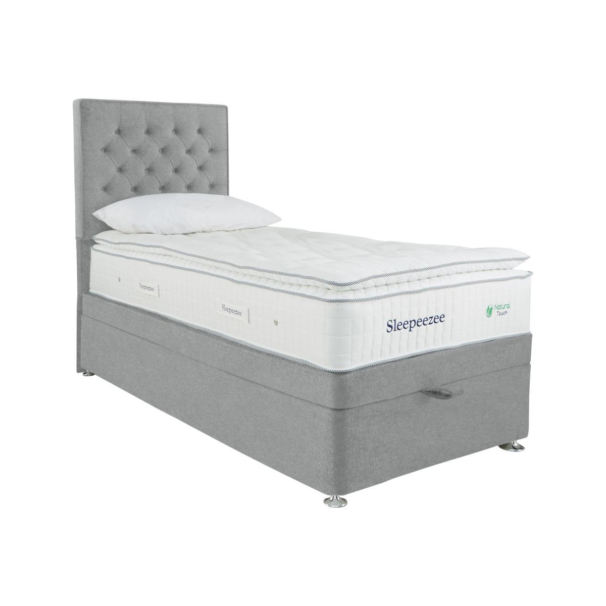 Designed for optimum sleep comfort, this Sleepeezee ottoman divan set pairs 3000 pocket springs with three sumptuous layers of British wool for an incredibly responsive sleep surface. The extra storage is just an added bonus. Why you'll love it. A natural pocket spring pillowtop divan set by British bedmaker, Sleepeezee. Luxury pillowtop design for deeply supportive comfort. 3000 pocket springs for pressure-relieving support. Three layers of British wool for enhanced temperature regulation. Breathable chemical-free damask cover. Traditional divan base in a wide choice of colours. Easy access end-lift ottoman storage compartment. Create your perfect look. Compatible with all Sleepeezee headboards. Handcrafted in the UK exclusively for Furniture Village. What you need to know. Headboard shown is available separately. Mattress type: Pocket spring. Depth: 34cm. Firmness: Medium feel. Springs: 2000 pocket springs in king size. Pillowtop: Yes. Fillings: British wool, pocket springs, Superbond foam. Borders: Standard tape edge with carry handles. Edge support: Yes. Cover: 100% natural viscose. Requires turning: Rotating only due to pillowtop. Base type: Platform top. Sizes: Single, double, king, super king. Mattress care: Air for 4 hours before using to remove any odour. Indentations caused by settlement of fillings or body weight are normal and are not considered defects. If used on a slatted bed frame, slats must be no more than 7 cm apart. Rotate regularly. We recommend the use of a mattress protector. Please take care when opening and closing the ottoman. Double, king and super king divan bases are delivered in two pieces for ease of delivery.