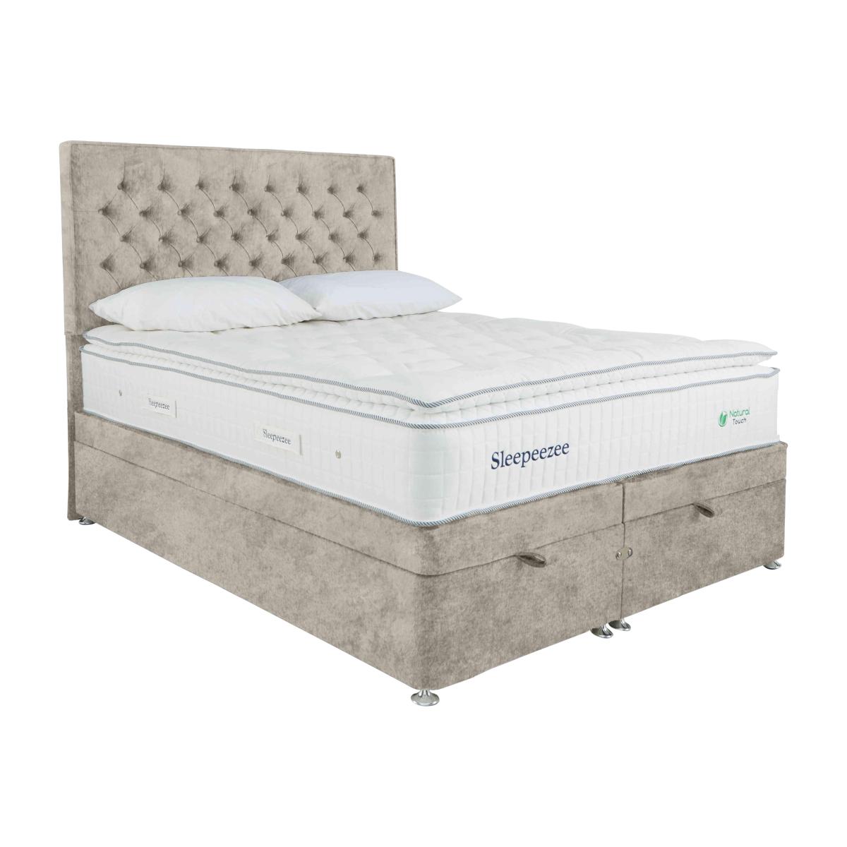 Designed for optimum sleep comfort, this Sleepeezee ottoman divan set pairs 3000 pocket springs with three sumptuous layers of British wool for an incredibly responsive sleep surface. The extra storage is just an added bonus. Why you'll love it A natural pocket spring pillowtop divan set by British bedmaker, Sleepeezee. Luxury pillowtop design for deeply supportive comfort. 3000 pocket springs for pressure-relieving support. Three layers of British wool for enhanced temperature regulation. Breathable chemical-free damask cover. Traditional divan base in a wide choice of colours. Easy access end-lift ottoman storage compartment. Create your perfect look. Compatible with all Sleepeezee headboards. Handcrafted in the UK exclusively for Furniture Village. What you need to know Headboard shown is available separately. Mattress type: Pocket spring. Depth: 34cm. Firmness: Medium feel. Springs: 2000 pocket springs in king size. Pillowtop:Yes. Fillings: British wool, pocket springs, Superbond foam. Borders: Standard tape edge with carry handles. Edge support: Yes. Cover: 100% natural viscose. Requires turning: Rotating only due to pillowtop. Base type: Platform top. Sizes: Single, double, king, super king. Mattress care:Air for 4 hours before using to remove any odour. Indentations caused by settlement of fillings or body weight are normal and are not considered defects. If used on a slatted bed frame, slats must be no more than 7 cm apart. Rotate regularly. We recommend the use of a mattress protector. Please take care when opening and closing the ottoman. Double, king and super king divan bases are delivered in two pieces for ease of delivery.