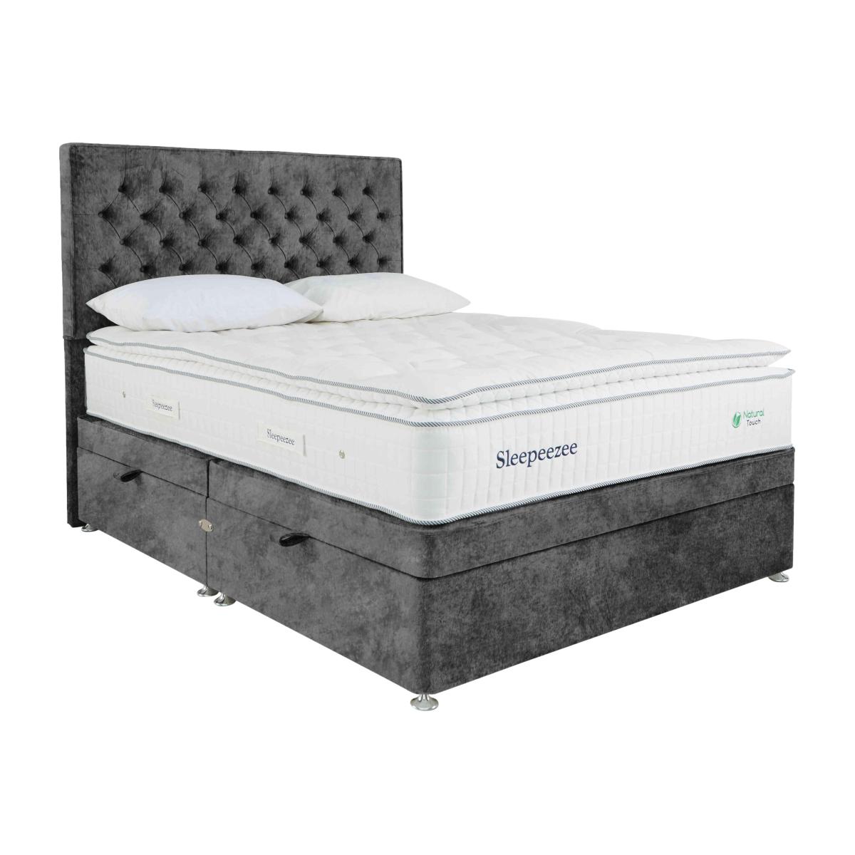 Enjoy great sleep night after night with this Sleepeezee ottoman divan set. Its pocket sprung mattress has a luxurious pillowtop, 3000 pocket springs and three rich layers of British wool. Oh, and did we mention it has underbed storage too?Why you'll love it A natural pocket spring pillowtop divan set by British bedmaker, Sleepeezee. Luxury pillowtop design for deeply supportive comfort. 3000 pocket springs for pressure-relieving support. Three layers of British wool for enhanced temperature regulation. Breathable chemical-free damask cover. Traditional divan base in a wide choice of colours. Easy access side-lift ottoman storage compartment. Create your perfect look. Compatible with all Sleepeezee headboards. Handcrafted in the UK exclusively for Furniture Village. What you need to know Headboard shown is available separately. Mattress type: Pocket spring. Depth: 34cm. Firmness: Medium feel. Springs: 2000 pocket springs in king size. Pillowtop:Yes. Fillings: British wool, pocket springs, Superbond foam. Borders: Standard tape edge with carry handles. Edge support: Yes. Cover: 100% natural viscose. Requires turning: Rotating only due to pillowtop. Base type: Platform top. Sizes: Single, double, king, super king. Mattress care:Air for 4 hours before using to remove any odour. Indentations caused by settlement of fillings or body weight are normal and are not considered defects. If used on a slatted bed frame, slats must be no more than 7 cm apart. Rotate regularly. We recommend the use of a mattress protector. Please take care when opening and closing the ottoman. Double, king and super king divan bases are delivered in two pieces for ease of delivery.