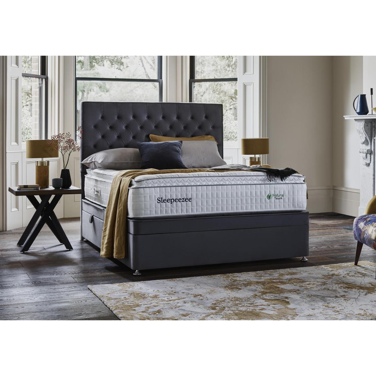 Enjoy great sleep night after night with this Sleepeezee ottoman divan set. Its pocket sprung mattress has a luxurious pillowtop, 3000 pocket springs and three rich layers of British wool. Oh, and did we mention it has underbed storage too?. Why you'll love it. A natural pocket spring pillowtop divan set by British bedmaker, Sleepeezee. Luxury pillowtop design for deeply supportive comfort. 3000 pocket springs for pressure-relieving support. Three layers of British wool for enhanced temperature regulation. Breathable chemical-free damask cover. Traditional divan base in a wide choice of colours. Easy access side-lift ottoman storage compartment. Create your perfect look. Compatible with all Sleepeezee headboards. Handcrafted in the UK exclusively for Furniture Village. What you need to know. Headboard shown is available separately. Mattress type: Pocket spring. Depth: 34cm. Firmness: Medium feel. Springs: 2000 pocket springs in king size. Pillowtop: Yes. Fillings: British wool, pocket springs, Superbond foam. Borders: Standard tape edge with carry handles. Edge support: Yes. Cover: 100% natural viscose. Requires turning: Rotating only due to pillowtop. Base type: Platform top. Sizes: Single, double, king, super king. Mattress care: Air for 4 hours before using to remove any odour. Indentations caused by settlement of fillings or body weight are normal and are not considered defects. If used on a slatted bed frame, slats must be no more than 7 cm apart. Rotate regularly. We recommend the use of a mattress protector. Please take care when opening and closing the ottoman. Double, king and super king divan bases are delivered in two pieces for ease of delivery.