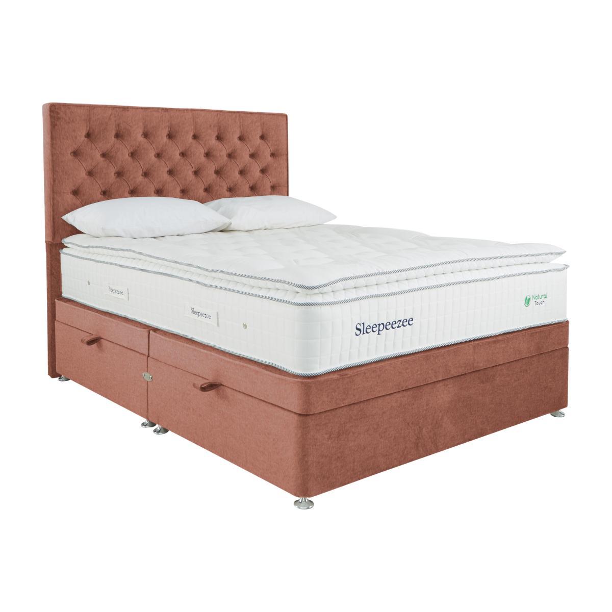 Enjoy great sleep night after night with this Sleepeezee ottoman divan set. Its pocket sprung mattress has a luxurious pillowtop, 3000 pocket springs and three rich layers of British wool. Oh, and did we mention it has underbed storage too?. Why you'll love it. A natural pocket spring pillowtop divan set by British bedmaker, Sleepeezee. Luxury pillowtop design for deeply supportive comfort. 3000 pocket springs for pressure-relieving support. Three layers of British wool for enhanced temperature regulation. Breathable chemical-free damask cover. Traditional divan base in a wide choice of colours. Easy access side-lift ottoman storage compartment. Create your perfect look. Compatible with all Sleepeezee headboards. Handcrafted in the UK exclusively for Furniture Village. What you need to know. Headboard shown is available separately. Mattress type: Pocket spring. Depth: 34cm. Firmness: Medium feel. Springs: 2000 pocket springs in king size. Pillowtop: Yes. Fillings: British wool, pocket springs, Superbond foam. Borders: Standard tape edge with carry handles. Edge support: Yes. Cover: 100% natural viscose. Requires turning: Rotating only due to pillowtop. Base type: Platform top. Sizes: Single, double, king, super king. Mattress care: Air for 4 hours before using to remove any odour. Indentations caused by settlement of fillings or body weight are normal and are not considered defects. If used on a slatted bed frame, slats must be no more than 7 cm apart. Rotate regularly. We recommend the use of a mattress protector. Please take care when opening and closing the ottoman. Double, king and super king divan bases are delivered in two pieces for ease of delivery.
