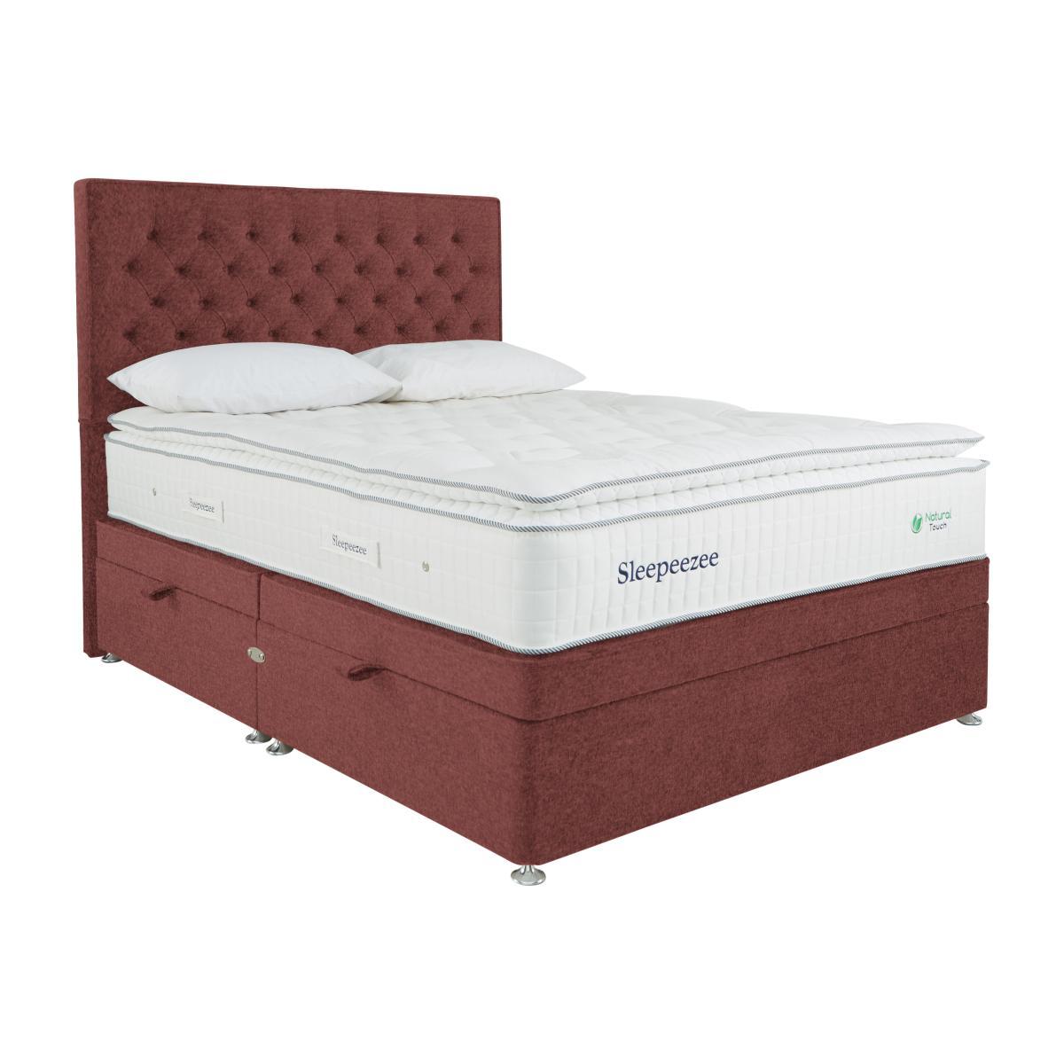 Enjoy great sleep night after night with this Sleepeezee ottoman divan set. Its pocket sprung mattress has a luxurious pillowtop, 3000 pocket springs and three rich layers of British wool. Oh, and did we mention it has underbed storage too?. Why you'll love it. A natural pocket spring pillowtop divan set by British bedmaker, Sleepeezee. Luxury pillowtop design for deeply supportive comfort. 3000 pocket springs for pressure-relieving support. Three layers of British wool for enhanced temperature regulation. Breathable chemical-free damask cover. Traditional divan base in a wide choice of colours. Easy access side-lift ottoman storage compartment. Create your perfect look. Compatible with all Sleepeezee headboards. Handcrafted in the UK exclusively for Furniture Village. What you need to know. Headboard shown is available separately. Mattress type: Pocket spring. Depth: 34cm. Firmness: Medium feel. Springs: 2000 pocket springs in king size. Pillowtop: Yes. Fillings: British wool, pocket springs, Superbond foam. Borders: Standard tape edge with carry handles. Edge support: Yes. Cover: 100% natural viscose. Requires turning: Rotating only due to pillowtop. Base type: Platform top. Sizes: Single, double, king, super king. Mattress care: Air for 4 hours before using to remove any odour. Indentations caused by settlement of fillings or body weight are normal and are not considered defects. If used on a slatted bed frame, slats must be no more than 7 cm apart. Rotate regularly. We recommend the use of a mattress protector. Please take care when opening and closing the ottoman. Double, king and super king divan bases are delivered in two pieces for ease of delivery.