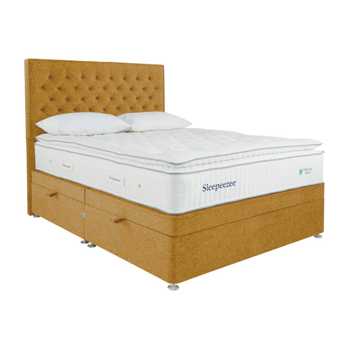 Enjoy great sleep night after night with this Sleepeezee ottoman divan set. Its pocket sprung mattress has a luxurious pillowtop, 3000 pocket springs and three rich layers of British wool. Oh, and did we mention it has underbed storage too?. Why you'll love it. A natural pocket spring pillowtop divan set by British bedmaker, Sleepeezee. Luxury pillowtop design for deeply supportive comfort. 3000 pocket springs for pressure-relieving support. Three layers of British wool for enhanced temperature regulation. Breathable chemical-free damask cover. Traditional divan base in a wide choice of colours. Easy access side-lift ottoman storage compartment. Create your perfect look. Compatible with all Sleepeezee headboards. Handcrafted in the UK exclusively for Furniture Village. What you need to know. Headboard shown is available separately. Mattress type: Pocket spring. Depth: 34cm. Firmness: Medium feel. Springs: 2000 pocket springs in king size. Pillowtop: Yes. Fillings: British wool, pocket springs, Superbond foam. Borders: Standard tape edge with carry handles. Edge support: Yes. Cover: 100% natural viscose. Requires turning: Rotating only due to pillowtop. Base type: Platform top. Sizes: Single, double, king, super king. Mattress care: Air for 4 hours before using to remove any odour. Indentations caused by settlement of fillings or body weight are normal and are not considered defects. If used on a slatted bed frame, slats must be no more than 7 cm apart. Rotate regularly. We recommend the use of a mattress protector. Please take care when opening and closing the ottoman. Double, king and super king divan bases are delivered in two pieces for ease of delivery.