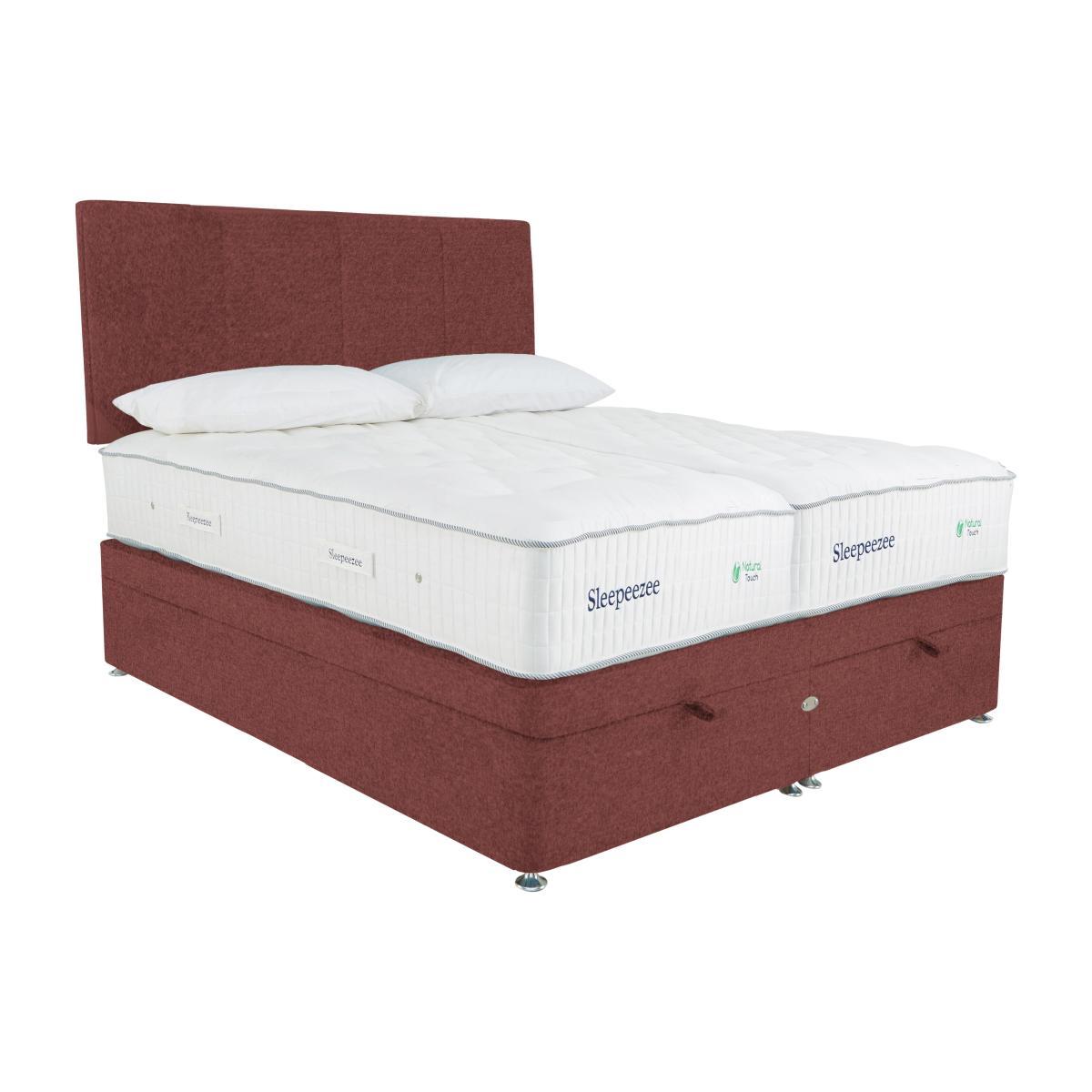 This Sleepeezee zip and link ottoman divan set is where great craftsmanship and ingenious design come together. Its natural pocket spring mattress unzips into two halves for easy rotation. There’s even underbed storage. Pretty neat, right?. Why you'll love it. One of Sleepeezee’s finest natural pocket spring mattresses. Zip and link design allows easy room access and mattress rotation. 3000 pocket springs offer impressive total-body support. Four layers of British wool for all-seasons temperature regulation. Breathable chemical-free damask cover. Traditional divan base in a wide choice of colours. Easy to access, end-lift ottoman storage. Create your perfect look. Compatible with all Sleepeezee headboards. Handcrafted in the UK exclusively for Furniture Village. What you need to know. Headboard shown is available separately. Mattress type: Pocket spring. Depth: 34cm. Firmness: Medium feel. Springs: 2000 pocket springs in king size. Pillowtop: No. Fillings: British wool, pocket springs, Superbond foam. Borders: Standard tape edge with carry handles. Edge support: Yes. Cover: 100% natural viscose. Requires turning: Yes. Base type: Platform top. Mattress care: Air for 4 hours before using to remove any odour. Indentations caused by settlement of fillings or body weight are normal and are not considered defects. If used on a slatted bed frame, slats must be no more than 7 cm apart. Rotate regularly. We recommend the use of a mattress protector. Please take care when opening and closing the ottoman. Double, king and super king divan bases are delivered in two pieces for ease of delivery.