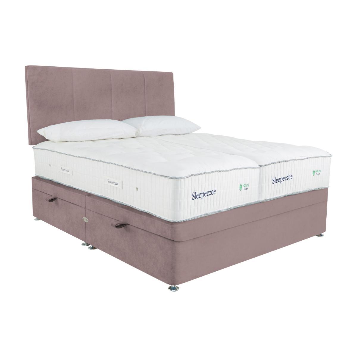 This Sleepeezee ottoman divan set has everything. A natural pocket spring mattress with a zip and link design for easy manoeuvering, a stylish divan and spacious underbed storage. Sleep doesn’t get better than this. Why you'll love it. One of Sleepeezee’s finest natural pocket spring mattresses. Zip and link design allows easy room access and mattress rotation. 3000 pocket springs offer impressive total-body support. Four layers of British wool for all-seasons temperature regulation. Breathable chemical-free damask cover. Traditional divan base in a wide choice of colours. Easy to access, side-lift ottoman storage. Create your perfect look. Compatible with all Sleepeezee headboards. Handcrafted in the UK exclusively for Furniture Village. What you need to know. Headboard shown is available separately. Mattress type: Pocket spring. Depth: 34cm. Firmness: Medium feel. Springs: 2000 pocket springs in king size. Pillowtop: No. Fillings: British wool, pocket springs, Superbond foam. Borders: Standard tape edge with carry handles. Edge support: Yes. Cover: 100% natural viscose. Requires turning: Yes. Base type: Platform top. Sizes: Single, double, king, super king. Mattress care: Air for 4 hours before using to remove any odour. Indentations caused by settlement of fillings or body weight are normal and are not considered defects. If used on a slatted bed frame, slats must be no more than 7 cm apart. Rotate regularly. We recommend the use of a mattress protector. Please take care when opening and closing the ottoman.