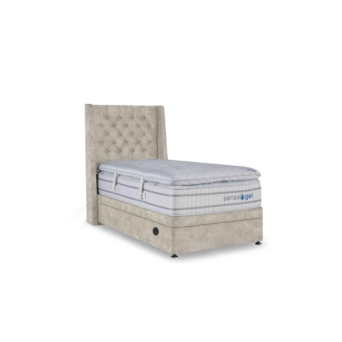 The ultimate in relaxation, this divan set has effortless electric- powered ottoman storage and a luxuriously soft mattress with uniquely heat- and pressure- sensitive layers. Handmade. Why you'll love it Electric ottoman divan set with a luxuriously soft and sensitive mattress that responds to body heat and pressure. Cool- touch top panel is proven to reduce body temperature. With pocket springs and mini springs that adjust independently for optimal support. Mattress fillings include Dreamzone profiled body- contouring gel foam. Dreamzone helps relieve pressure and draws heat away from your body. With a sumptuous topper filled with Dreamzone gel foam and memory foam. Topper is removable so it can be turned and rotated to help maintain its shape. Excellent edge- to- edge support improves comfort and prevents that feeling of rolling off. Hypoallergenic. Easy to care for – this mattress doesn’t require turning. Simply rotate with the seasons. Platform- top base with spacious end- opening ottoman storage. Electric powered for effortless access to the storage compartment. Available in a wide selection of stylish upholstery fabrics. Handcrafted exclusively for Furniture Village. This electric ottoman divan set is part of our Sleepeezee Sensa Gel range. What you need to know. Mattress type: Hybrid. Depth: 40 cm. Weight:Single 58. 24 kg, double 86. 98 kg, king 94. 98 kg and super king 113. 10 kg. Firmness:Soft. Spring count: 12000 pocket springs and mini springs. Mattress fillings: Dreamzone profiled body- contouring gel foam, soft comfort layer, high- density support layer, mini springs, traditional pocket springs. Pillow top fillings: Dreamzone gel foam, memory foam. Cover: Cool- touch knitted cover. Requires turning: Mattress does not require turning. Removable topper should be turned and rotated with the seasons. Requires turning: No. Base type: Platform top with electric- powered end- opening ottoman storage. Sizes: Single, double, king and super king. Mattress care:Air for 4 hours before using to remove any odour. Allow at least 4 hours for springs to settle and for mattress to attain its full size. Indentations caused by settlement of fillings or body weight are normal and are not considered defects. If used on a slatted bed frame, the space between slats must be no wider than 7. 5 cm. Spaces wider than this may cause excess dipping of the mattress and invalidate the guarantee. Always use a mattress protector. Rotate regularly. Divan base care: Clean upholstery weekly using a soft brush or vacuum with the curtain attachment. Professional cleaning advised for oil- and grease- based stains. Be careful care when opening and closing the ottoman base. The ottoman base is powered by mains electricity. Please ensure that you will be able to connect it to a power source before ordering. Ordering a double, king or super king size? Your divan base will be supplied in two halves for easier access.