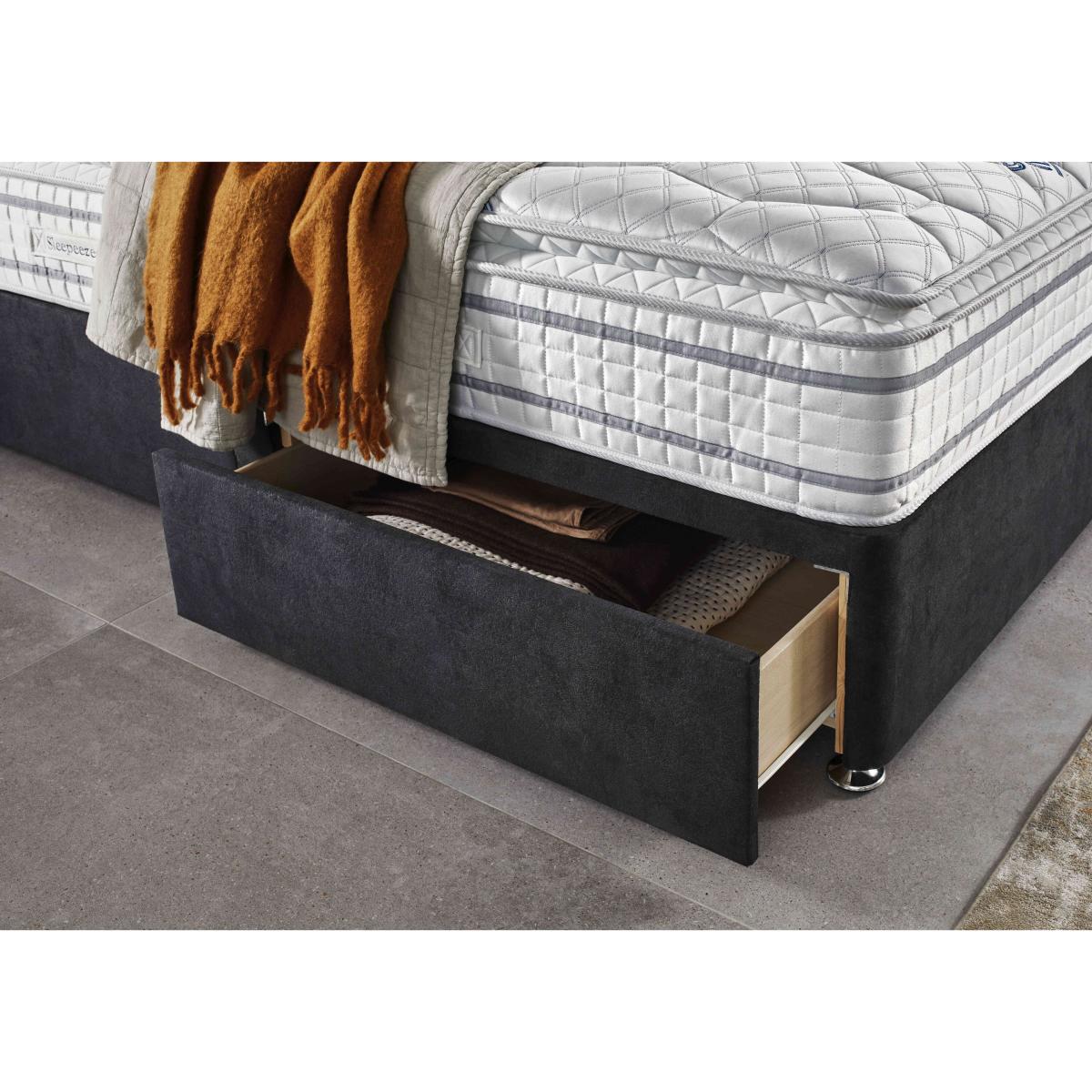 Our exclusive Sleepeezee Sensa Gel range of mattresses and divan sets is designed to be sensitive to your sleep needs in more ways than one. As the name suggests, mattresses have a unique gel filling – Dreamzone gel foam – that responds to heat and pressure as well as covers with special cooling properties. And alongside pocket springs for responsive support, mattresses are layered with memory foam and have toppers that are filled with ultra-responsive mini springs. As well as four different mattress feels from firm to soft, you’ll also find upholstered divan sets with optional drawers and ottoman storage and even an electric-powered ottoman divan set. Handcrafted for Furniture Village. Enjoy firm-mattress support with built-in pressure relief and cooling comfort plus a stylish divan base with your choice of optional storage drawers. Handcrafted. Why you'll love it This Sleepeezee divan set includes a firm mattress that’s sensitive to your sleep needs. Cool-touch top panel is proven to reduce body temperature. With pocket springs and mini springs that adjust independently for optimal support. Built-in topper has mini springs, memory foam and Dreamzone profiled body-contouring gel foam. Dreamzone helps relieve pressure and draws heat away from your body. Excellent edge-to-edge support improves comfort and prevents that feeling of rolling off. Hypoallergenic. Easy to care for – this mattress doesn’t require turning. Simply rotate with the seasons. Platform-top base with a choice of optional storage drawers. Available in a wide selection of stylish upholstery fabrics. Handcrafted exclusively for Furniture Village. This divan set is part of our Sleepeezee Sensa Gel range. What you need to know Headboard is an optional extra. Mattress type: Hybrid. Depth: 30 cm. Weight:Single 45.46 kg, small double 62.8 kg, double 69.92 kg, king 74.89 kg and super king 89.46 kg. Firmness: Firm. Spring count: 4300 pocket springs and mini springs. Mattress fillings: High-density support layer, mini springs, traditional pocket springs. Pillow top:Yes. Pillow top fillings: Soft comfort layer, high-density support layer, memory foam, Dreamzone profiled body-contouring gel foam, mini springs. Cover: Cool-touch knitted cover. Requires turning: No. Base type: Platform top with optional drawer storage. Sizes: Single, small double, double, king, super king. Mattress care:Air for 4 hours before using to remove any odour. Allow at least 4 hours for springs to settle and for mattress to attain its full size. Indentations caused by settlement of fillings or body weight are normal and are not considered defects. If used on a slatted bed frame, the space between slats must be no wider than 7.5 cm. Spaces wider than this may cause excess dipping of the mattress and invalidate the guarantee. Always use a mattress protector. Rotate regularly. Divan base care: Clean upholstery weekly using a soft brush or vacuum with the curtain attachment. Professional cleaning advised for oil- and grease-based stains. Ordering a double, king or super king size? Your divan base will be supplied in two halves for easier access.