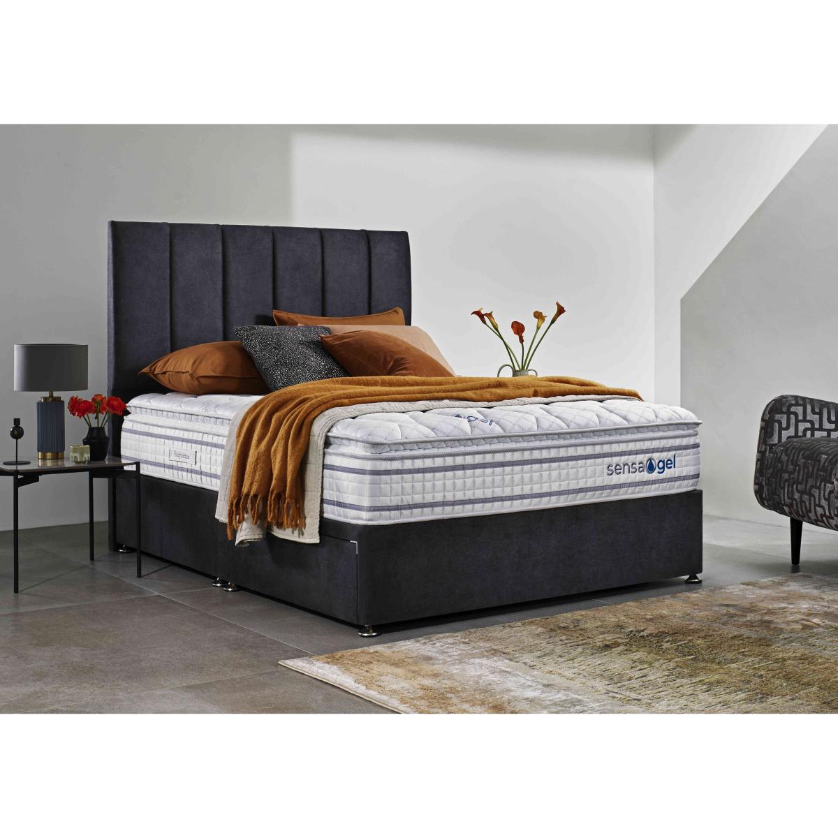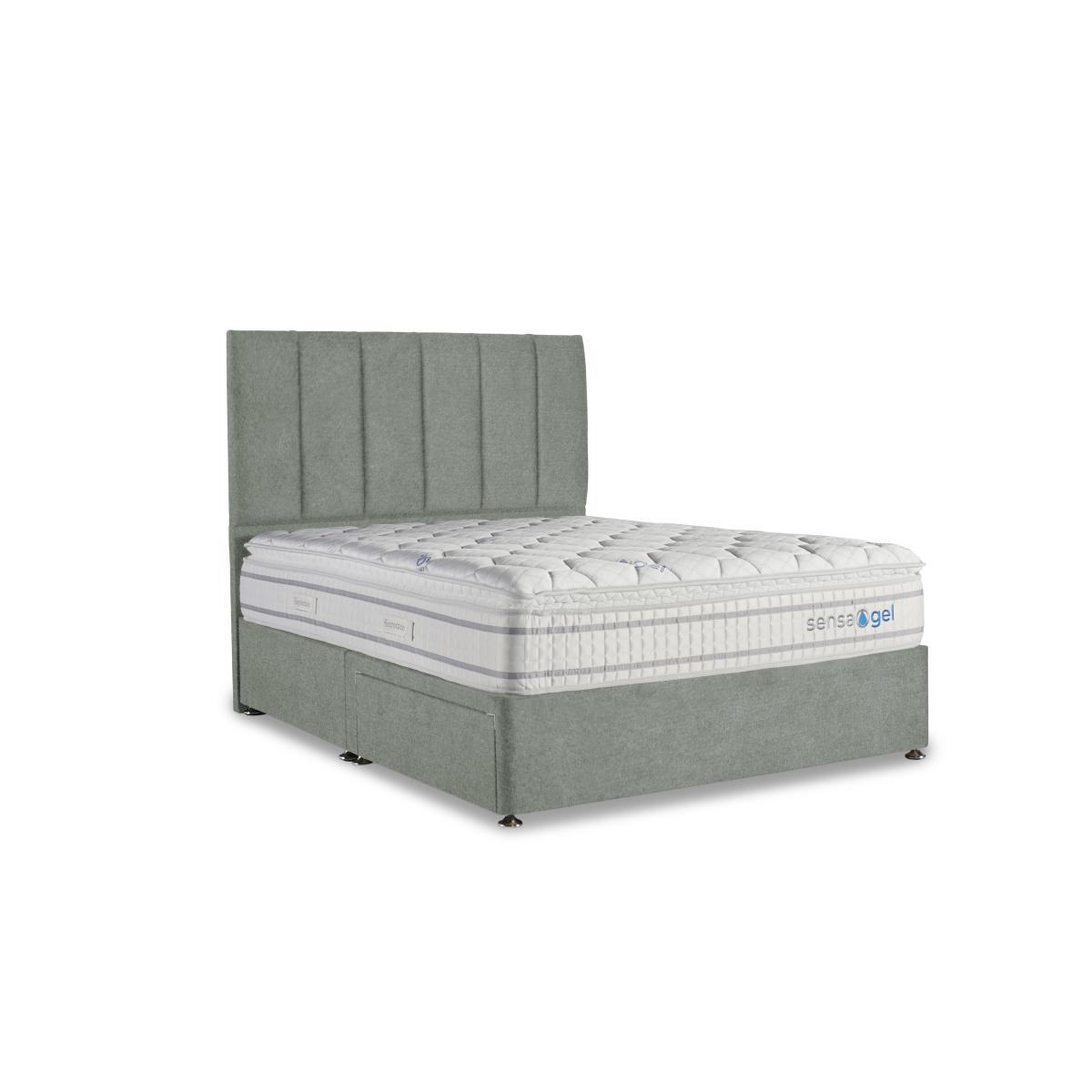 Our exclusive Sleepeezee Sensa Gel range of mattresses and divan sets is designed to be sensitive to your sleep needs in more ways than one. As the name suggests, mattresses have a unique gel filling – Dreamzone gel foam – that responds to heat and pressure as well as covers with special cooling properties. And alongside pocket springs for responsive support, mattresses are layered with memory foam and have toppers that are filled with ultra-responsive mini springs. As well as four different mattress feels from firm to soft, you’ll also find upholstered divan sets with optional drawers and ottoman storage and even an electric-powered ottoman divan set. Handcrafted for Furniture Village. Enjoy firm-mattress support with built-in pressure relief and cooling comfort plus a stylish divan base with your choice of optional storage drawers. Handcrafted. Why you'll love it This Sleepeezee divan set includes a firm mattress that’s sensitive to your sleep needs. Cool-touch top panel is proven to reduce body temperature. With pocket springs and mini springs that adjust independently for optimal support. Built-in topper has mini springs, memory foam and Dreamzone profiled body-contouring gel foam. Dreamzone helps relieve pressure and draws heat away from your body. Excellent edge-to-edge support improves comfort and prevents that feeling of rolling off. Hypoallergenic. Easy to care for – this mattress doesn’t require turning. Simply rotate with the seasons. Platform-top base with a choice of optional storage drawers. Available in a wide selection of stylish upholstery fabrics. Handcrafted exclusively for Furniture Village. This divan set is part of our Sleepeezee Sensa Gel range. What you need to know Headboard is an optional extra. Mattress type: Hybrid. Depth: 30 cm. Weight:Single 45.46 kg, small double 62.8 kg, double 69.92 kg, king 74.89 kg and super king 89.46 kg. Firmness: Firm. Spring count: 4300 pocket springs and mini springs. Mattress fillings: High-density support layer, mini springs, traditional pocket springs. Pillow top:Yes. Pillow top fillings: Soft comfort layer, high-density support layer, memory foam, Dreamzone profiled body-contouring gel foam, mini springs. Cover: Cool-touch knitted cover. Requires turning: No. Base type: Platform top with optional drawer storage. Sizes: Single, small double, double, king, super king. Mattress care:Air for 4 hours before using to remove any odour. Allow at least 4 hours for springs to settle and for mattress to attain its full size. Indentations caused by settlement of fillings or body weight are normal and are not considered defects. If used on a slatted bed frame, the space between slats must be no wider than 7.5 cm. Spaces wider than this may cause excess dipping of the mattress and invalidate the guarantee. Always use a mattress protector. Rotate regularly. Divan base care: Clean upholstery weekly using a soft brush or vacuum with the curtain attachment. Professional cleaning advised for oil- and grease-based stains. Ordering a double, king or super king size? Your divan base will be supplied in two halves for easier access.
