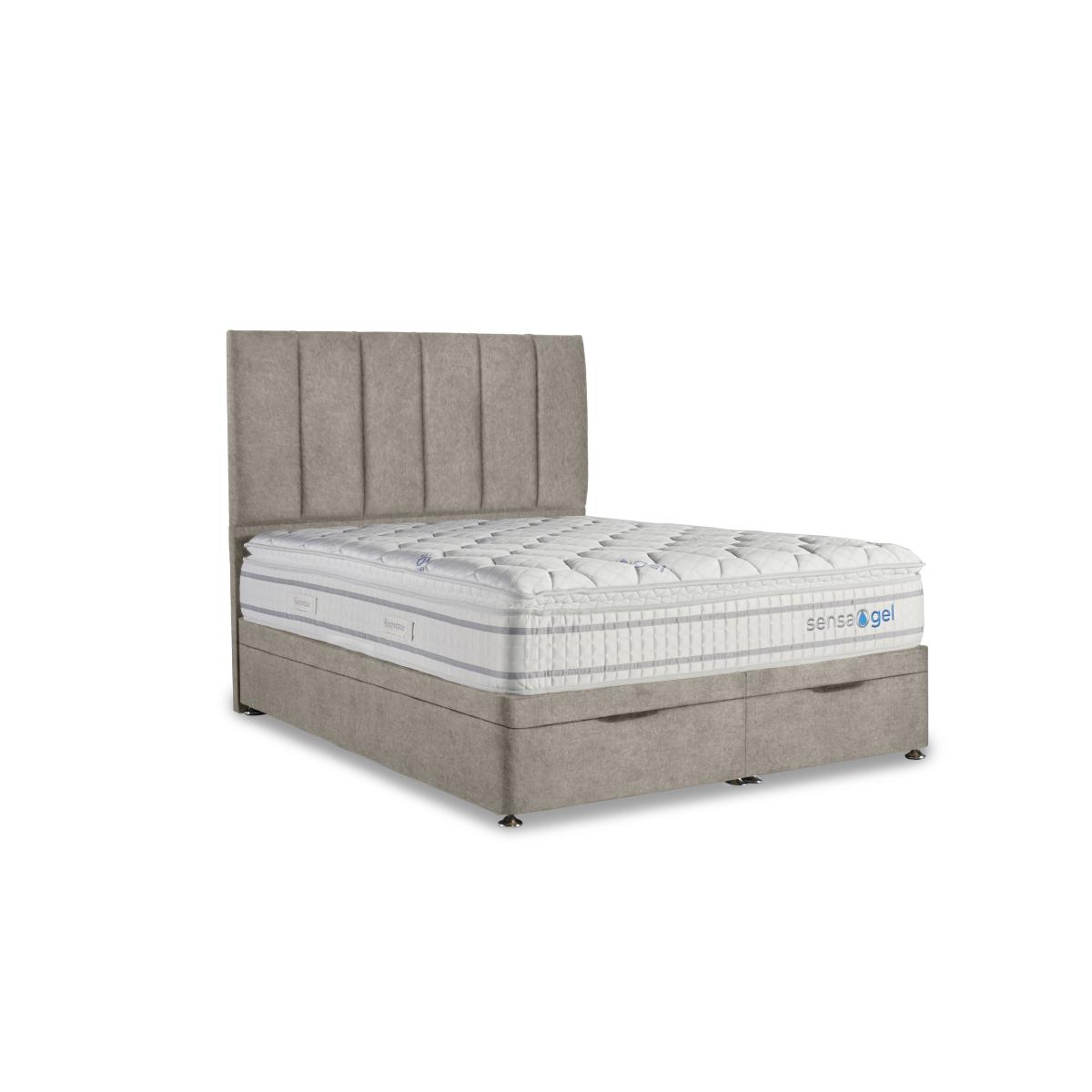 Our exclusive Sleepeezee Sensa Gel range of mattresses and divan sets is designed to be sensitive to your sleep needs in more ways than one. As the name suggests, mattresses have a unique gel filling – Dreamzone gel foam – that responds to heat and pressure as well as covers with special cooling properties. And alongside pocket springs for responsive support, mattresses are layered with memory foam and have toppers that are filled with ultra-responsive mini springs. As well as four different mattress feels from firm to soft, you’ll also find upholstered divan sets with optional drawers and ottoman storage and even an electric-powered ottoman divan set. Handcrafted for Furniture Village. The body-sensitive mattress in this ottoman divan set offers firm-feel support with built-in cooling comfort. And you’ll love that huge storage space in the ottoman base. Handmade. Why you'll love it This Sleepeezee ottoman divan set includes a firm mattress that’s sensitive to your sleep needs. Cool-touch top panel is proven to reduce body temperature. With pocket springs and mini springs that adjust independently for optimal support. Built-in topper has mini springs, memory foam and Dreamzone profiled body-contouring gel foam. Dreamzone helps relieve pressure and draws heat away from your body. Excellent edge-to-edge support improves comfort and prevents that feeling of rolling off. Hypoallergenic. Easy to care for – this mattress doesn’t require turning. Simply rotate with the seasons. Platform-top base with spacious end-opening ottoman storage compartment. Available in a wide selection of stylish upholstery fabrics. Handcrafted exclusively for Furniture Village. This ottoman divan set is part of our Sleepeezee Sensa Gel range. What you need to know Headboard is an optional extra. Mattress type: Hybrid. Depth: 30 cm. Weight:Single 45.46 kg, double 69.92 kg, king 74.89 kg and super king 89.46 kg. Firmness: Firm. Spring count: 4300 pocket springs and mini springs. Mattress fillings: High-density support layer, mini springs, traditional pocket springs. Pillow top:Yes. Pillow top fillings: Soft comfort layer, high-density support layer, memory foam, Dreamzone profiled body-contouring gel foam, mini springs. Cover: Cool-touch knitted cover. Requires turning: No. Base type: Platform top with end-opening ottoman storage. Sizes: Single, double, king and super king. Mattress care:Air for 4 hours before using to remove any odour. Allow at least 4 hours for springs to settle and for mattress to attain its full size. Indentations caused by settlement of fillings or body weight are normal and are not considered defects. If used on a slatted bed frame, the space between slats must be no wider than 7.5 cm. Spaces wider than this may cause excess dipping of the mattress and invalidate the guarantee. Always use a mattress protector. Rotate regularly. Divan base care: Clean upholstery weekly using a soft brush or vacuum with the curtain attachment. Professional cleaning advised for oil- and grease-based stains. Be careful care when opening and closing the ottoman base. Ordering a double, king or super king size? Your divan base will be supplied in two halves for easier access.