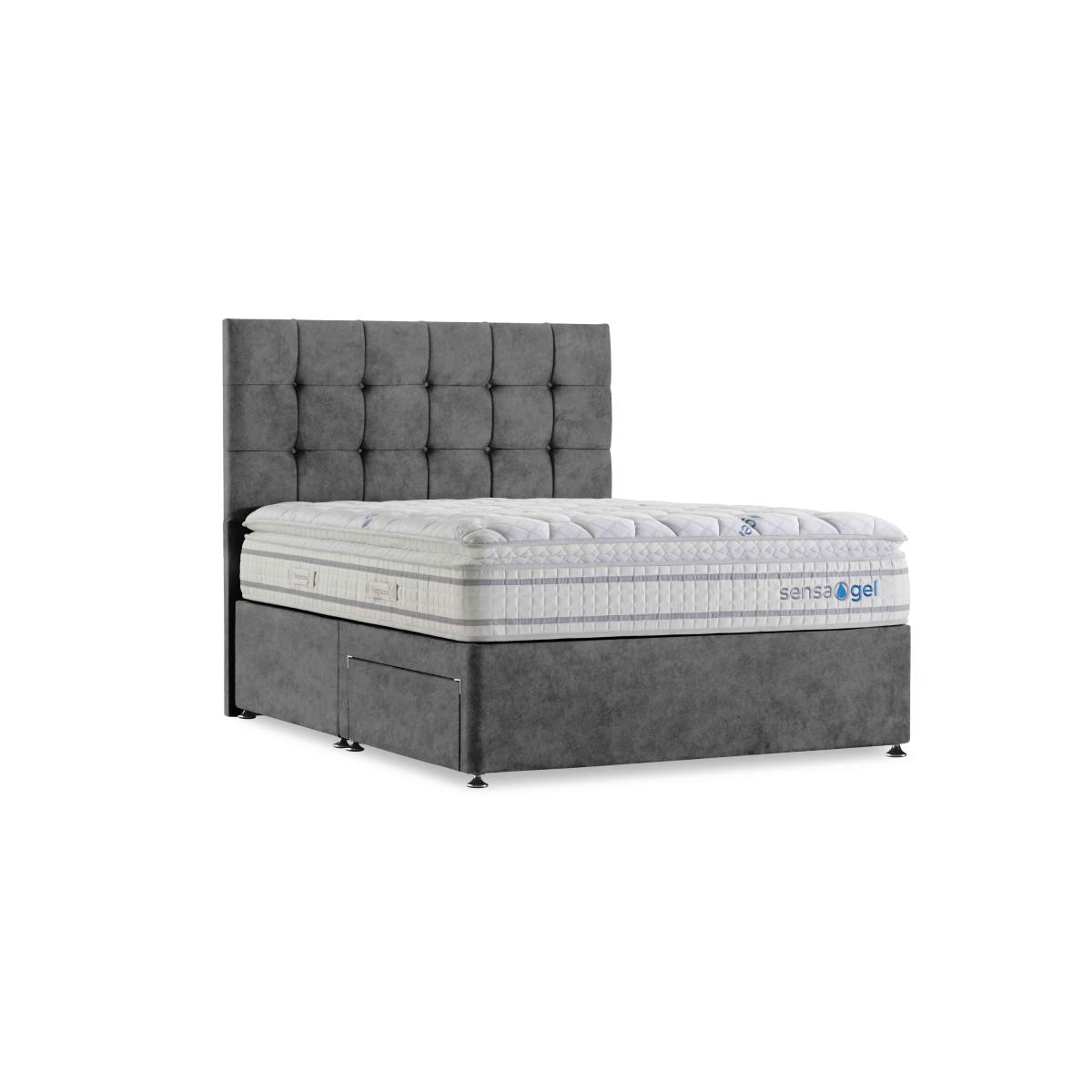 Our exclusive Sleepeezee Sensa Gel range of mattresses and divan sets is designed to be sensitive to your sleep needs in more ways than one. As the name suggests, mattresses have a unique gel filling – Dreamzone gel foam – that responds to heat and pressure as well as covers with special cooling properties. And alongside pocket springs for responsive support, mattresses are layered with memory foam and have toppers that are filled with ultra-responsive mini springs. As well as four different mattress feels from firm to soft, you’ll also find upholstered divan sets with optional drawers and ottoman storage and even an electric-powered ottoman divan set. Handcrafted for Furniture Village. Enjoy sumptuous style and superb comfort with this handcrafted Sleepeezee divan set. The mattress has body-responsive pocket springs, cooling Dreamzone gel foam and even a sprung built-in topper. Why you'll love it Medium-feel mattress support meets body-sensitive cooling comfort in this divan set. Cool-touch top panel is proven to reduce body temperature. With pocket springs and mini springs that adjust independently for optimal support. Mattress fillings include Dreamzone profiled body-contouring gel foam. Dreamzone helps relieve pressure and draws heat away from your body. Built-in topper is filled with mini springs and memory foam. Excellent edge-to-edge support improves comfort and prevents that feeling of rolling off. Hypoallergenic. Easy to care for – this mattress doesn’t require turning. Simply rotate with the seasons. Platform-top base with a choice of optional storage drawers. Available in a wide selection of stylish upholstery fabrics. Handcrafted exclusively for Furniture Village. This divan set is part of our Sleepeezee Sensa Gel range. What you need to know Headboard is an optional extra. Mattress type: Hybrid. Depth: 31 cm. Weight:Single 36.13 kg, small double 45.89 kg, double 51.99 kg, king 59.65 kg and super king 70.52 kg. Firmness: Medium. Spring count: 6100 pocket springs and mini springs. Mattress fillings: Dreamzone profiled body-contouring gel foam, high-density support layer, mini springs, traditional pocket springs. Pillow top:Yes. Pillow top fillings: Soft comfort layer, high-density support layer, double-depth memory foam, mini pocket springs. Cover: Cool-touch knitted cover. Requires turning: No. Base type: Platform top with optional drawer storage. Sizes: Single, small double, double, king, super king. Mattress care:Air for 4 hours before using to remove any odour. Allow at least 4 hours for springs to settle and for mattress to attain its full size. Indentations caused by settlement of fillings or body weight are normal and are not considered defects. If used on a slatted bed frame, the space between slats must be no wider than 7.5 cm. Spaces wider than this may cause excess dipping of the mattress and invalidate the guarantee. Always use a mattress protector. Rotate regularly. Divan base care: Clean upholstery weekly using a soft brush or vacuum with the curtain attachment. Professional cleaning advised for oil- and grease-based stains. Ordering a double, king or super king size? Your divan base will be supplied in two halves for easier access.