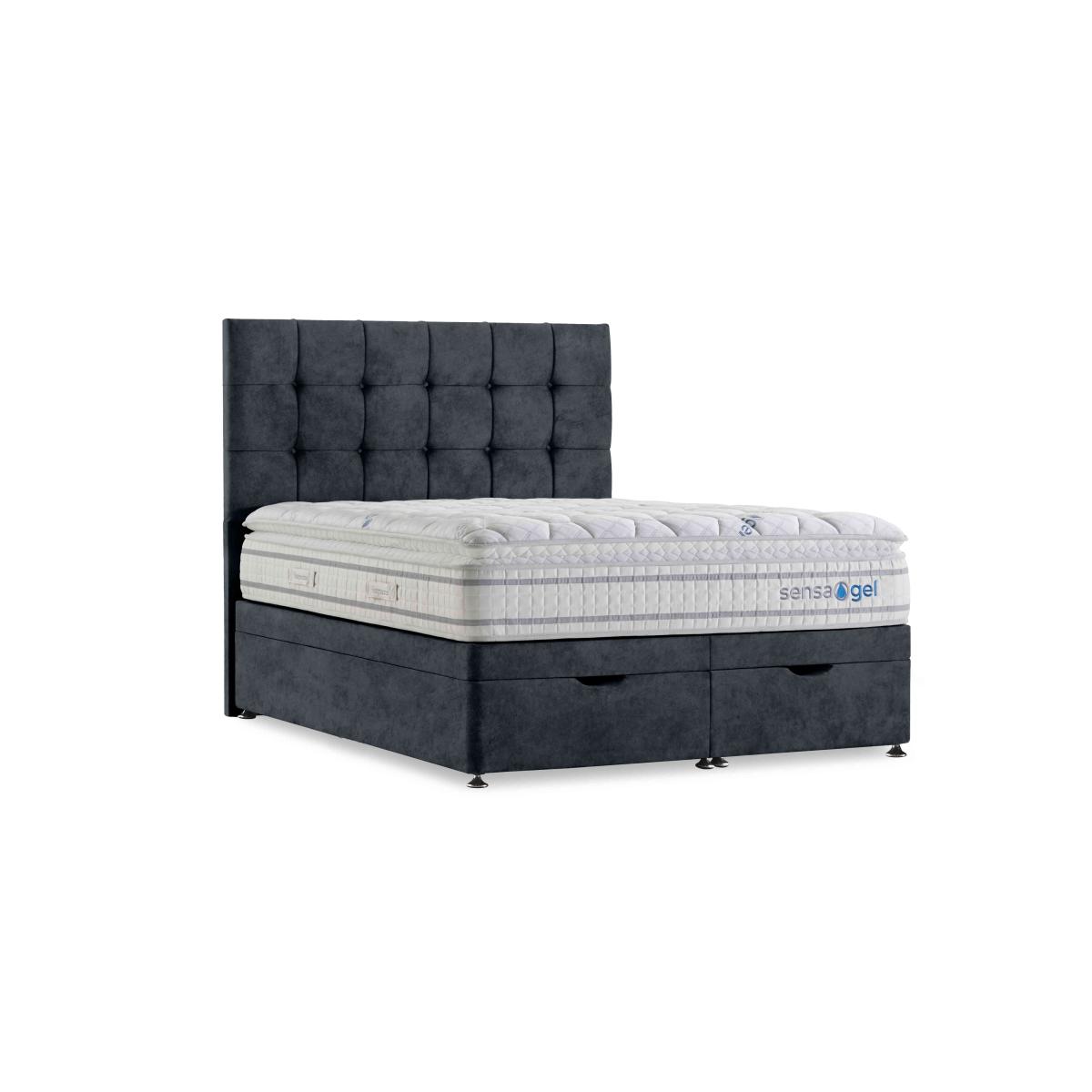Our exclusive Sleepeezee Sensa Gel range of mattresses and divan sets is designed to be sensitive to your sleep needs in more ways than one. As the name suggests, mattresses have a unique gel filling – Dreamzone gel foam – that responds to heat and pressure as well as covers with special cooling properties. And alongside pocket springs for responsive support, mattresses are layered with memory foam and have toppers that are filled with ultra-responsive mini springs. As well as four different mattress feels from firm to soft, you’ll also find upholstered divan sets with optional drawers and ottoman storage and even an electric-powered ottoman divan set. Handcrafted for Furniture Village. The mattress in this ottoman divan set is designed to be sensitive to your sleep needs with pressure relief and cooling comfort built in. And you’ll love the roomy ottoman storage. Why you'll love it Medium-feel mattress support meets body-sensitive cooling comfort in this ottoman divan set. Cool-touch top panel is proven to reduce body temperature. With pocket springs and mini springs that adjust independently for optimal support. Mattress fillings include Dreamzone profiled body-contouring gel foam. Dreamzone helps relieve pressure and draws heat away from your body. Built-in topper is filled with mini springs and memory foam. Excellent edge-to-edge support improves comfort and prevents that feeling of rolling off. Hypoallergenic. Easy to care for – this mattress doesn’t require turning. Simply rotate with the seasons. Platform-top base with spacious end-opening ottoman storage compartment. Available in a wide selection of stylish upholstery fabrics. Handcrafted exclusively for Furniture Village. This ottoman divan set is part of our Sleepeezee Sensa Gel range. What you need to know Headboard is an optional extra. Mattress type: Hybrid. Depth: 31 cm. Weight:Single 36.13 kg, double 51.99 kg, king 59.65 kg and super king 70.52 kg. Firmness: Medium. Spring count: 6100 pocket springs and mini springs. Mattress fillings: Dreamzone profiled body-contouring gel foam, high-density support layer, mini springs, traditional pocket springs. Pillow top:Yes. Pillow top fillings: Soft comfort layer, high-density support layer, double-depth memory foam, mini pocket springs. Cover: Cool-touch knitted cover. Requires turning: No. Base type: Platform top with end-opening ottoman storage. Sizes: Single, double, king and super king. Mattress care:Air for 4 hours before using to remove any odour. Allow at least 4 hours for springs to settle and for mattress to attain its full size. Indentations caused by settlement of fillings or body weight are normal and are not considered defects. If used on a slatted bed frame, the space between slats must be no wider than 7.5 cm. Spaces wider than this may cause excess dipping of the mattress and invalidate the guarantee. Always use a mattress protector. Rotate regularly. Divan base care: Clean upholstery weekly using a soft brush or vacuum with the curtain attachment. Professional cleaning advised for oil- and grease-based stains. Be careful care when opening and closing the ottoman base. Ordering a double, king or super king size? Your divan base will be supplied in two halves for easier access.