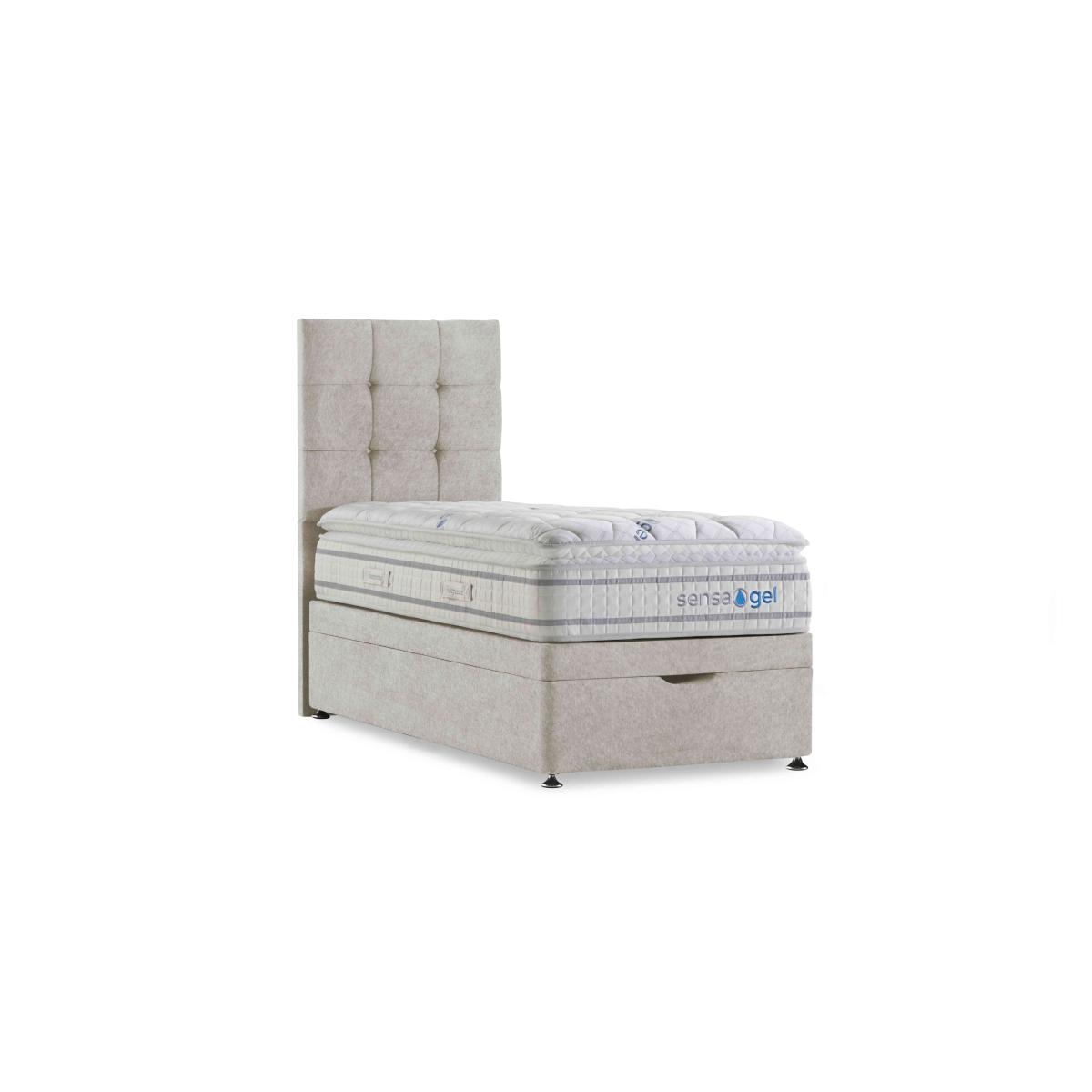 Our exclusive Sleepeezee Sensa Gel range of mattresses and divan sets is designed to be sensitive to your sleep needs in more ways than one. As the name suggests, mattresses have a unique gel filling – Dreamzone gel foam – that responds to heat and pressure as well as covers with special cooling properties. And alongside pocket springs for responsive support, mattresses are layered with memory foam and have toppers that are filled with ultra-responsive mini springs. As well as four different mattress feels from firm to soft, you’ll also find upholstered divan sets with optional drawers and ottoman storage and even an electric-powered ottoman divan set. Handcrafted for Furniture Village. The mattress in this ottoman divan set is designed to be sensitive to your sleep needs with pressure relief and cooling comfort built in. And you’ll love the roomy ottoman storage. Why you'll love it Medium-feel mattress support meets body-sensitive cooling comfort in this ottoman divan set. Cool-touch top panel is proven to reduce body temperature. With pocket springs and mini springs that adjust independently for optimal support. Mattress fillings include Dreamzone profiled body-contouring gel foam. Dreamzone helps relieve pressure and draws heat away from your body. Built-in topper is filled with mini springs and memory foam. Excellent edge-to-edge support improves comfort and prevents that feeling of rolling off. Hypoallergenic. Easy to care for – this mattress doesn’t require turning. Simply rotate with the seasons. Platform-top base with spacious end-opening ottoman storage compartment. Available in a wide selection of stylish upholstery fabrics. Handcrafted exclusively for Furniture Village. This ottoman divan set is part of our Sleepeezee Sensa Gel range. What you need to know Headboard is an optional extra. Mattress type: Hybrid. Depth: 31 cm. Weight:Single 36.13 kg, double 51.99 kg, king 59.65 kg and super king 70.52 kg. Firmness: Medium. Spring count: 6100 pocket springs and mini springs. Mattress fillings: Dreamzone profiled body-contouring gel foam, high-density support layer, mini springs, traditional pocket springs. Pillow top:Yes. Pillow top fillings: Soft comfort layer, high-density support layer, double-depth memory foam, mini pocket springs. Cover: Cool-touch knitted cover. Requires turning: No. Base type: Platform top with end-opening ottoman storage. Sizes: Single, double, king and super king. Mattress care:Air for 4 hours before using to remove any odour. Allow at least 4 hours for springs to settle and for mattress to attain its full size. Indentations caused by settlement of fillings or body weight are normal and are not considered defects. If used on a slatted bed frame, the space between slats must be no wider than 7.5 cm. Spaces wider than this may cause excess dipping of the mattress and invalidate the guarantee. Always use a mattress protector. Rotate regularly. Divan base care: Clean upholstery weekly using a soft brush or vacuum with the curtain attachment. Professional cleaning advised for oil- and grease-based stains. Be careful care when opening and closing the ottoman base. Ordering a double, king or super king size? Your divan base will be supplied in two halves for easier access.