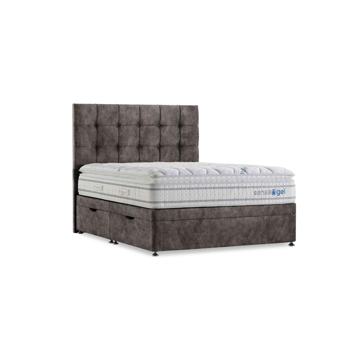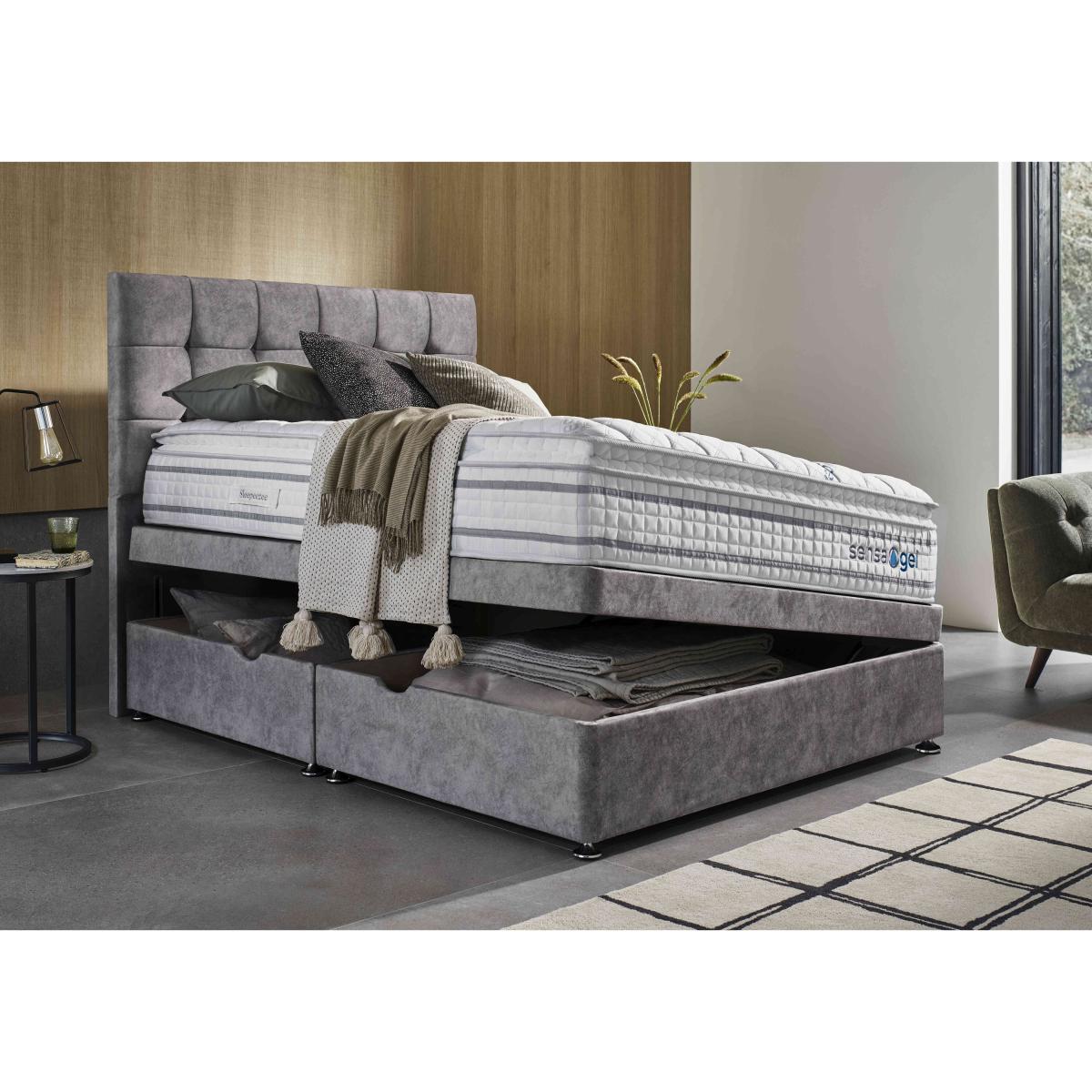 Our exclusive Sleepeezee Sensa Gel range of mattresses and divan sets is designed to be sensitive to your sleep needs in more ways than one. As the name suggests, mattresses have a unique gel filling – Dreamzone gel foam – that responds to heat and pressure as well as covers with special cooling properties. And alongside pocket springs for responsive support, mattresses are layered with memory foam and have toppers that are filled with ultra-responsive mini springs. As well as four different mattress feels from firm to soft, you’ll also find upholstered divan sets with optional drawers and ottoman storage and even an electric-powered ottoman divan set. Handcrafted for Furniture Village. This stylish ottoman divan set opens at the side to save space and includes a fantastic medium-feel mattress with cushioning, cooling Dreamzone gel foam and a built-in topper. Why you'll love it Medium-feel mattress support meets body-sensitive cooling comfort in this ottoman divan set. Cool-touch top panel is proven to reduce body temperature. With pocket springs and mini springs that adjust independently for optimal support. Mattress fillings include Dreamzone profiled body-contouring gel foam. Dreamzone helps relieve pressure and draws heat away from your body. Built-in topper is filled with mini springs and memory foam. Excellent edge-to-edge support improves comfort and prevents that feeling of rolling off. Hypoallergenic. Easy to care for – this mattress doesn’t require turning. Simply rotate with the seasons. Platform-top base with spacious side-opening ottoman storage compartment. Available in a wide selection of stylish upholstery fabrics. Handcrafted exclusively for Furniture Village. This ottoman divan set is part of our Sleepeezee Sensa Gel range. What you need to know Headboard is an optional extra. Mattress type: Hybrid. Depth: 31 cm. Weight:Single 36.13 kg, double 51.99 kg, king 59.65 kg and super king 70.52 kg. Firmness: Medium. Spring count: 6100 pocket springs and mini springs. Mattress fillings: Dreamzone profiled body-contouring gel foam, high-density support layer, mini springs, traditional pocket springs. Pillow top:Yes. Pillow top fillings: Soft comfort layer, high-density support layer, double-depth memory foam, mini pocket springs. Cover: Cool-touch knitted cover. Requires turning: No. Base type: Platform top with side-opening ottoman storage. Sizes: Single, double, king and super king. Mattress care:Air for 4 hours before using to remove any odour. Allow at least 4 hours for springs to settle and for mattress to attain its full size. Indentations caused by settlement of fillings or body weight are normal and are not considered defects. If used on a slatted bed frame, the space between slats must be no wider than 7.5 cm. Spaces wider than this may cause excess dipping of the mattress and invalidate the guarantee. Always use a mattress protector. Rotate regularly. Divan base care: Clean upholstery weekly using a soft brush or vacuum with the curtain attachment. Professional cleaning advised for oil- and grease-based stains. Be careful care when opening and closing the ottoman base. Ordering a double, king or super king size? Your divan base will be supplied in two halves for easier access.