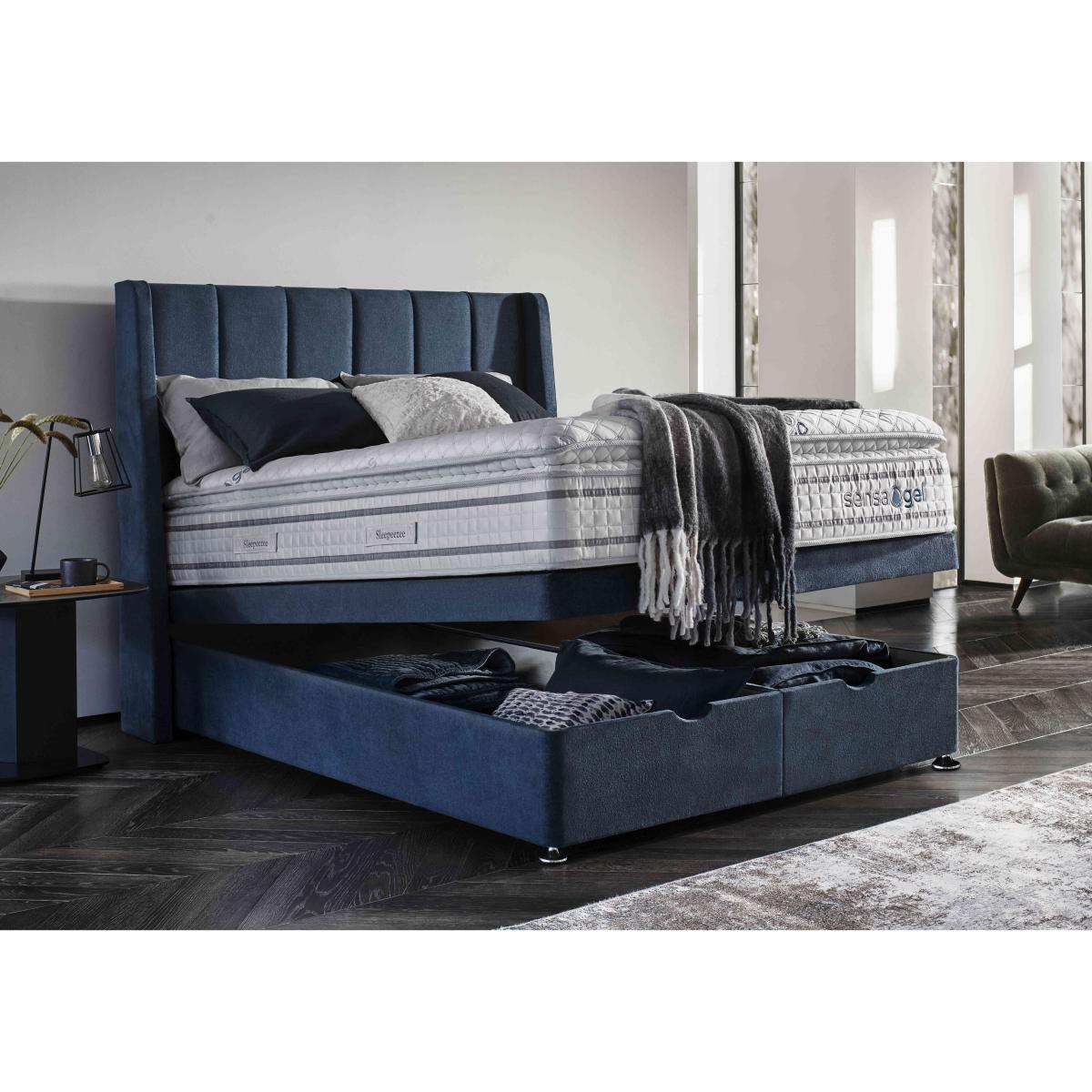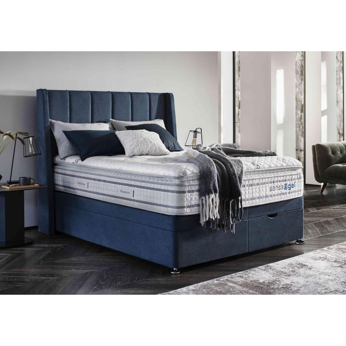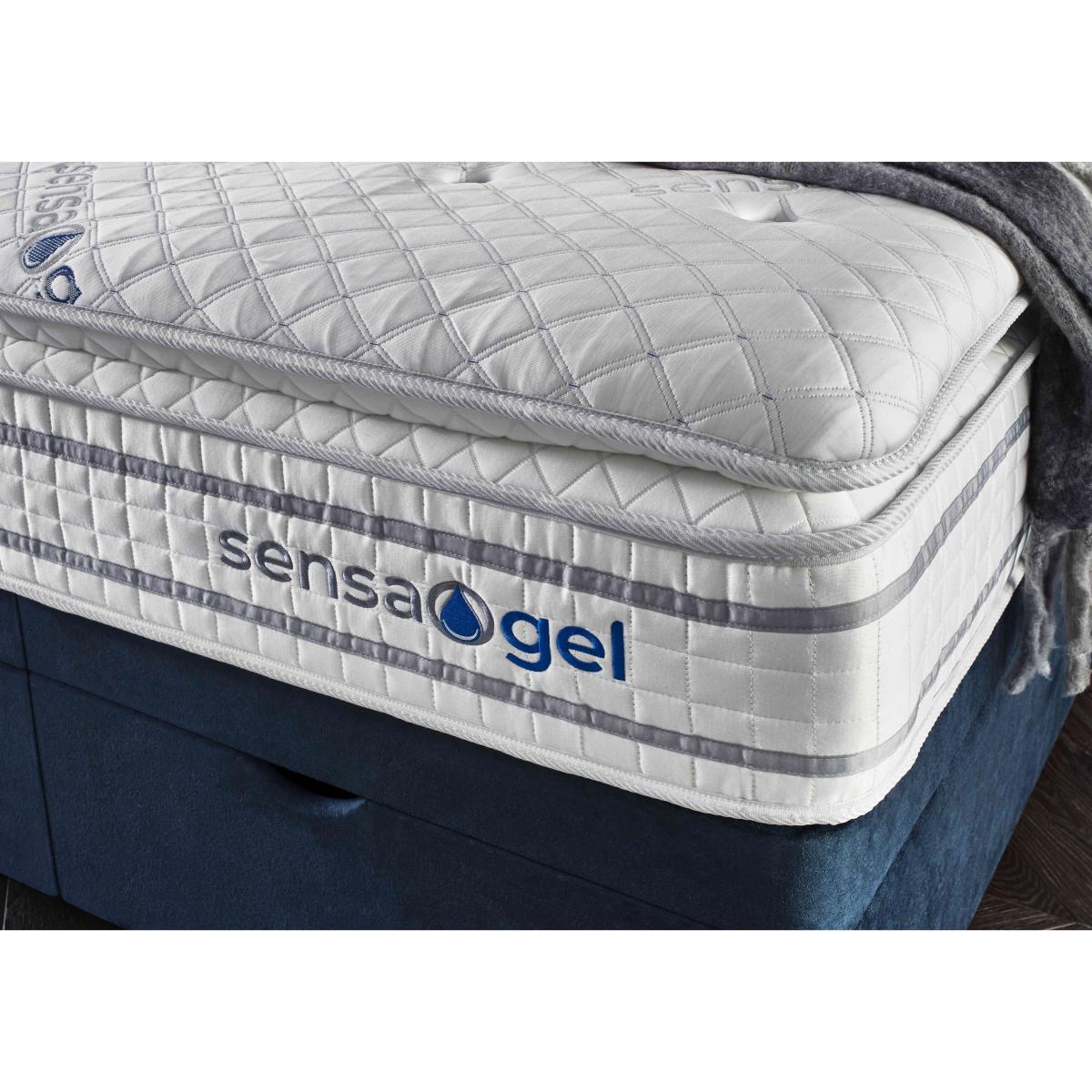 Our exclusive Sleepeezee Sensa Gel range of mattresses and divan sets is designed to be sensitive to your sleep needs in more ways than one. As the name suggests, mattresses have a unique gel filling – Dreamzone gel foam – that responds to heat and pressure as well as covers with special cooling properties. And alongside pocket springs for responsive support, mattresses are layered with memory foam and have toppers that are filled with ultra-responsive mini springs. As well as four different mattress feels from firm to soft, you’ll also find upholstered divan sets with optional drawers and ottoman storage and even an electric-powered ottoman divan set. Handcrafted for Furniture Village. Sleep better with a mattress that’s more sensitive. This divan set includes the superb Sensa Gel 9000 mattress and has spacious ottoman storage, too. Why you'll love it Sensitive to heat and pressure, the fantastic medium-feel mattress in this ottoman divan set lulls you to sleep. Cool-touch top panel is proven to reduce body temperature. With pocket springs and mini springs that adjust independently for optimal support. Mattress fillings include Dreamzone profiled body-contouring gel foam. Dreamzone helps relieve pressure and draws heat away from your body. Built-in topper is filled with mini springs, super soft memory foam and more. Excellent edge-to-edge support improves comfort and prevents that feeling of rolling off. Hypoallergenic. Easy to care for – this mattress doesn’t require turning. Simply rotate with the seasons. Platform-top base with spacious end-opening ottoman storage compartment. Available in a wide selection of stylish upholstery fabrics. Handcrafted exclusively for Furniture Village. This ottoman divan set is part of our Sleepeezee Sensa Gel range. What you need to know Headboard is an optional extra. Mattress type: Hybrid. Depth: 32 cm. Weight:Single 40.03 kg, double 60.04 kg, king 65.42 kg and super king 77.99 kg. Firmness: Medium. Spring count: 9000 pocket springs and mini springs. Mattress fillings: Dreamzone profiled body-contouring gel foam, mini springs, traditional pocket springs. Pillow top:Yes. Pillow top fillings: Soft comfort layer, high-density support layer, super-soft memory foam, mini springs. Cover: Cool-touch knitted cover. Requires turning: No. Base type: Platform top with end-opening ottoman storage. Sizes: Single, double, king and super king. Mattress care:Air for 4 hours before using to remove any odour. Allow at least 4 hours for springs to settle and for mattress to attain its full size. Indentations caused by settlement of fillings or body weight are normal and are not considered defects. If used on a slatted bed frame, the space between slats must be no wider than 7.5 cm. Spaces wider than this may cause excess dipping of the mattress and invalidate the guarantee. Always use a mattress protector. Rotate regularly. Divan base care: Clean upholstery weekly using a soft brush or vacuum with the curtain attachment. Professional cleaning advised for oil- and grease-based stains. Be careful care when opening and closing the ottoman base. Ordering a double, king or super king size? Your divan base will be supplied in two halves for easier access.