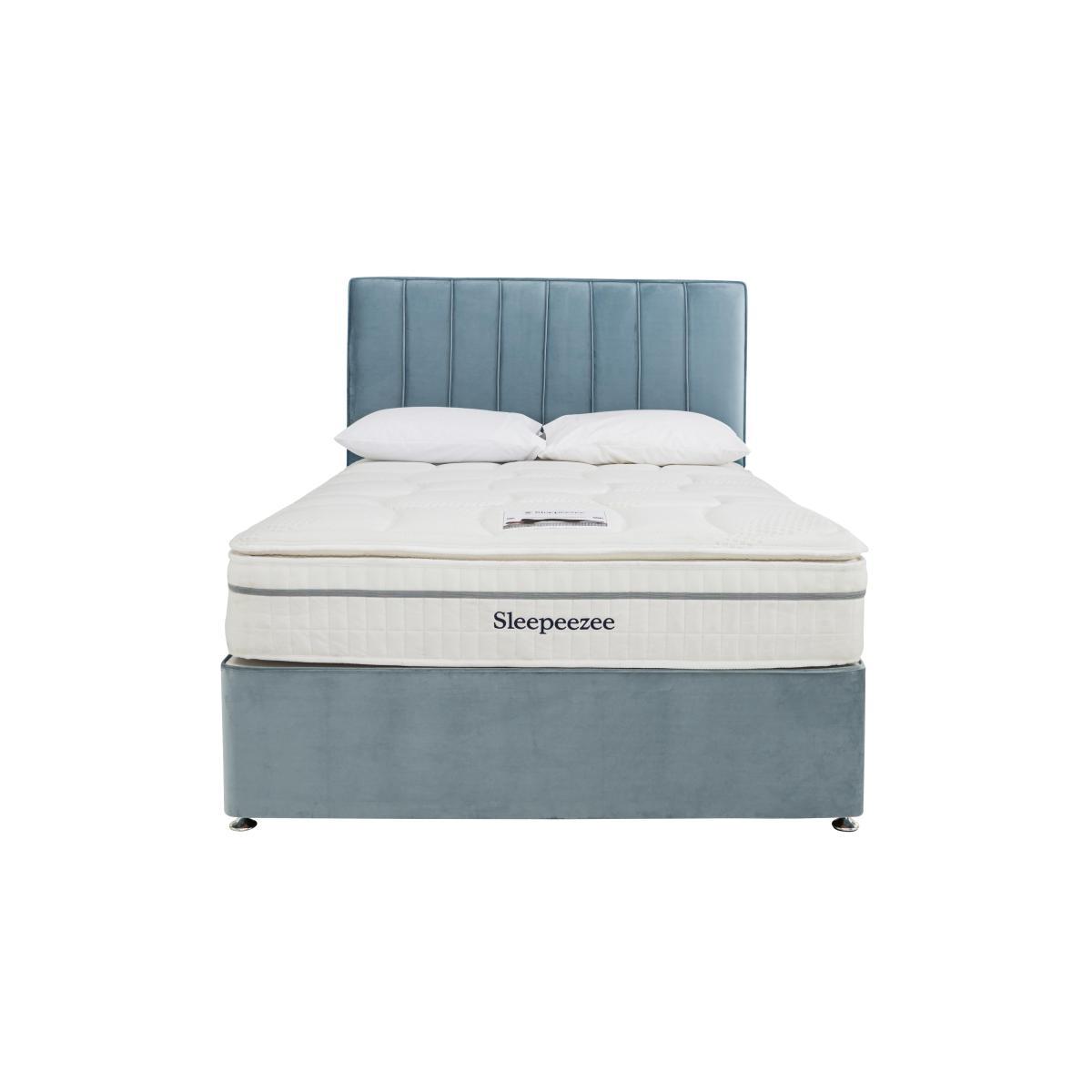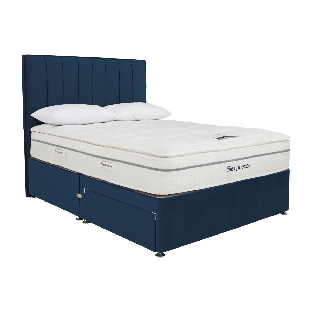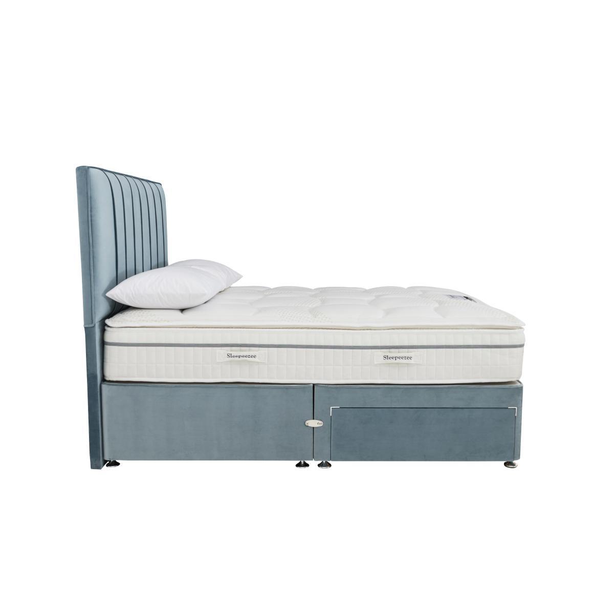 Peace and tranquillity is yours with the handcrafted Sleepeezee Tranquility 2800 collection. The medium feel 33 cm mattress has a sumptuously soft pillow top for body-cushioning comfort plus 2800 individually-nested pocket springs in king size that provide superbly responsive support. Soft white fibre and memory foam fillings make this one of the most comfortable mattresses around, while providing welcome reassurance for allergy sufferers. It’s paired with a beautifully upholstered platform-top divan base that’s available in a wide choice of fabrics and comes with useful optional storage drawers. The Sleepeezee Tranquility 2800 collection is exceptionally well-priced and only at Furniture Village. Made in Britain by Sleepeezee, holders of a Royal Warrant from HRH The Prince of Wales. Headboard is an optional extra. Peace and tranquility is yours with the Sleepeezee Tranquility 2800 divan set. And you’ll likely find the price very relaxing too. This superb divan set comprises a stunning 33 cm mattress with sumptuous body-cushioning pillow top that’s designed to cocoon you in comfort. Medium in feel, it has 2800 individually-nested pocket springs for exceptionally precise support. And it’s ideal for allergy sufferers, too, thanks to the layers of hypoallergenic soft white fibre and memory foam fillings. It’s paired with a beautifully upholstered platform-top divan base that’s available with optional storage drawers and in a wide range of fabrics. Handcrafted in Britain by Sleepeezee, holders of a Royal Warrant of Appointment granted by HRH The Prince of Wales Sleepeezee, the Tranquility 2800 divan set is part of the Sleepeezee Tranquility 2800 collection and is exclusively available at Furniture Village. Product images are representative. Find out more. Please note. The mattress should be aired for four hours after delivery to freshen and remove any aroma from storage. It may take time for your mattress to attain its full size once the springs have settled to the correct position. This is due to the mattress being upright during transit. Settlement of fillings and indentations caused by body weight compressing the fillings are natural and not considered defects. This can be minimised by regular rotating (unless yours is a dual tension mattress).