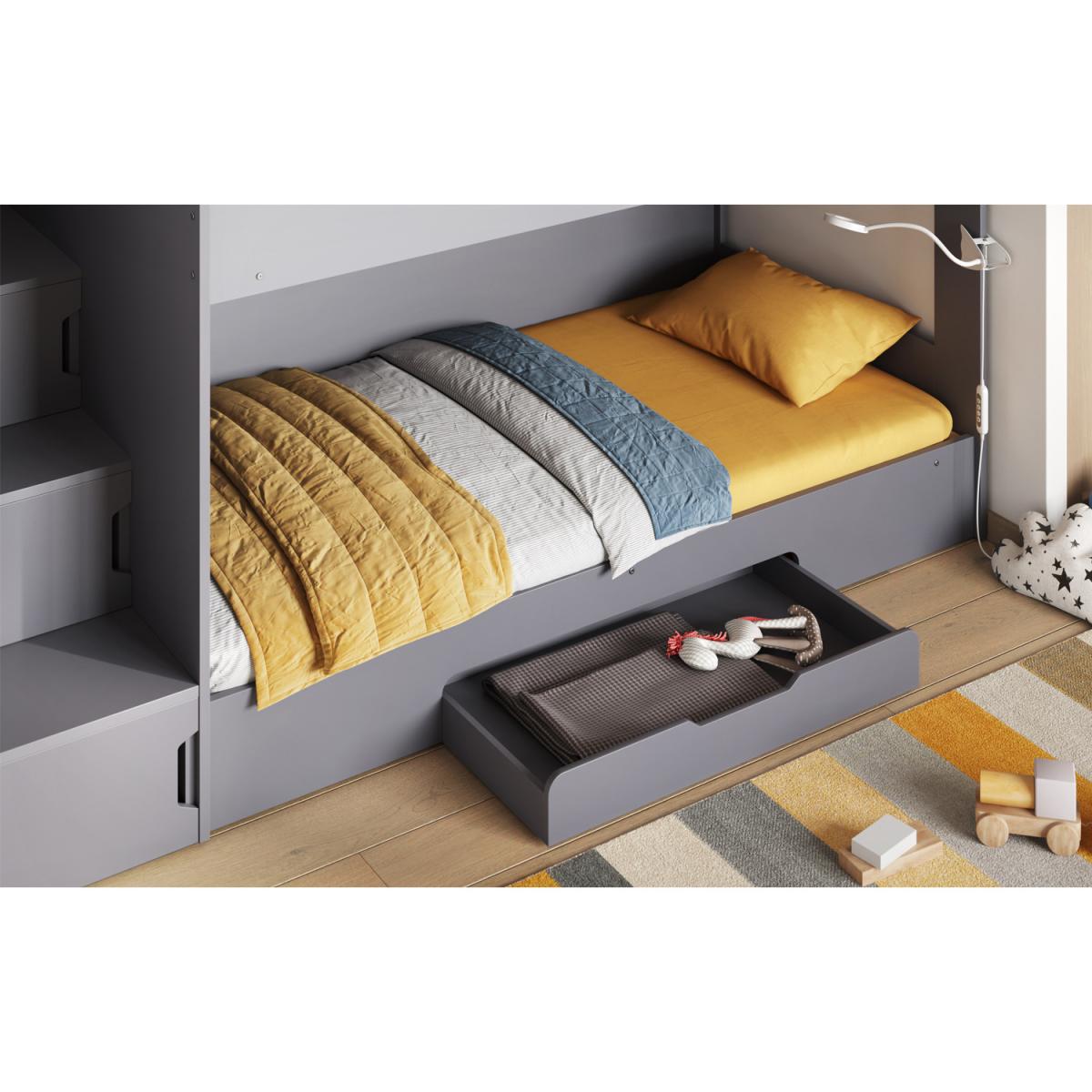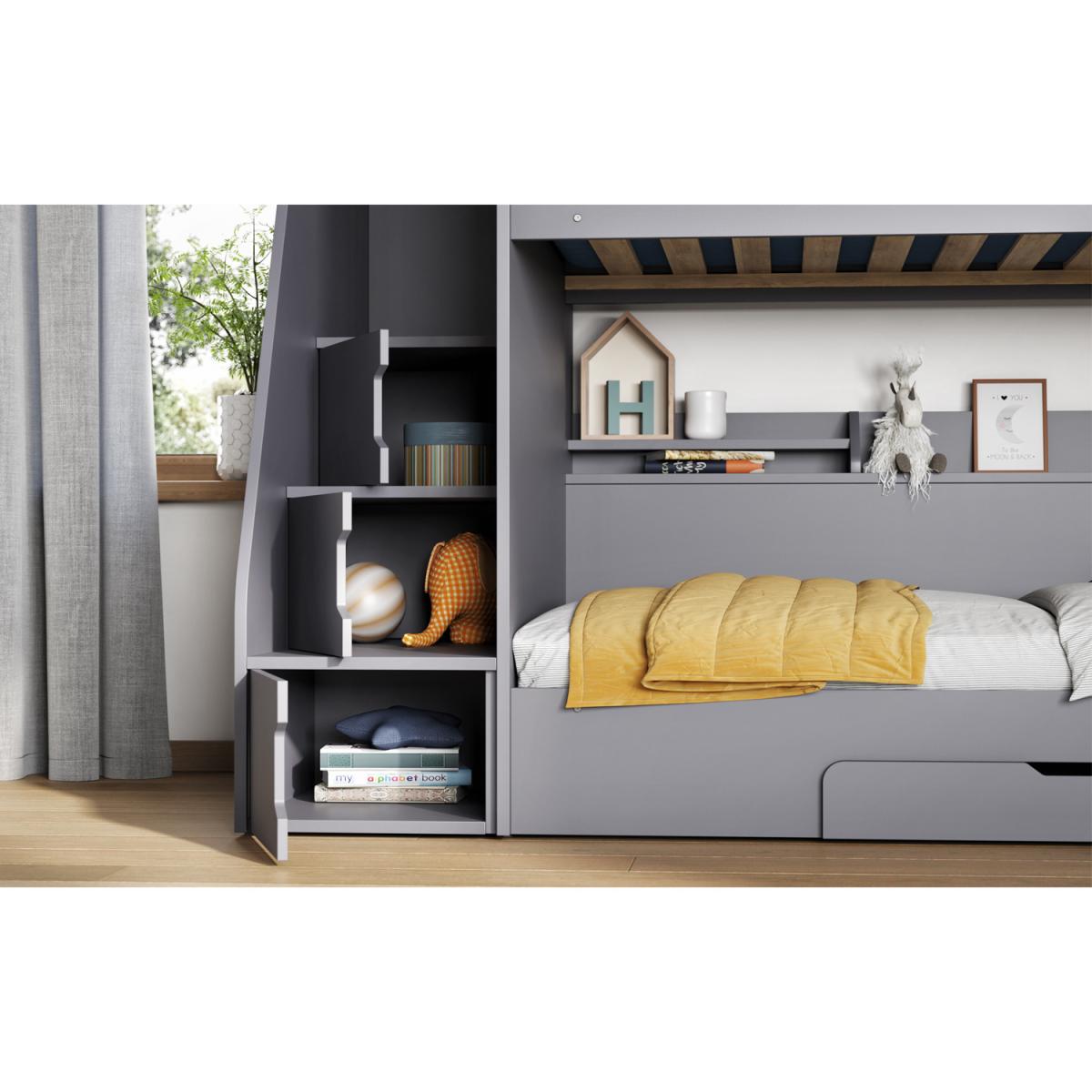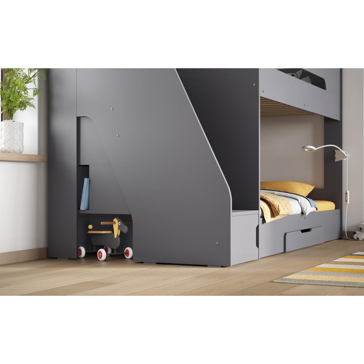 Do you need storage space alongside a smart but fun bed for your children? Then this the bunk for you! The staircase has spacious cupboards: shelving built-in to both bunks, an under-bed drawer and storage beneath the staircase. With this bed you will never be out of space to store anything. All this storage provided and safety is not compromised. High side-panelling, headboard, and footboard make for a snug and safe night's sleep, the staircase makes this bunk considerably safer than traditional ladders. The grey Slick Bunk Bed doesn't only look good, it is built using high-quality materials, ensuring a long-lasting and sturdy product.