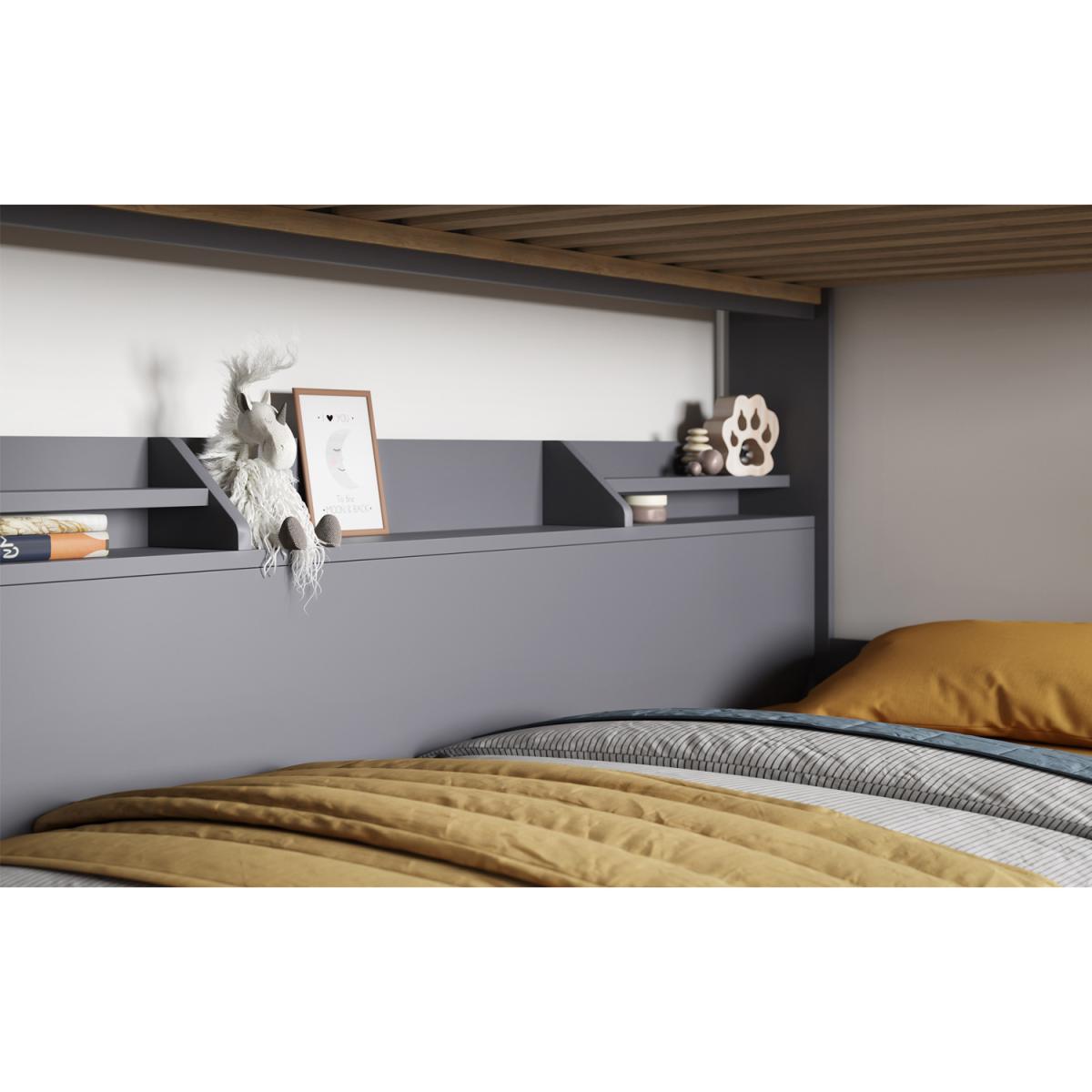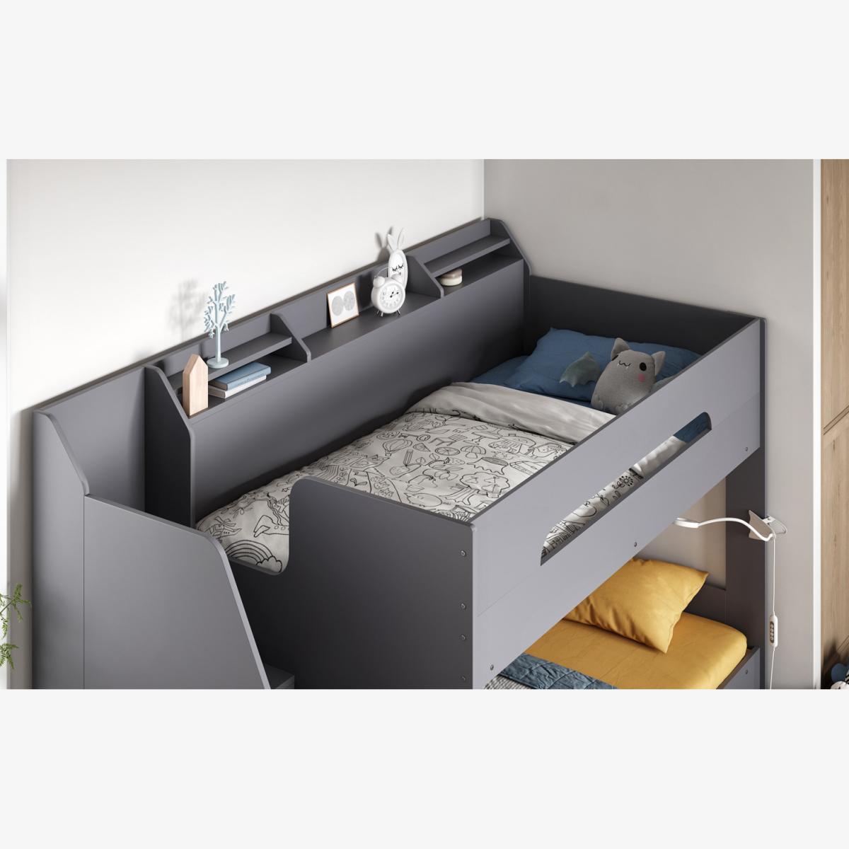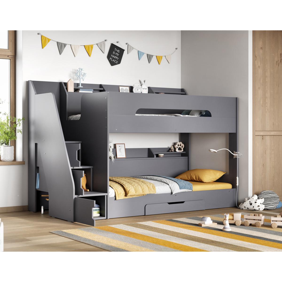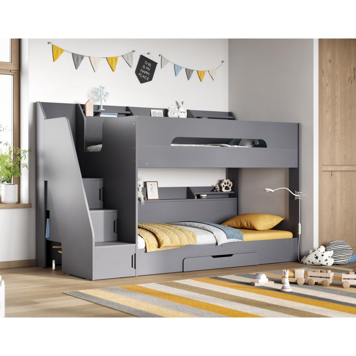 Do you need storage space alongside a smart but fun bed for your children? Then this the bunk for you! The staircase has spacious cupboards: shelving built-in to both bunks, an under-bed drawer and storage beneath the staircase. With this bed you will never be out of space to store anything. All this storage provided and safety is not compromised. High side-panelling, headboard, and footboard make for a snug and safe night's sleep, the staircase makes this bunk considerably safer than traditional ladders. The grey Slick Bunk Bed doesn't only look good, it is built using high-quality materials, ensuring a long-lasting and sturdy product.