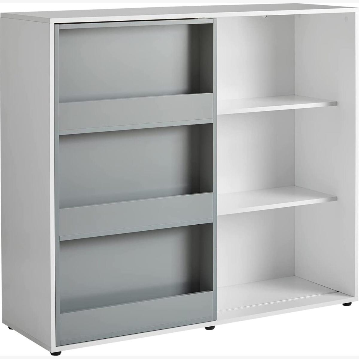 Modern design children storage cabinet is perfect for childrens room and living room. The top of the cabinet is ideal for storing something like books you might need in reach, or photos and decorations you want to display.6 shelves in the cabinet and 3 shelves on the sliding door, providing ample storage space for the books, toys, etc. The sliding door adds a stylish touch to this cabinet and help you take out needed items with ease. Sturdy wood with environmental protection paint and the anti-tipping device, ensure good stability and safety, an ideal choice for daycare, classroom and children's room. This shelf will blend perfectly with any decor. It will keep your room nicely organized.