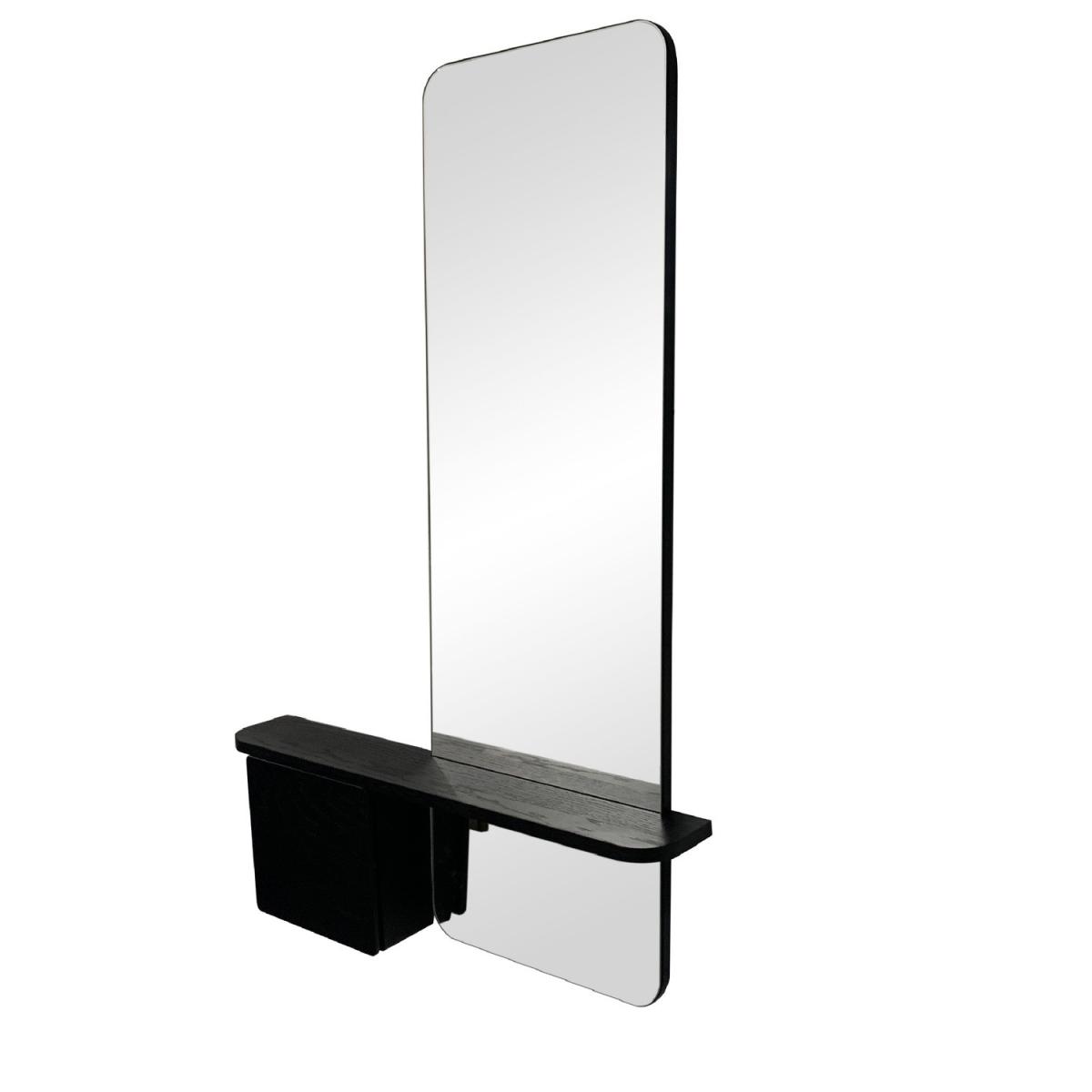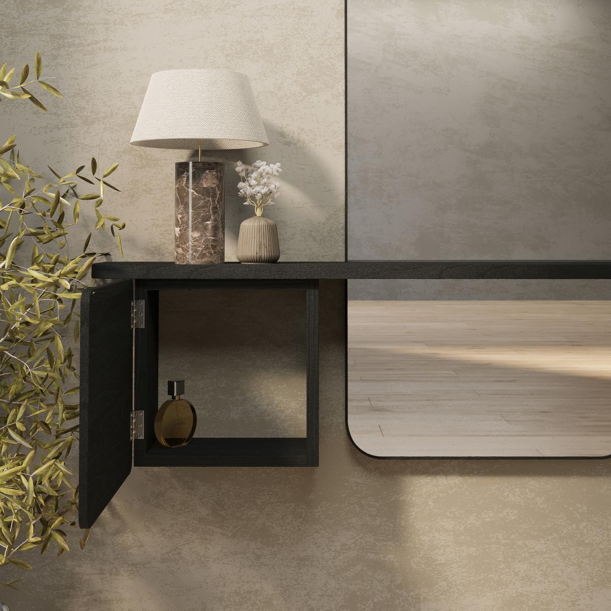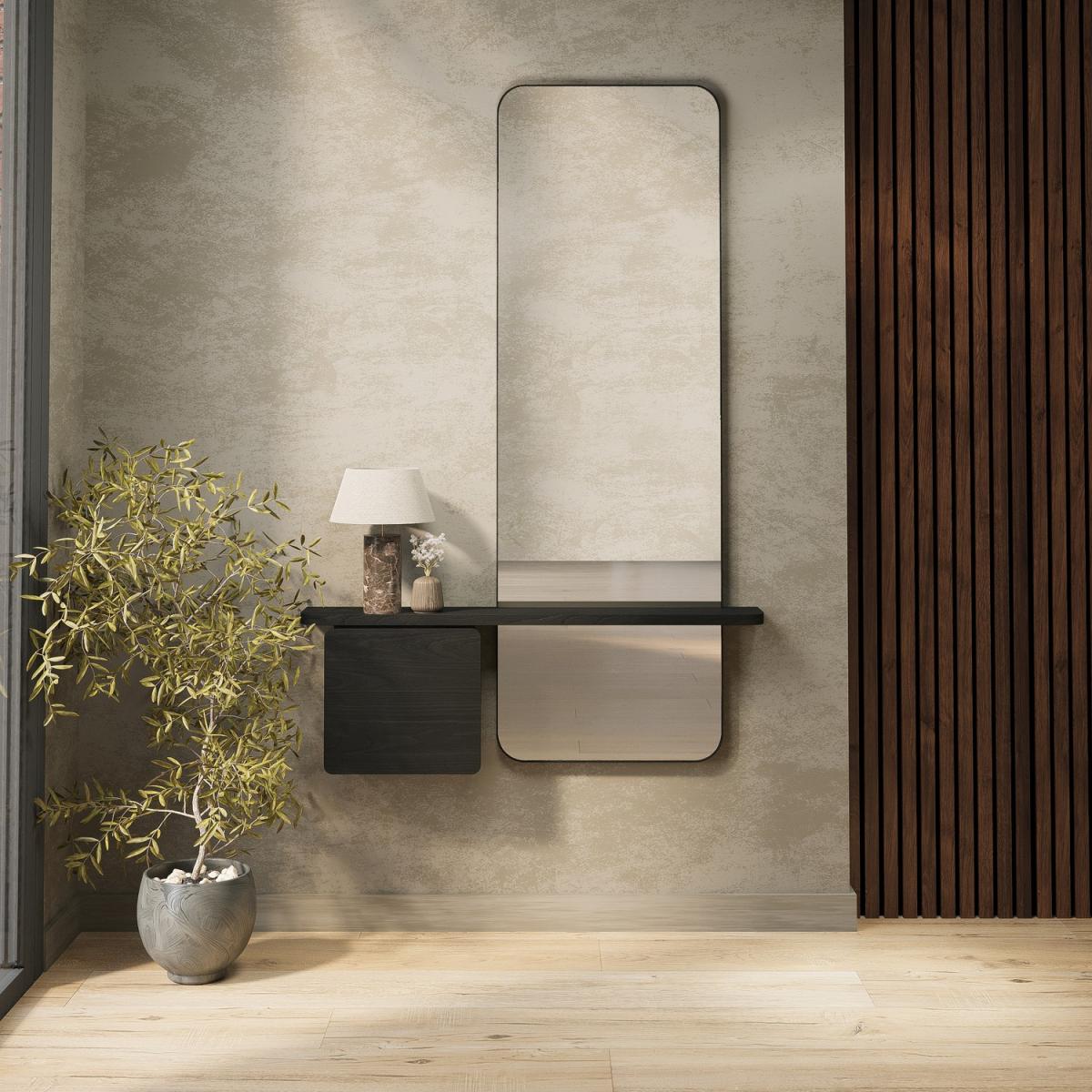 Izzi blends form and function effortlessly. A long mirror, a storage unit, and a sleek console table all in one – it’s perfect for compact or multi-purpose spaces. Crafted from solid oak and oak veneer with a painted black finish, this console table brings a clean, contemporary look to any room while offering hidden practicality. An internal compartment offers flexible space for keeping everyday bits and bobs tidy and out of sight. The adjustable storage allows you to tailor the space to suit your needs and keep items neatly arranged. By mounting to the wall, Izzi frees up valuable floor space, making it ideal for smaller rooms or narrow hallways. With its slim profile and understated style, Izzi is a natural fit in hallways, dressing rooms or bedrooms. It makes a statement without overwhelming the space. The Izzi black console table is a clever and stylish addition to your home. Finished in bold black oak and complete with a full-length mirror, it creates the illusion of more space while doubling as hidden storage. Whether you’re heading out the door or getting ready for the day, Izzi helps keep everything you need neatly within reach – and out of sight.