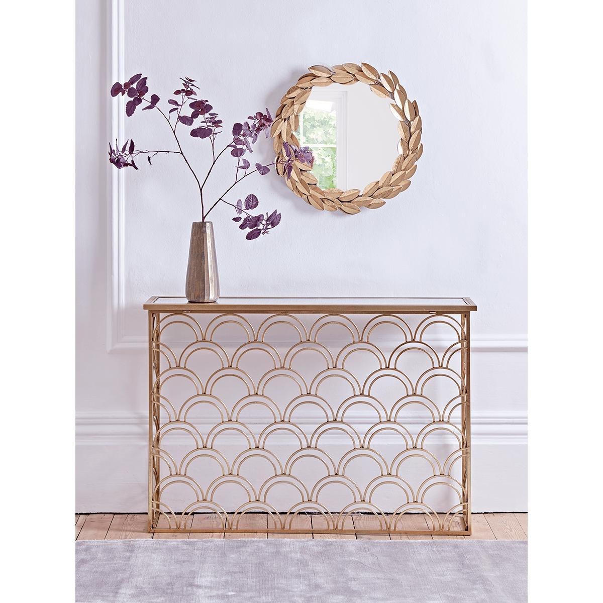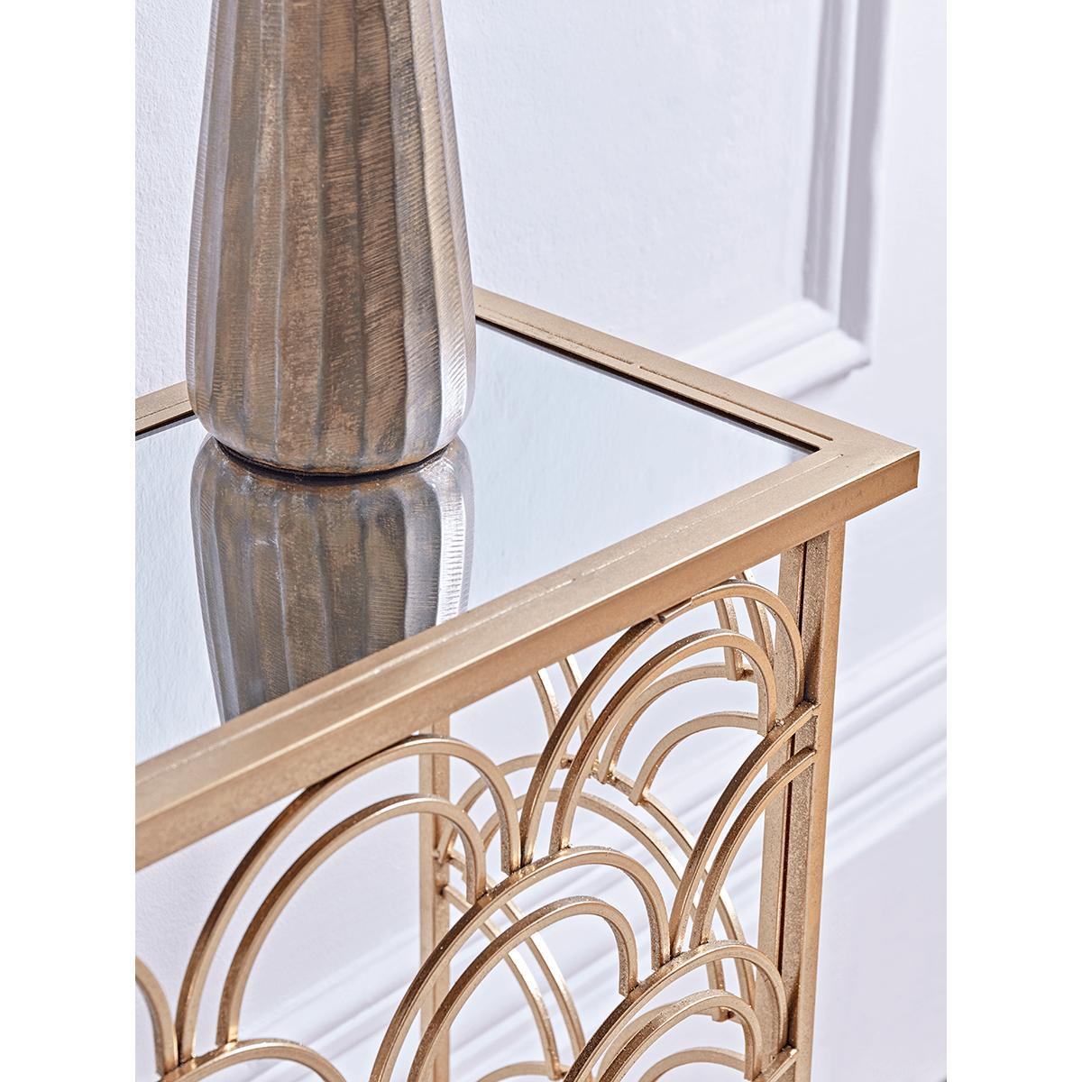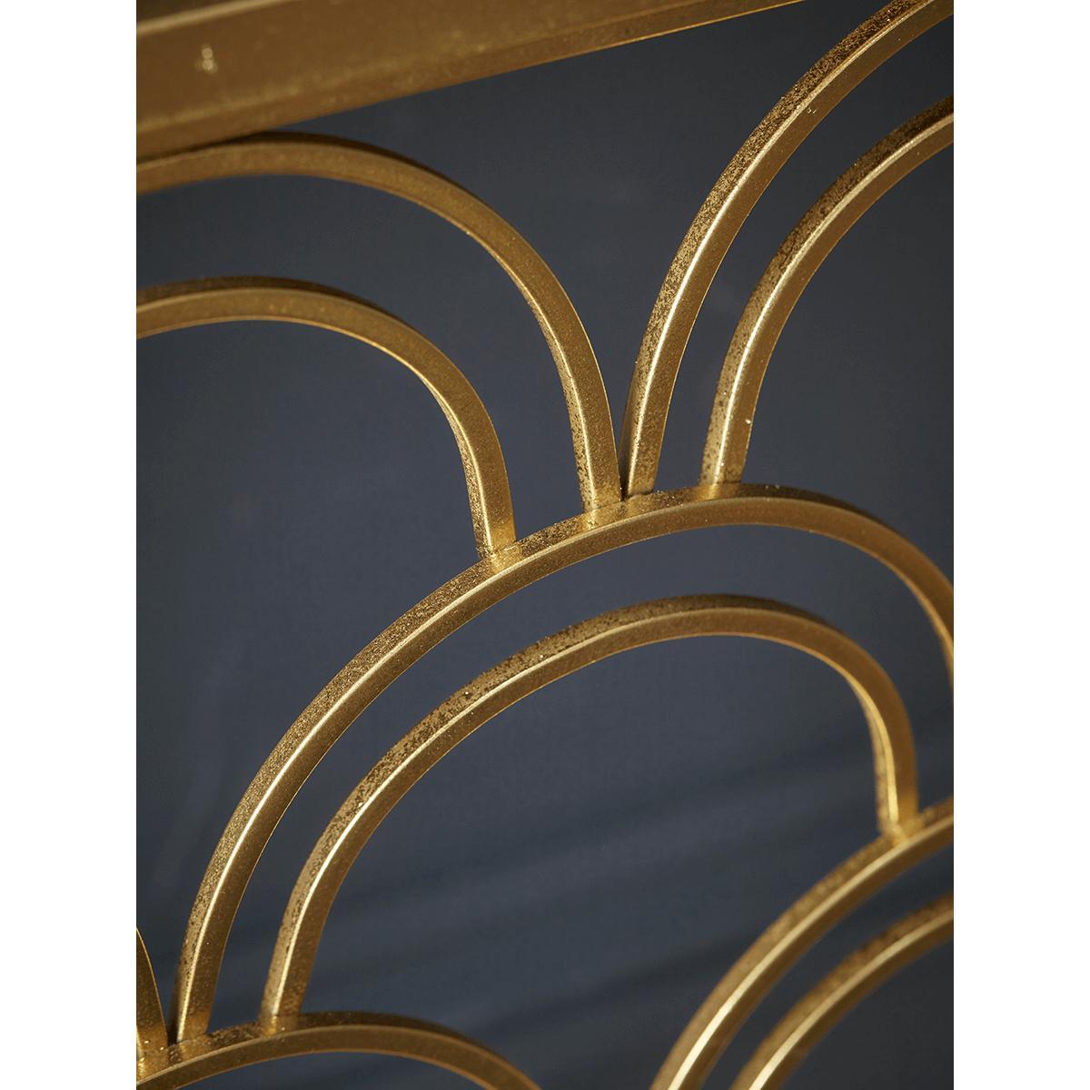 Our Slim Arch Console Table, crafted from iron with a gold finish, is perfect the piece for creating a focal point in your hall or dining room. Handsomely displaying Art Deco principles with a shaped metal decorative front panel, and a mirrored glass top, our console delivers on glamour, but with a refined sophistication.