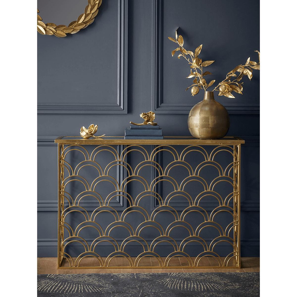 I’m a fan of this slim arch console for its effortless blend of structure and shine - the repeated scalloped arches bring Art Deco flair without feeling over-the-top. It works brilliantly in hallways or behind a sofa in contemporary, modern-classic or even eclectic schemes, especially against a moody wall colour or deep teal. Styling tip: keep the surface uncluttered - try a round mirror or an angular lamp above, a small stack of coffee-table books and a single sculptural vase. The open metalwork lets rugs or wallpaper peek through, so layer in a textured runner underneath to tie the look together.