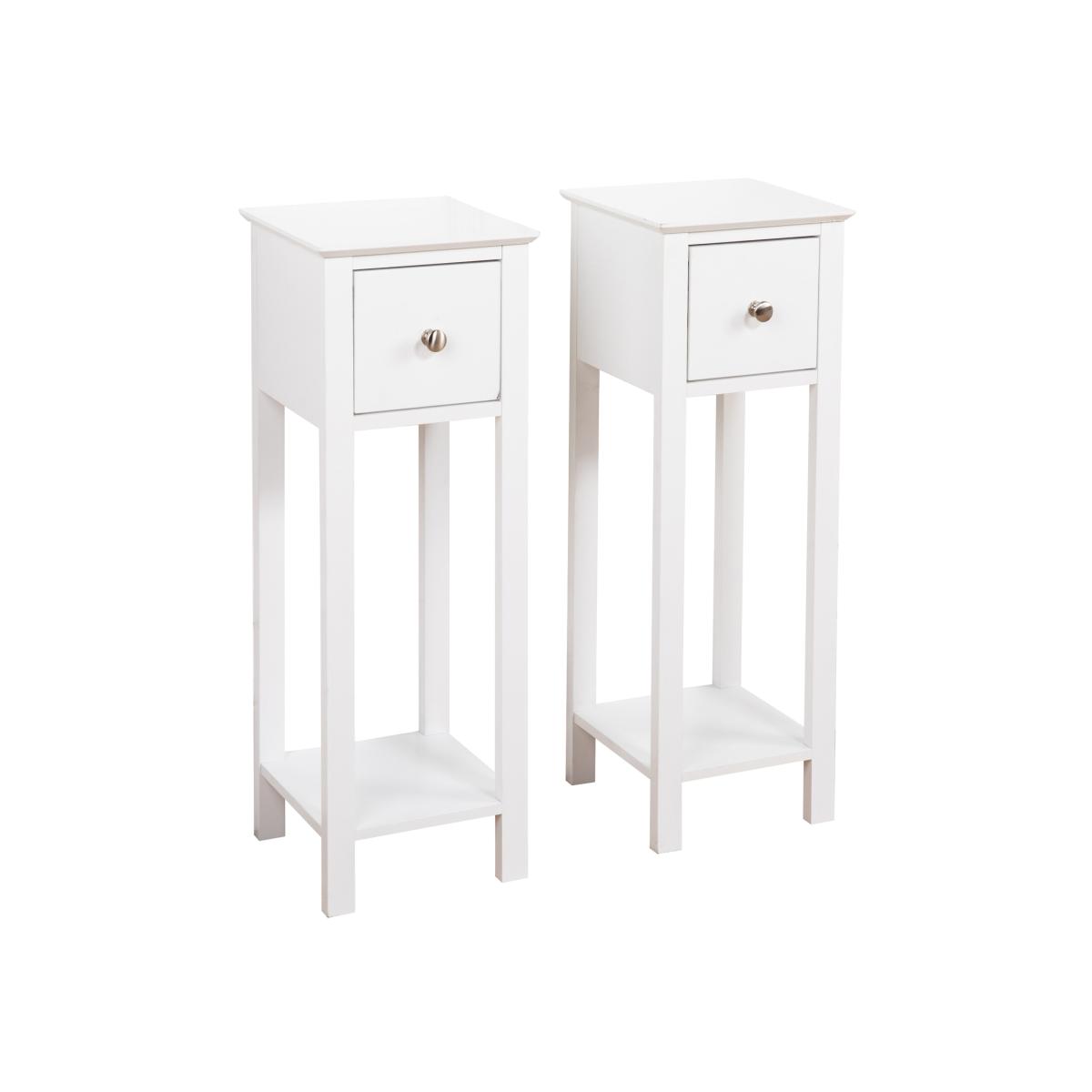 Transform your living space with this elegant pair of slim bedside tables in pristine white. Each table features a practical single drawer with a stylish brushed nickel knob, perfect for storing small essentials. The tall, slender design makes these tables ideal for narrow spaces whilst maximising vertical storage. The clean lines and classic white finish complement any decor style, from modern minimalist to traditional. A convenient lower shelf provides additional display space for books or decorative items. These versatile tables work beautifully as nightstands, end tables, or accent pieces in hallways and living rooms. Their compact footprint and thoughtful proportions make them particularly suitable for smaller rooms where space is at a premium, without compromising on style or functionality.