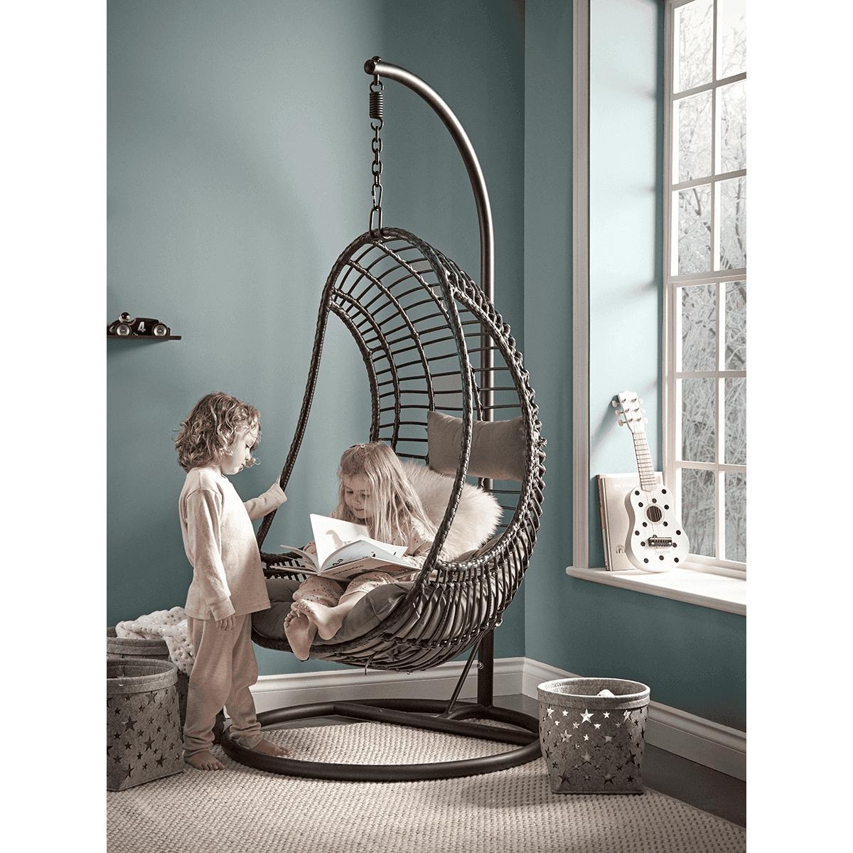 Our impressive hanging chair has a characterful cocoon egg design, made from strong metal with a durable faux rattan wrap, it’s the perfect shape in which to nestle a while. Each chair comes complete with a sumptuous seat cushion and headrest for comfort, and a gentle sway to movement for relaxing effect.