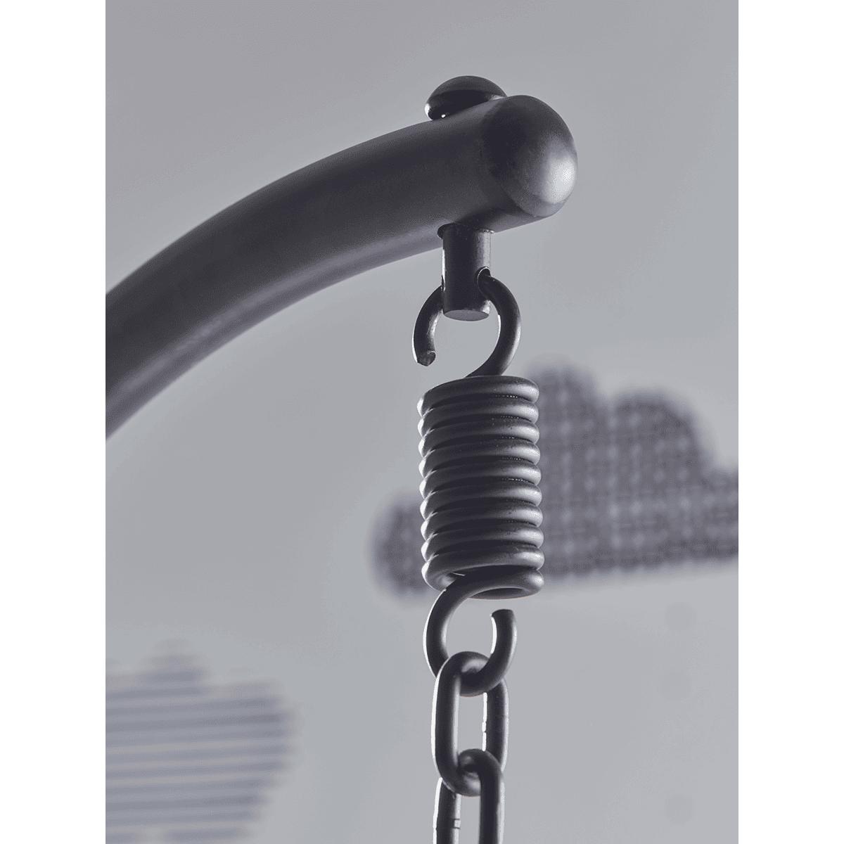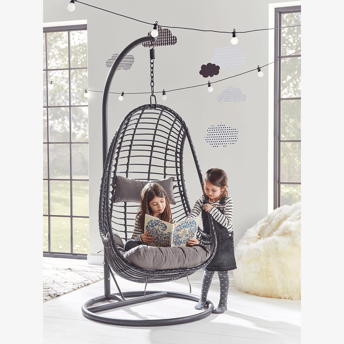 I love the slim black hanging chair for its sleek, modern design and versatility. Its pared-back aesthetic makes it a great statement piece in contemporary interiors, particularly in minimal, Scandinavian, or industrial styles. It's also very practical-perfect for adding a cosy nook in a living room, playroom, or even a trendy outdoor space. When styling, consider pairing it with neutral or contrasting cushions to enhance comfort and visual interest. It works well as a standalone feature or as part of a layered scheme with textured throws, soft rugs, or plants to soften its modern lines. Its compact size makes it ideal for creating a playful yet stylish corner in both small and spacious interiors.