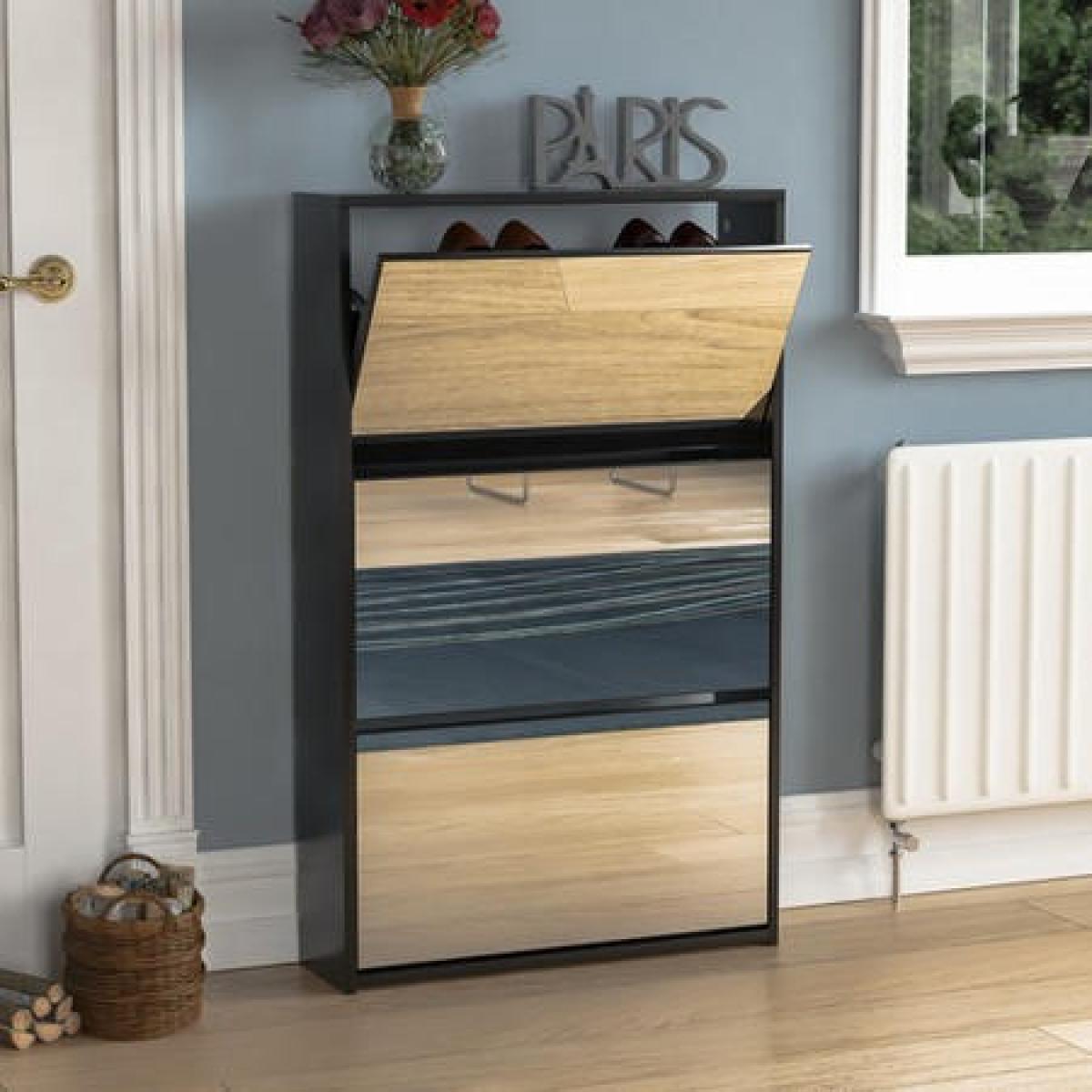 I really like this shoe cabinet for its sleek, minimalist look with mirrored doors that add a contemporary touch while helping spaces feel larger. Its slim profile makes it great for entryways and tighter hallways, where storage is needed without clutter. The mirrored doors are practical for a quick check before heading out, and the mix of wood and black framing allows it to work well in modern, Scandinavian, or urban interiors. For styling, pair it with understated accessories and keep the surrounding area clutter-free to maintain its clean aesthetic. It works particularly well in homes that favour functional furniture with a streamlined appearance.