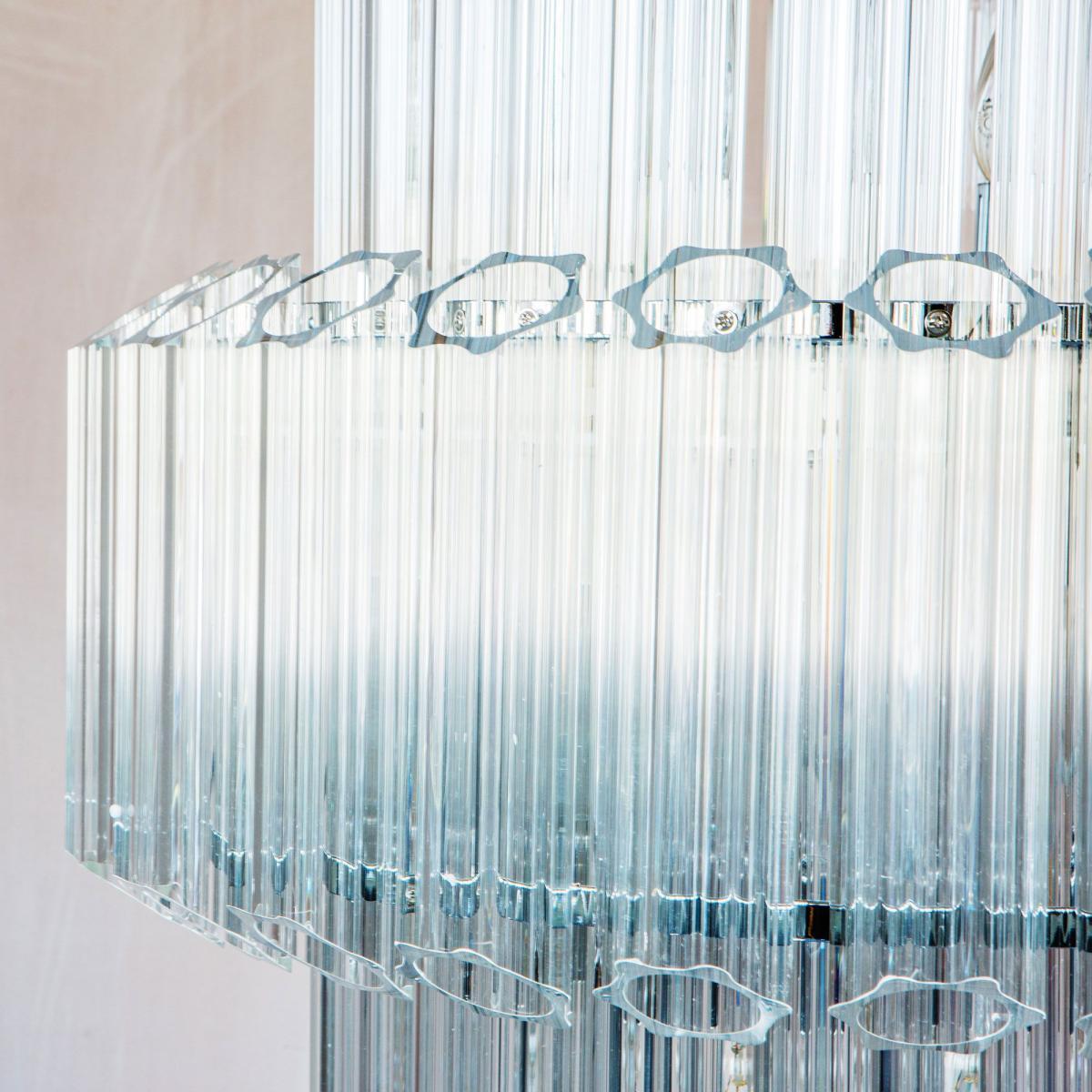 An art deco-inspired chandelier crafted from iron and glass with a tiered tubular design featuring thirteen light bulbs. An eye-catching addition to any hallway or sitting room.