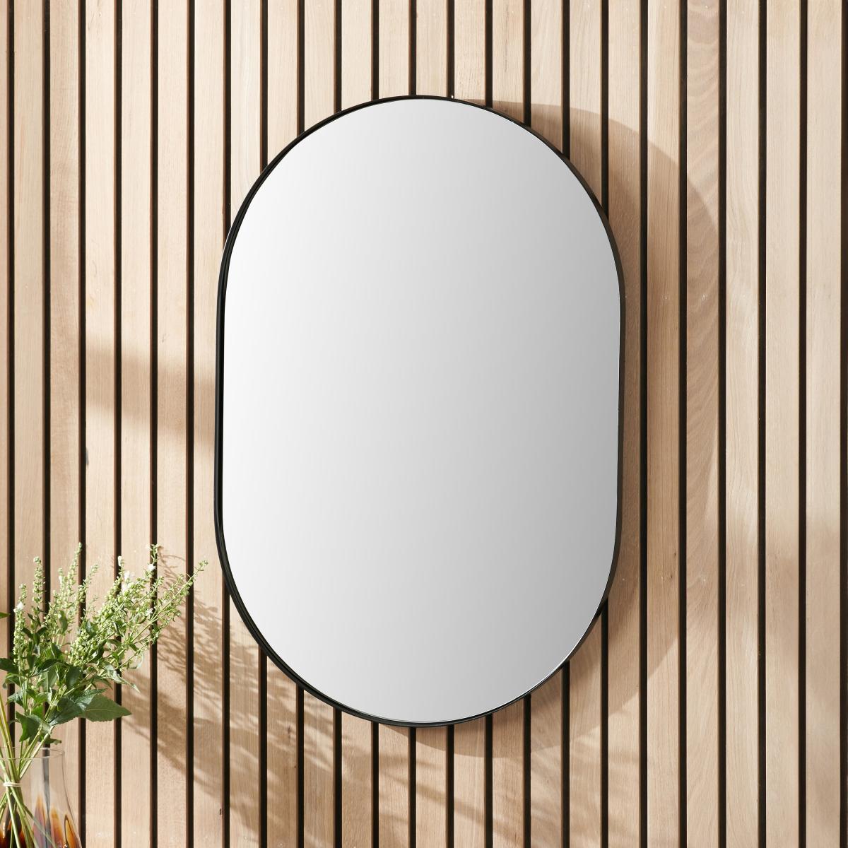 * Slim frame oval mirror* Easy to hang* Available in a choice of frame finishes Boasting a slim metal frame, This oval mirror featires a minimalist design, finished in a choice of colours. The large mirrored area and delicate styling makes this a versatile piece and the perfect addition to your home. Not suitable for bathroom use. Please Note: This mirror can be hung horizontally and hooks are pre-fitted.