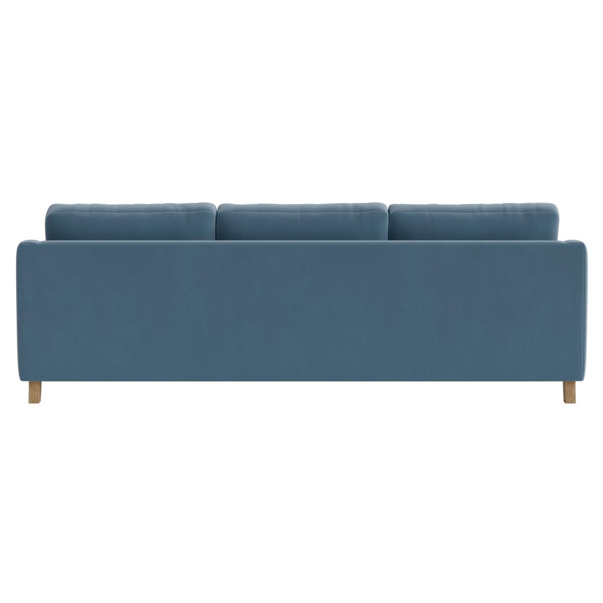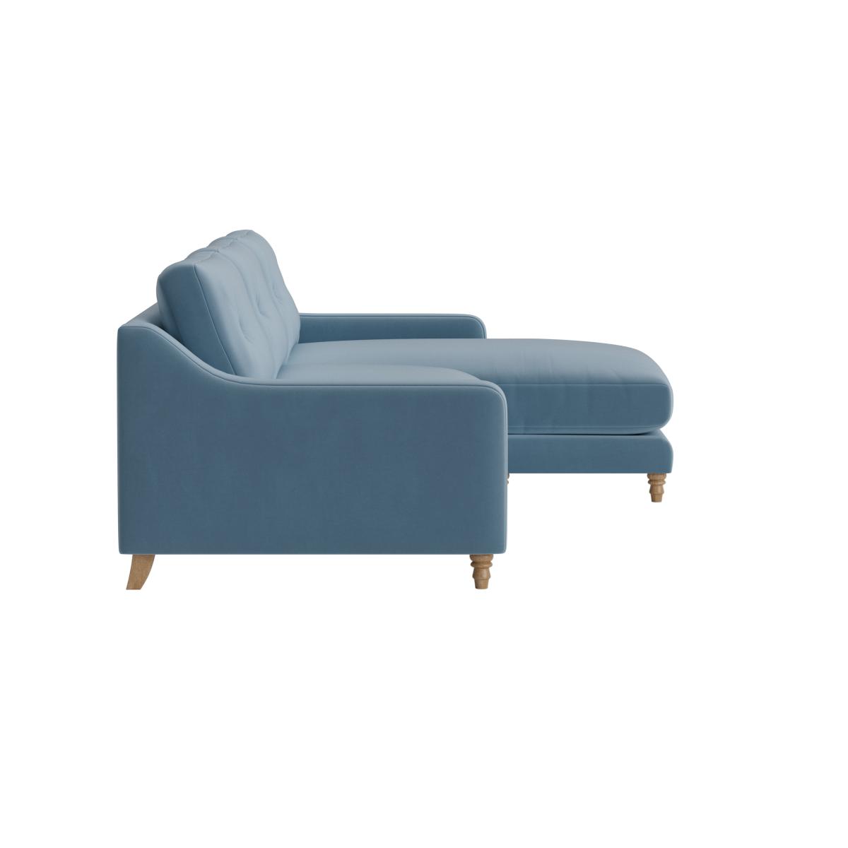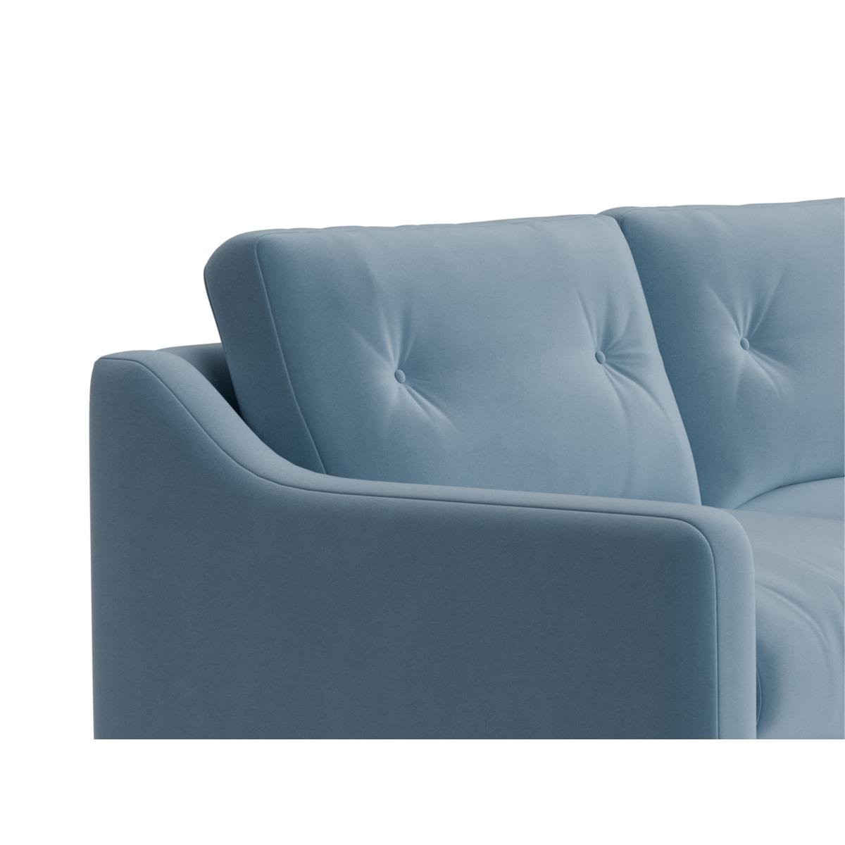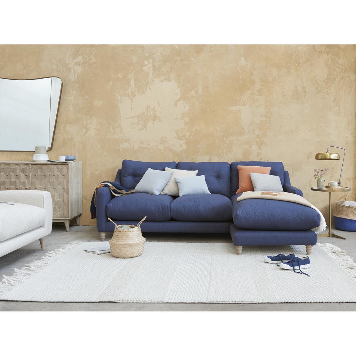 I really like this slim jim chaise as it offers a sleek, modern take on corner sofas, making it ideal for contemporary interiors or smaller spaces where you want to maximise seating without overwhelming the room. Its streamlined silhouette and subtle detailing make it versatile enough to pair with both minimalist and more eclectic styles. Practical styling tips include layering with cushions in contrasting textures or colours to add visual interest, and positioning it near a statement coffee table or accent chair to create an inviting, functional social space. The light blue hue works beautifully in neutral or pastel schemes, adding a touch of colour without dominating the room.