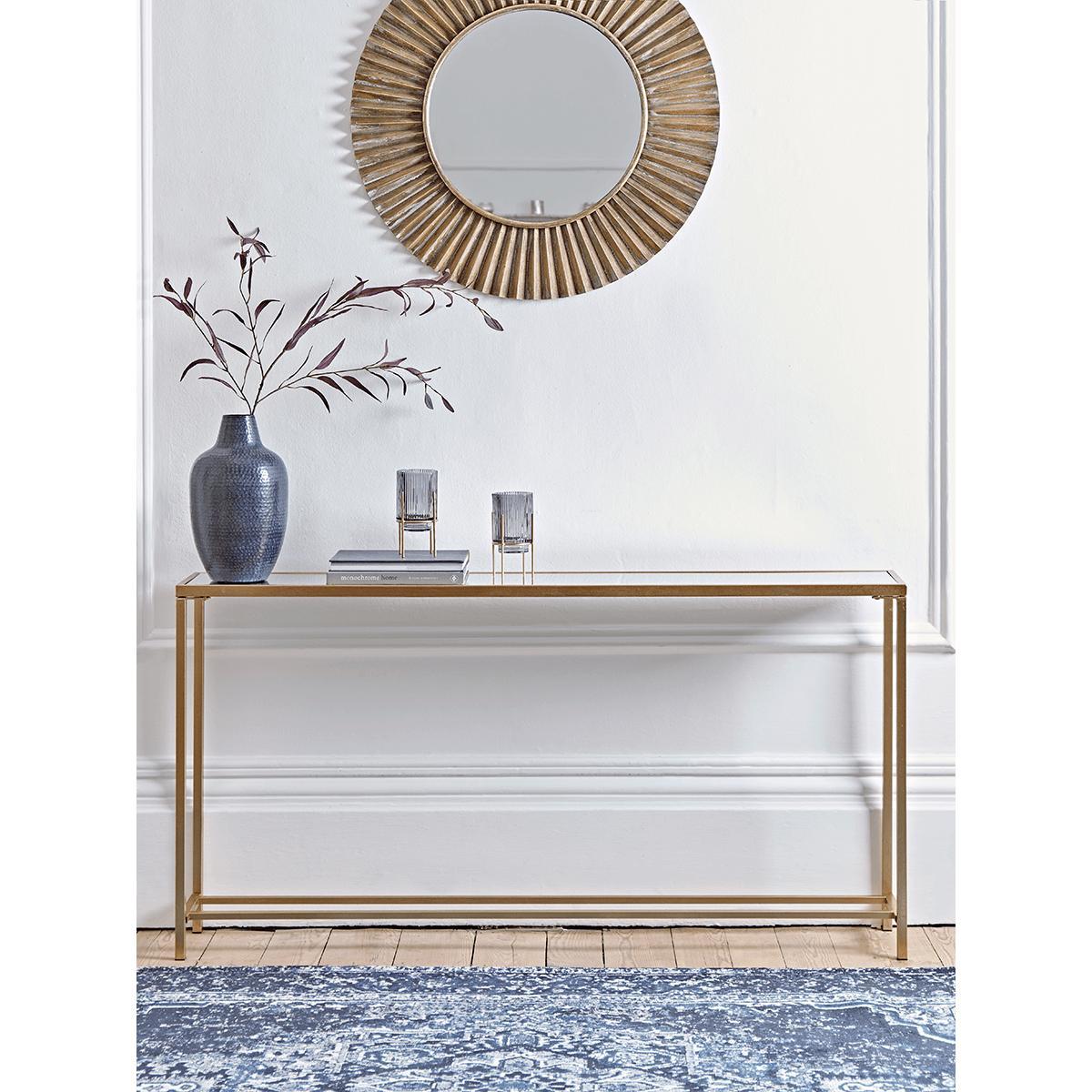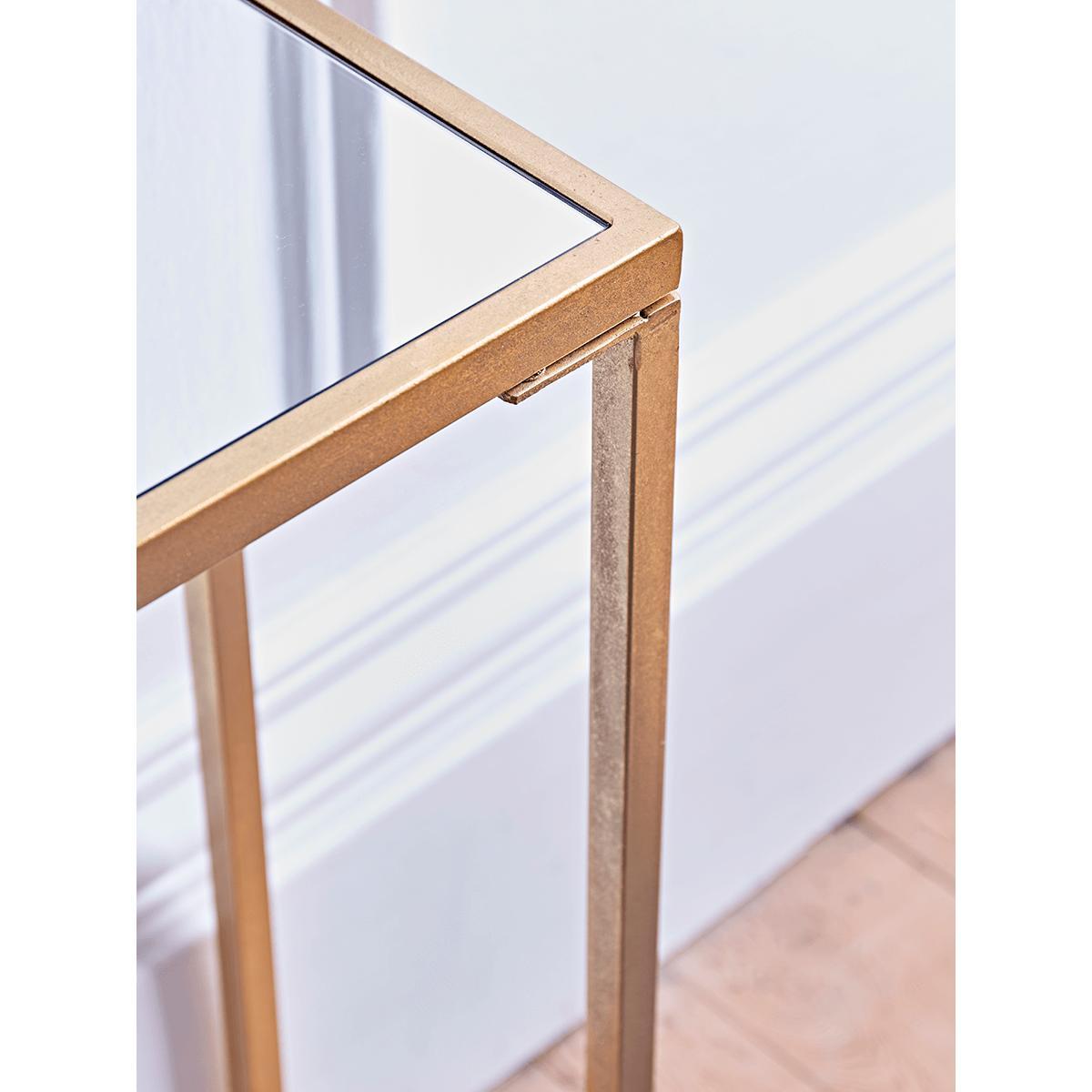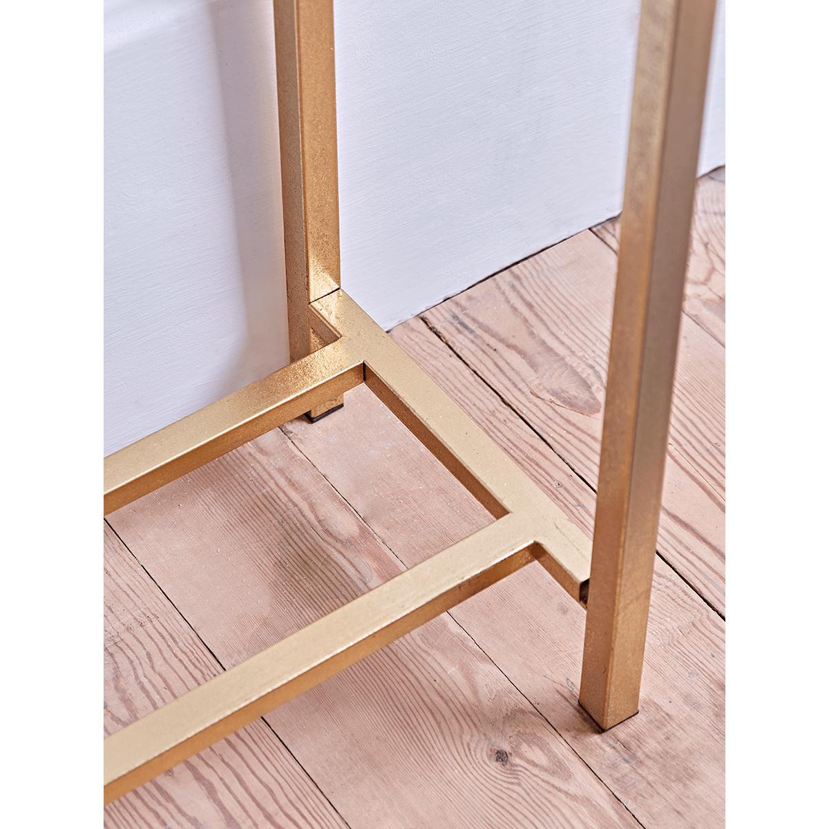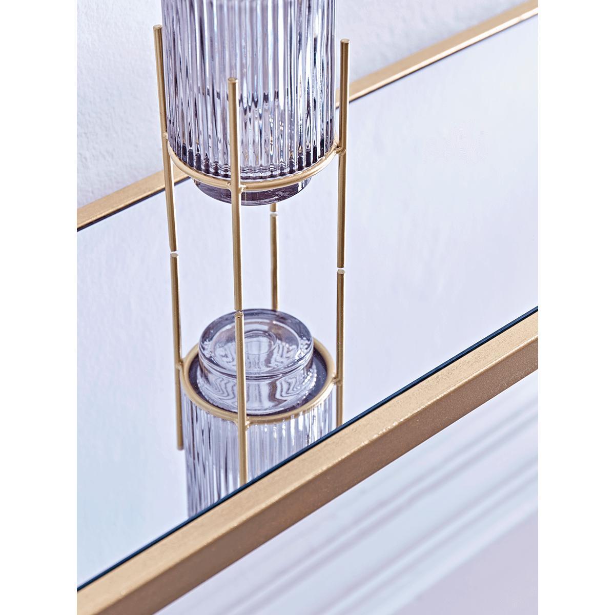 To introduce an element of Deco opulence in a subtle way our Slim Mirrored Console Table is a striking piece with a glamorous edge. Crafted from iron with a gold tone finish the form of our table is elegant and timeless. A mirrored surface top brings home the glamour and creates talking point style.