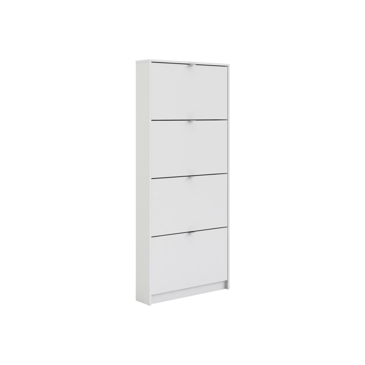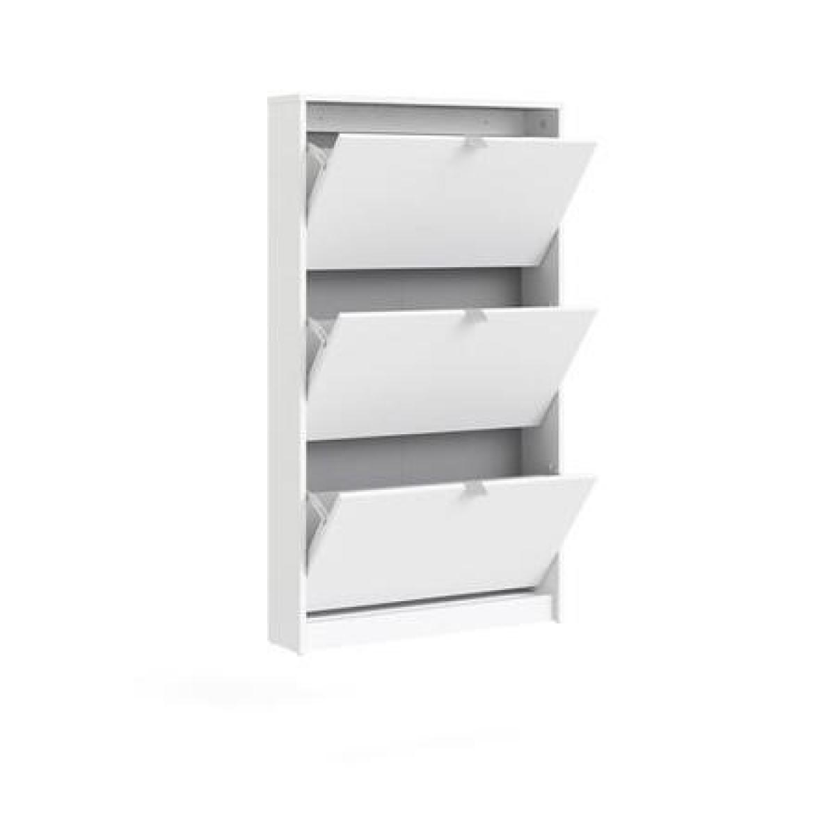 Dimensions H162 x W70.3 x D16.6 cm. The sleek design of this wall hung shoe cabinet allows for plenty of storage without dominating your hallway space. Features. This shoe cabinet features easy to open tilting doors making for an efficient storage solution for your home. Each compartment can hold up to 3 pairs of shoes Simple minimal and effective design which fits perfectly with practically any modern interior. Made from laminated board which is resistant to scratches moisture and high temperature Perfect for keeping your favourite shoes neatly by the door. High quality fixings and hinges used throughout. Assembly required..