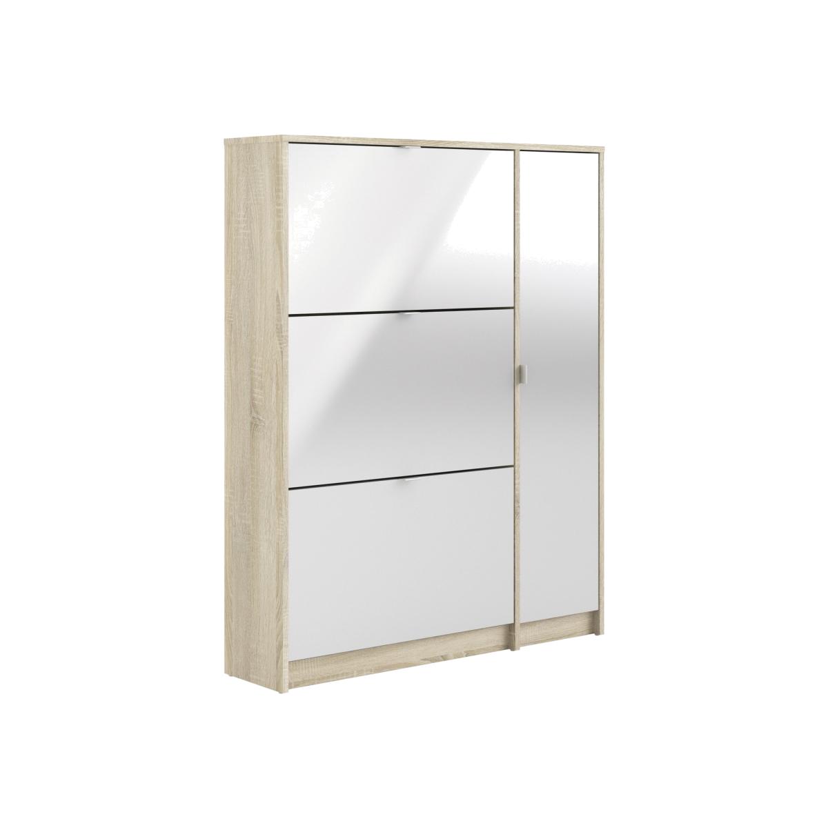 Dimensions H123.6 x W98.8 x D24.05 cm. The sleek design of this shoe cabinet allows for plenty of storage without dominating your hallway space. Features. This shoe cabinet features easy to open tilting doors making for an efficient storage solution for your home and a large cupboard space Simple minimal and effective design which fits perfectly with practically any modern interior. Made from laminated board which is resistant to scratches moisture and high temperature Perfect for keeping your favourite shoes neatly by the door. High quality fixings and hinges used throughout. Assembly required. This cabinet can hold 14 pairs of shoes..