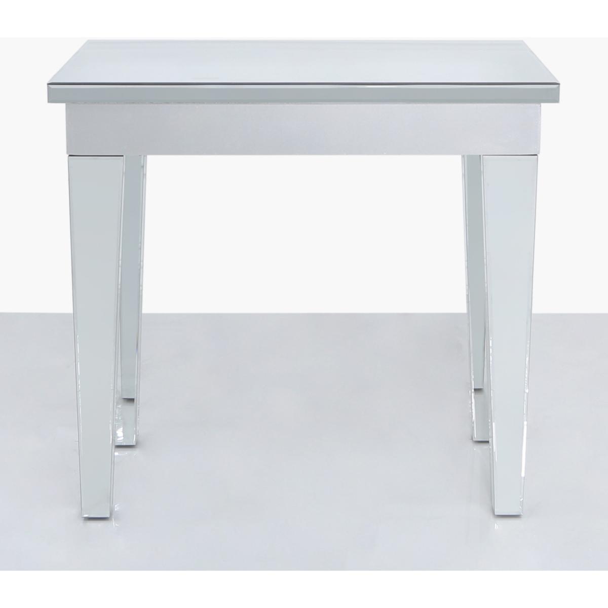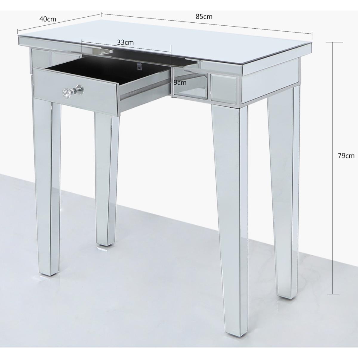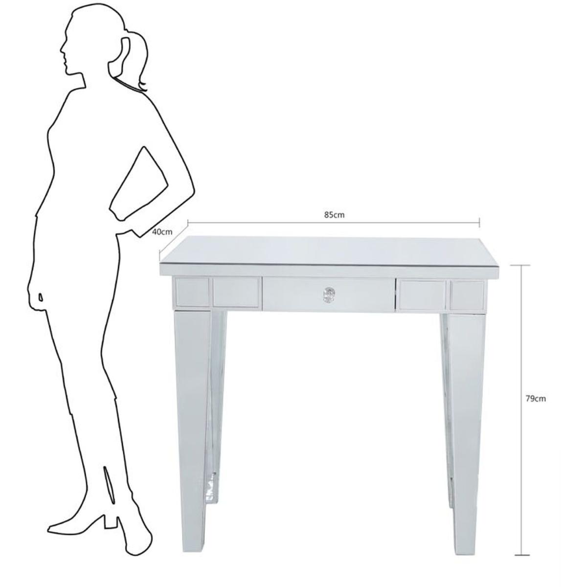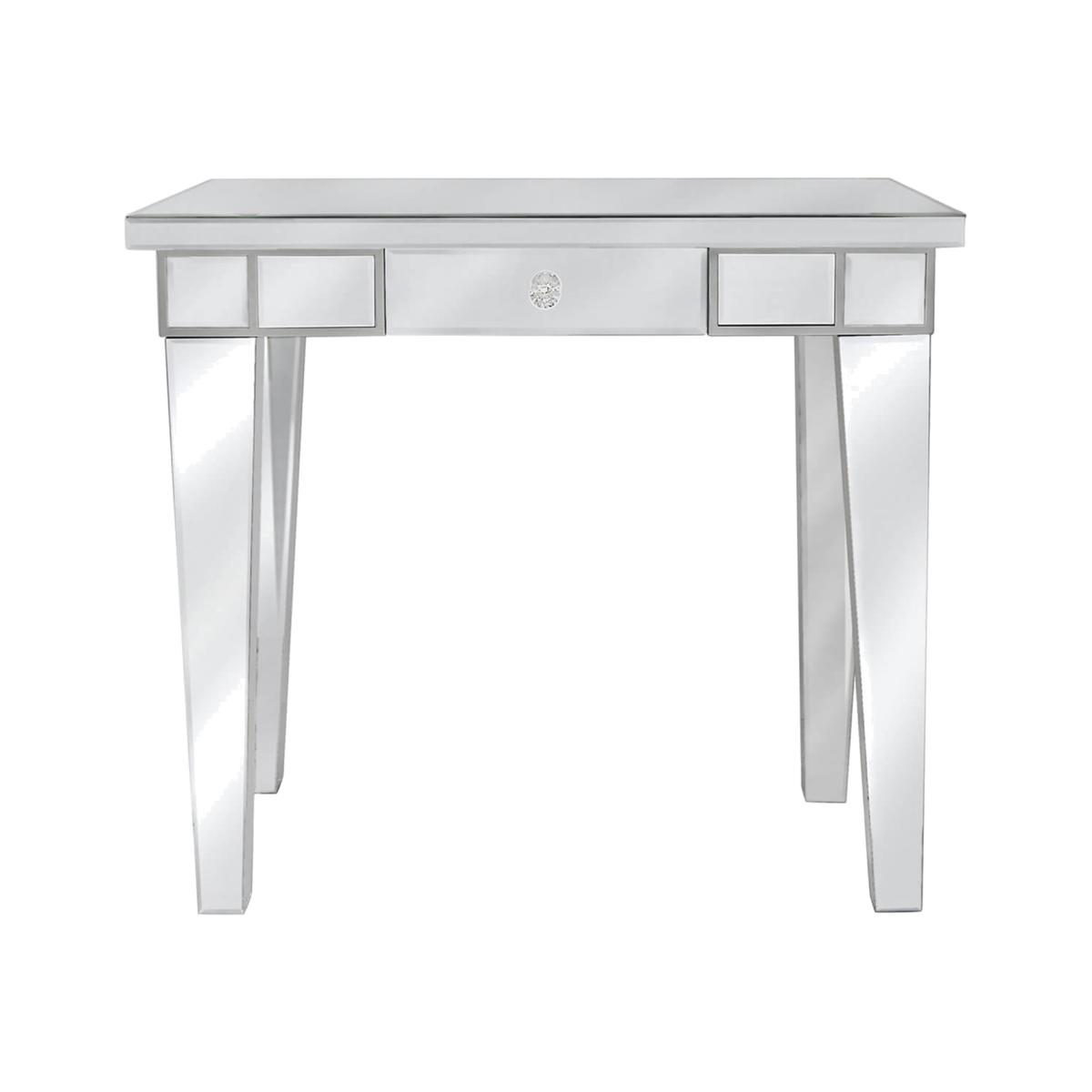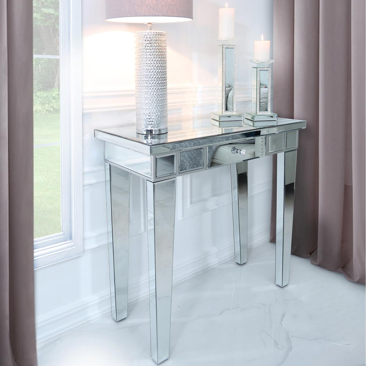 The timeless classic mirrored console table has bevelled mirror panes all over and a large draw with a crystal handle. This furniture item's versatility makes it ideal for use as a writing desk, workstation, or dining table.