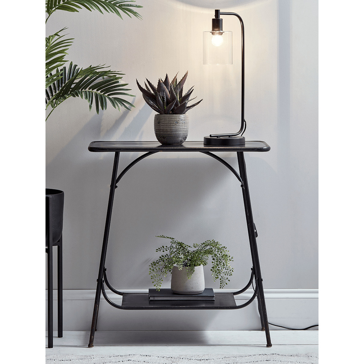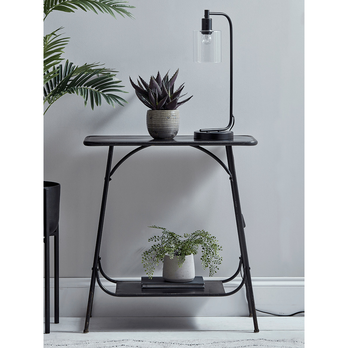 Made from black iron with a rustic, distressed finish, our industrial inspired console table will make a statement in your hallway or living area. Its slim size makes it versatile but without compromising on storage space and features a shelf along the bottom of the table.