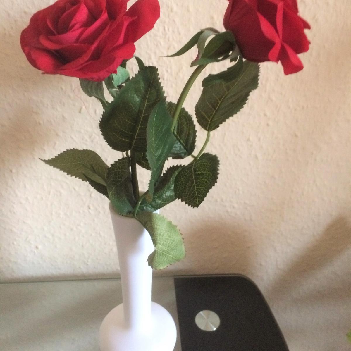 A stylish 3d printed white slimline vase complete with 2 silk red roses. Manufactured in the UK using the latest pioneering 3 printing. Ideal to give as a gift or to enhance any room setting. Suitable for artificial flowers