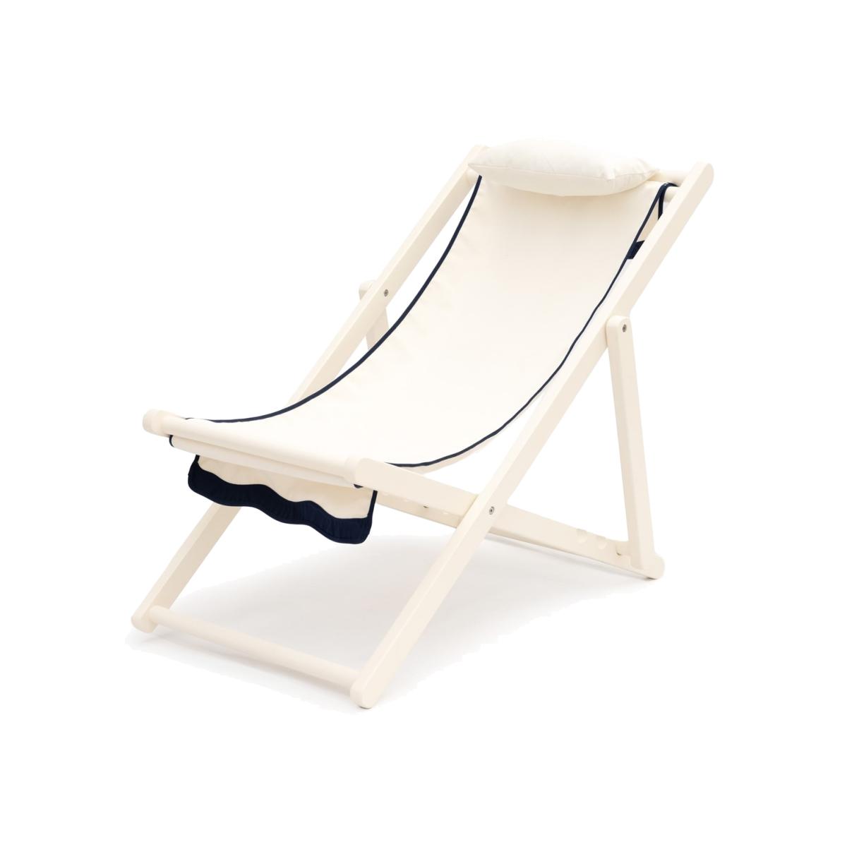 A chair restyled in Business & Pleasure Co's stunning fringe and scalloped valance. The Classic Sling chair has been made more beautiful than ever. Featuring their signature scalloped edge and lush natural cotton fringe. The sling chair adds comfort and class to any porch, beach or garden set up and still remains compact (when folded), so it's easy to set up and pack down. Ideally coupled with matching fringed umbrella